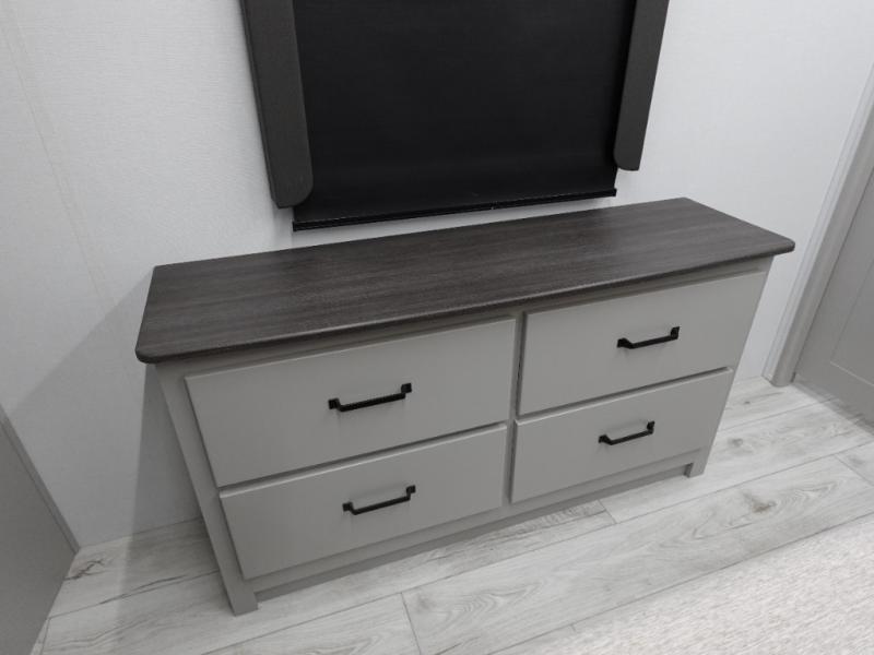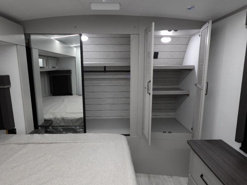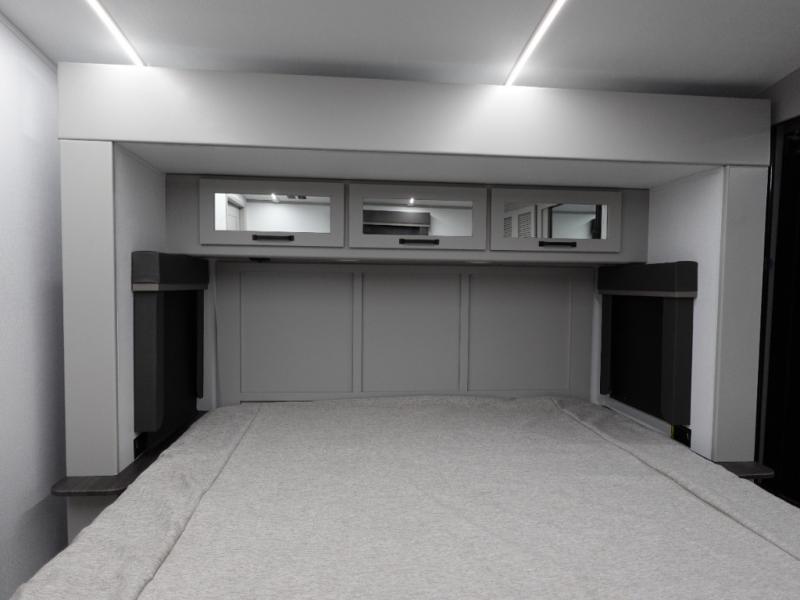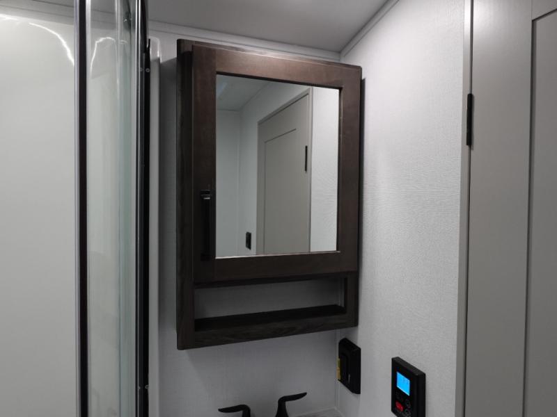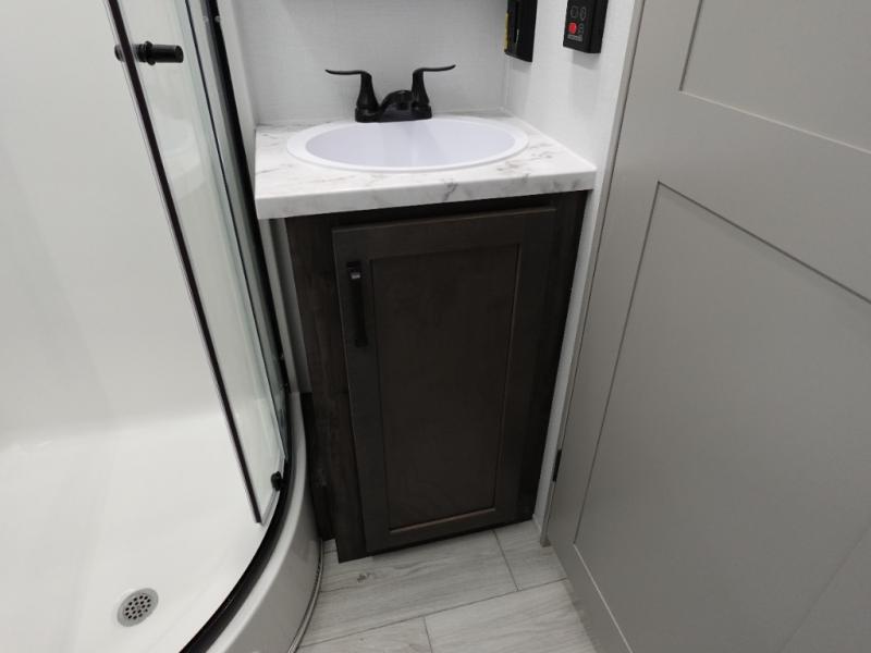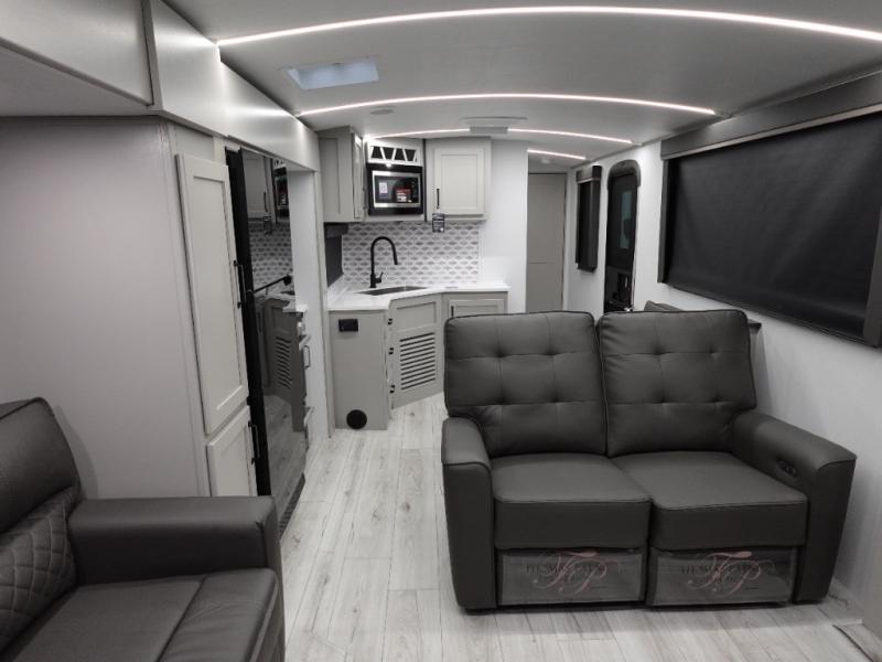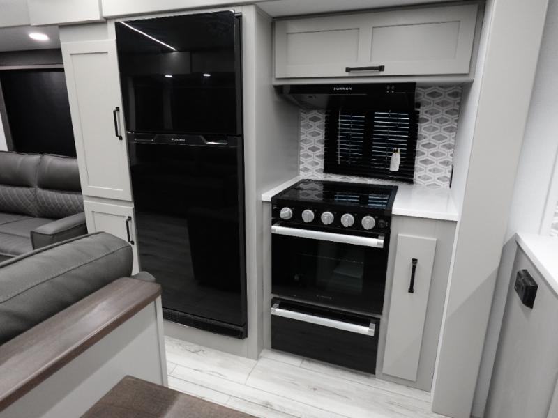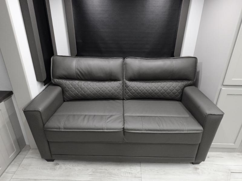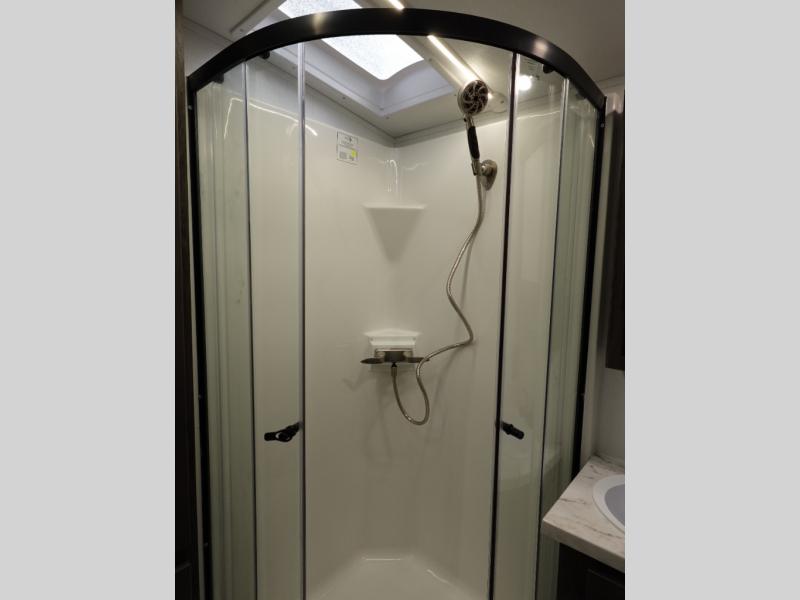 With a rear entertainment center including a 55" HDTV with fireplace below, and dual sofa sleeper slides, you will enjoy a spacious living area to visit with friends while you sit on the theater seats. The middle kitchen offers full amenities including a pantry and 10 cu. ft. refrigerator to store lots of food to feed everyone. The bench dinette seating allows you to dine or work in this area. Everyone will appreciate easy access to the double entry bathroom, especially you when it's nighttime and you are sleeping on the king bed slide out. Your family pet will have their own space, and you will find plenty of storage choices.