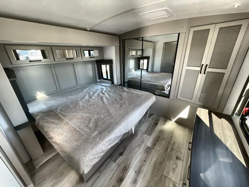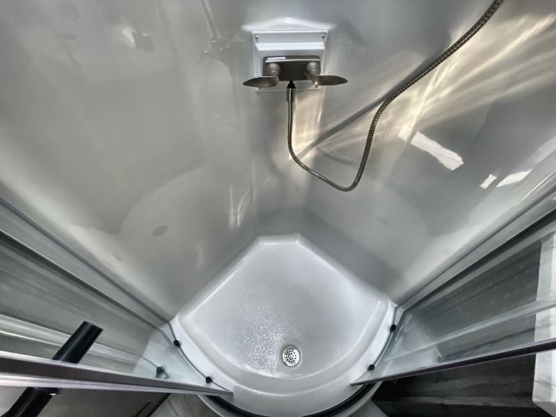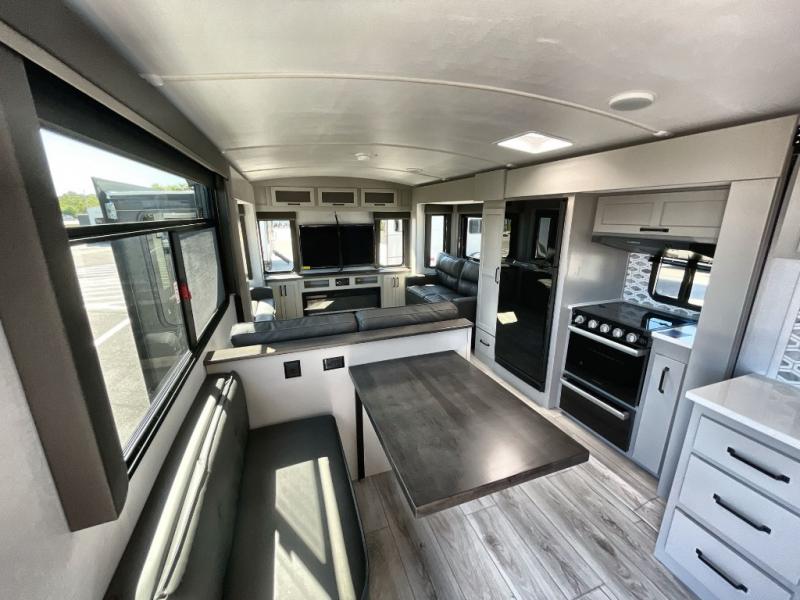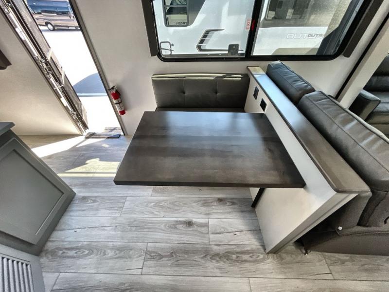 With a rear entertainment center including a 55" HDTV with fireplace below, and dual sofa sleeper slides, you will enjoy a spacious living area to visit with friends while you sit on the theater seats. The middle kitchen offers full amenities including a pantry and 10 cu. ft. refrigerator to store lots of food to feed everyone. The bench dinette seating allows you to dine or work in this area. Everyone will appreciate easy access to the double entry bathroom, especially you when it's nighttime and you are sleeping on the king bed slide out. Your family pet will have their own space, and you will find plenty of storage choices, plus there is washer/dryer prep if you want to the option to make laundry day easier.