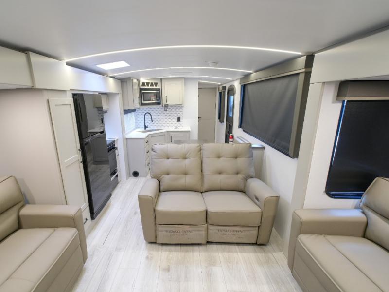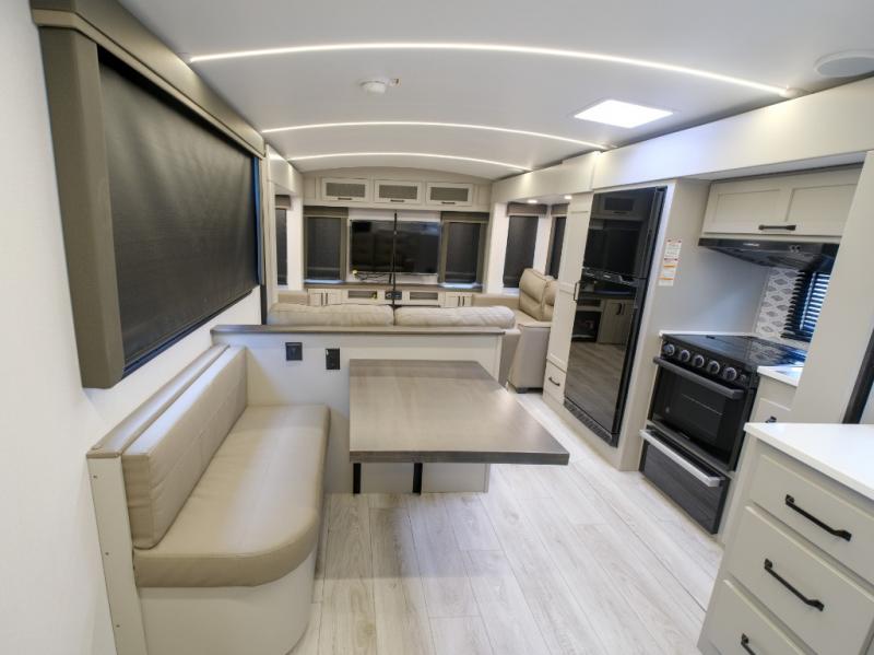 With a rear entertainment center including a 55" HDTV with fireplace below, and dual sofa sleeper slides, you will enjoy a spacious living area to visit with friends while you sit on the theater seats. The middle kitchen offers full amenities including a pantry and 10 cu. ft. refrigerator to store lots of food to feed everyone. The bench dinette seating allows you to dine or work in this area. Everyone will appreciate easy access to the double entry bathroom, especially you when it's nighttime and you are sleeping on the king bed slide out. Your family pet will have their own space, and you will find plenty of storage choices, plus there is washer/dryer prep if you want to the option to make laundry day easier.