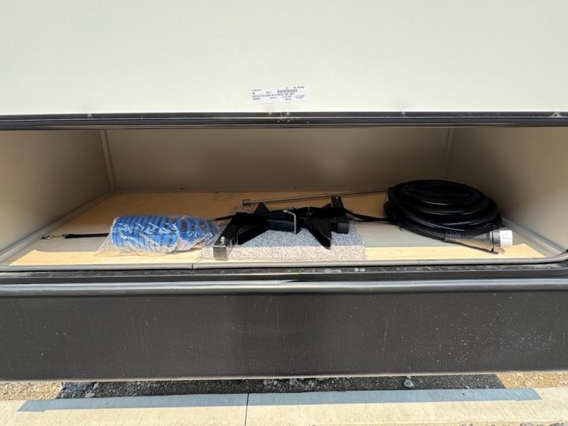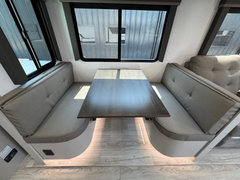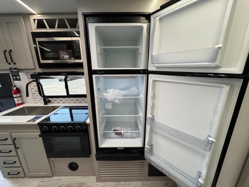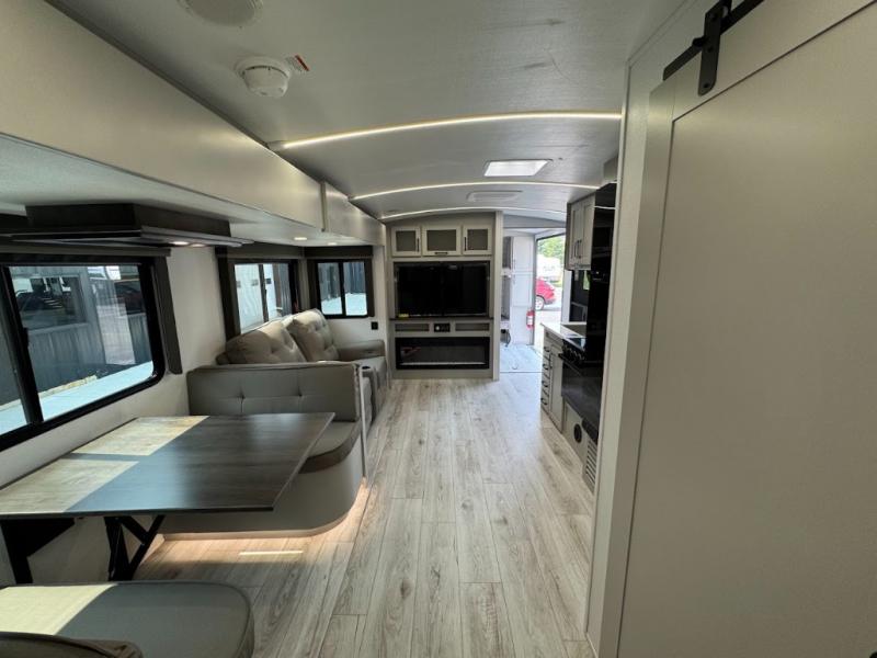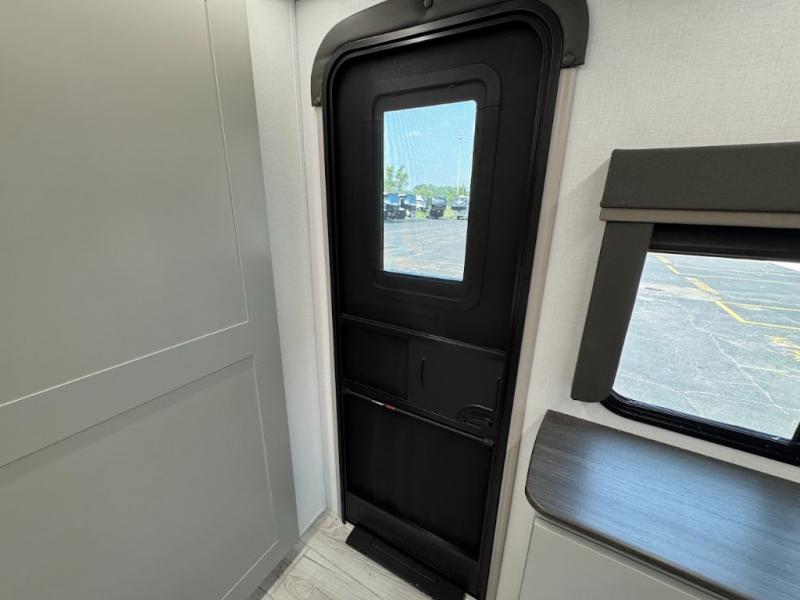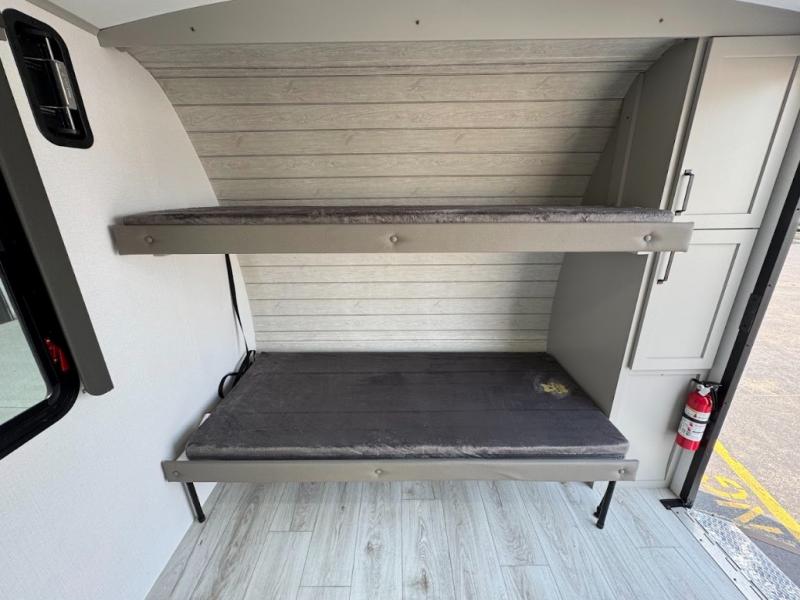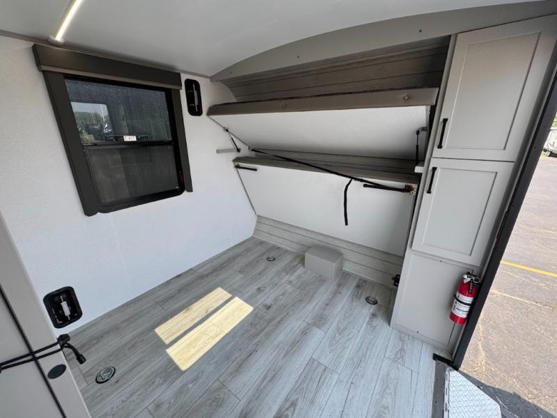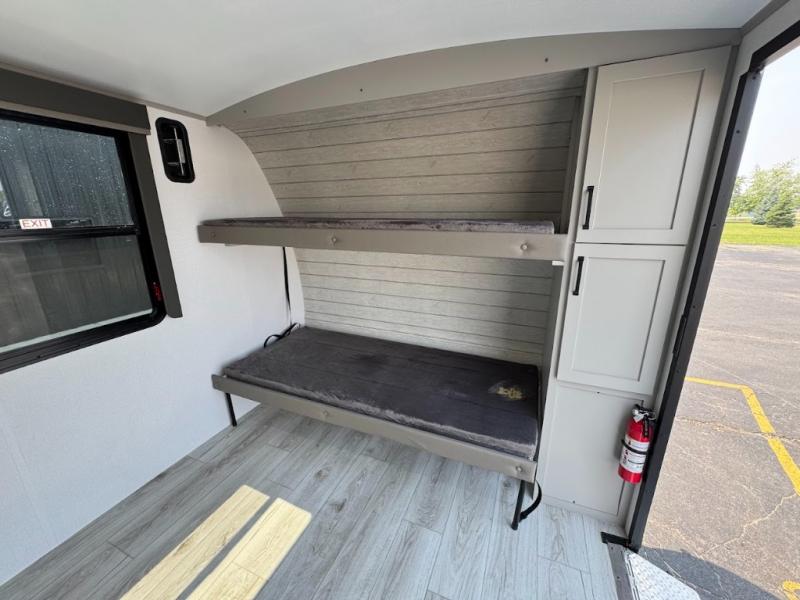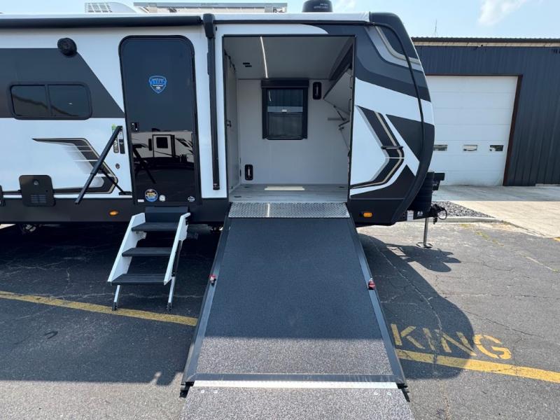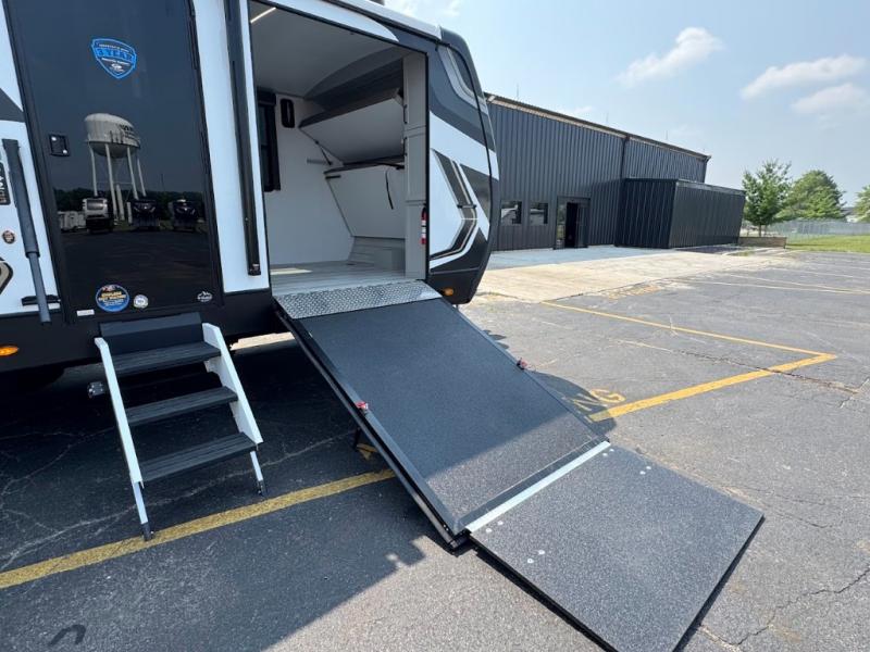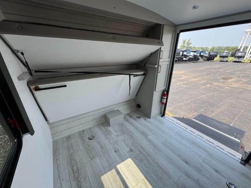 This travel trailer toy hauler allows you to load up your toys along the side using the 56" ramp door with an extension as well as allows a person in a wheelchair access inside through the front cargo garage, plus there are flip-down bunk beds, a wardrobe and a barn slider door leading into the main living and kitchen area. You will find a sofa sleeper and booth dinette slide, a 50" HDTV with a fireplace below, and full kitchen amenities for the cook to make meals, store leftovers and clean up dishes. The spacious full bathroom will keep everyone clean after the rides or hikes, and the rear master bedroom allows you to sleep like royalty while your pet has their own space in the built-in pet kennel. Having dual entry doors makes loading and unloading easy and provides a smooth flow of traffic. There are options to choose from if you would prefer a table and chairs in place of the booth dinette or theater seating in place of the sofa sleeper.