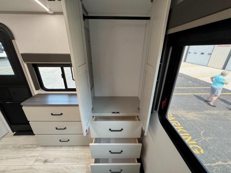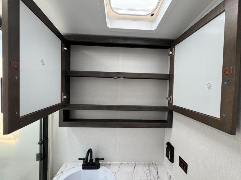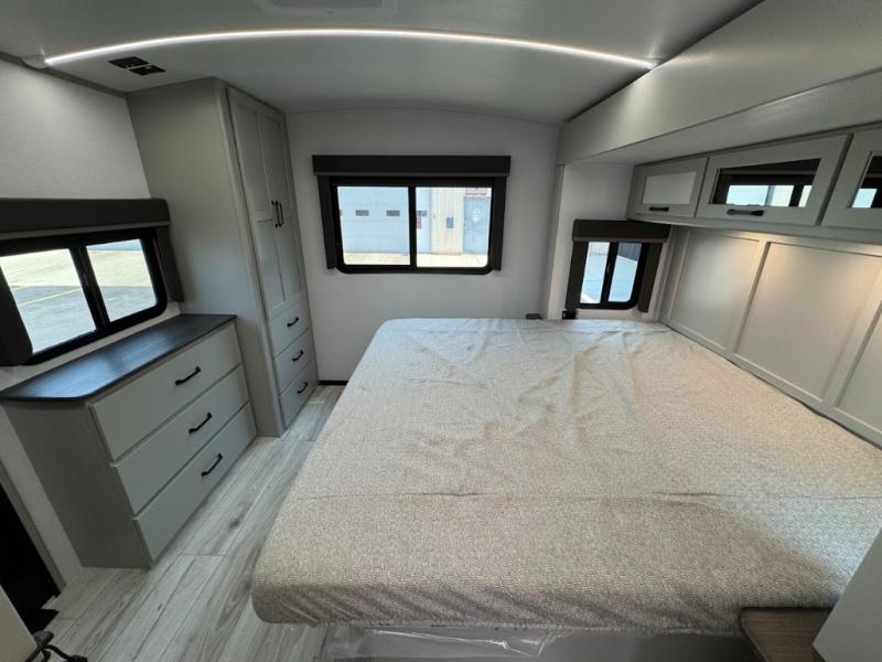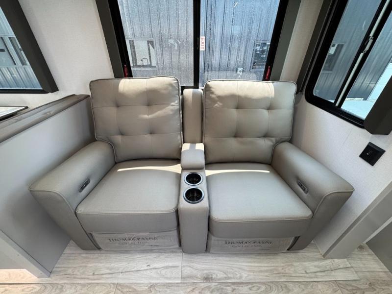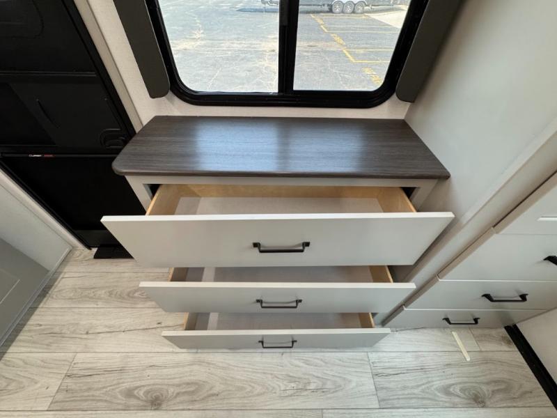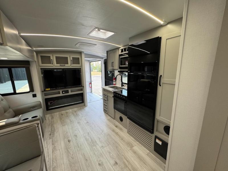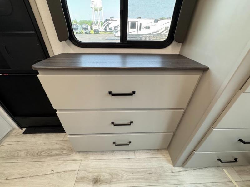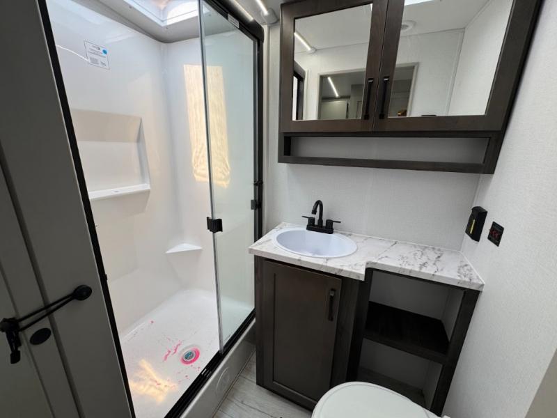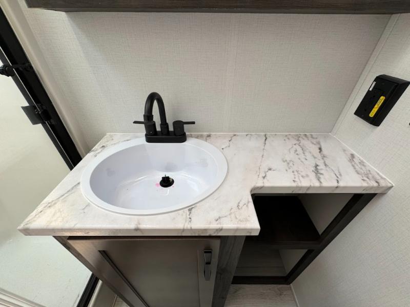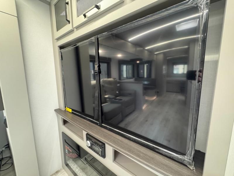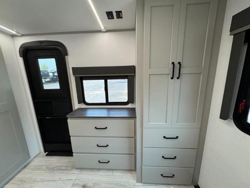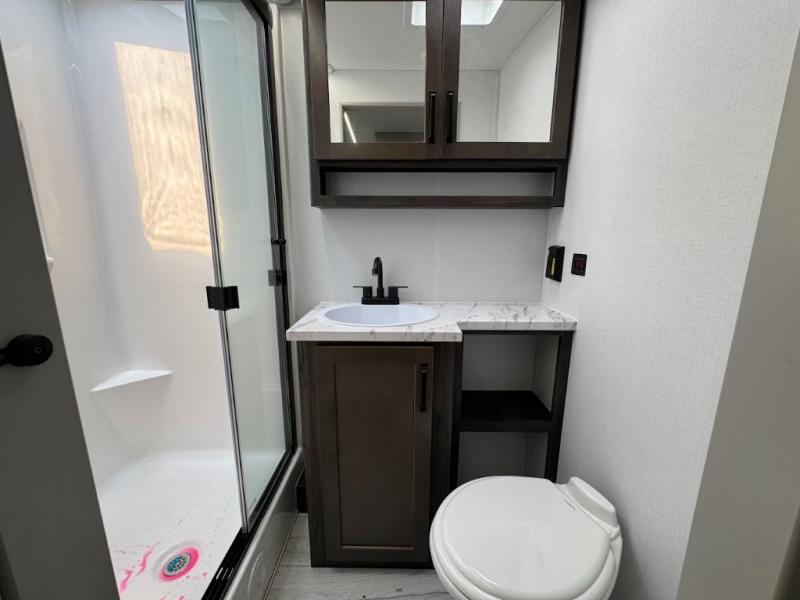 This travel trailer toy hauler allows you to load up your toys along the side using the 56" ramp door with an extension as well as allows a person in a wheelchair access inside through the front cargo garage, plus there are flip-down bunk beds, a wardrobe and a barn slider door leading into the main living and kitchen area. You will find a sofa sleeper and booth dinette slide, a 50" HDTV with a fireplace below, and full kitchen amenities for the cook to make meals, store leftovers and clean up dishes. The spacious full bathroom will keep everyone clean after the rides or hikes, and the rear master bedroom allows you to sleep like royalty while your pet has their own space in the built-in pet kennel. Having dual entry doors makes loading and unloading easy and provides a smooth flow of traffic. There are options to choose from if you would prefer a table and chairs in place of the booth dinette or theater seating in place of the sofa sleeper.