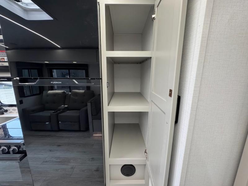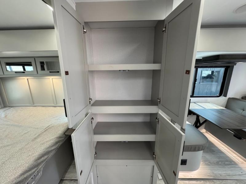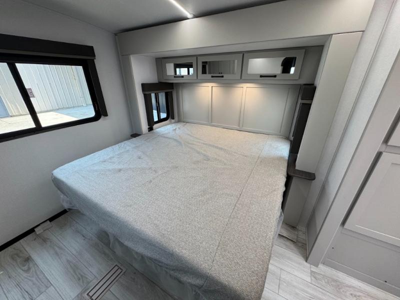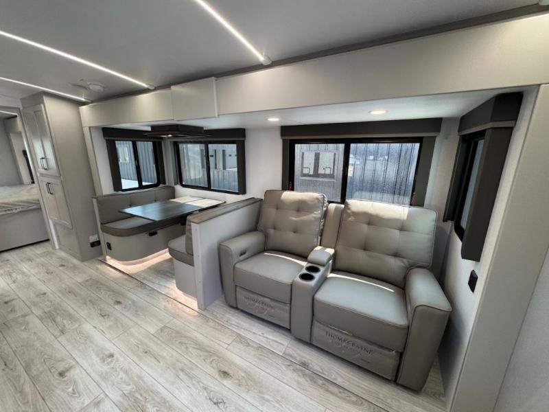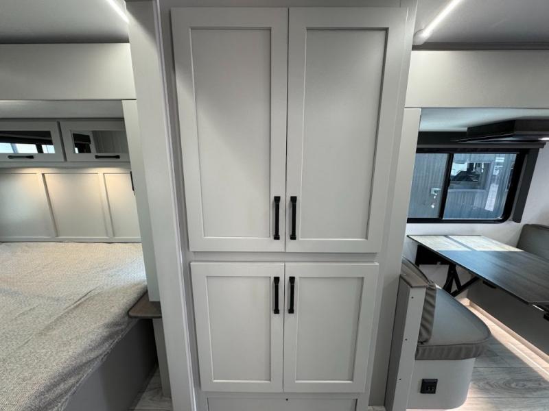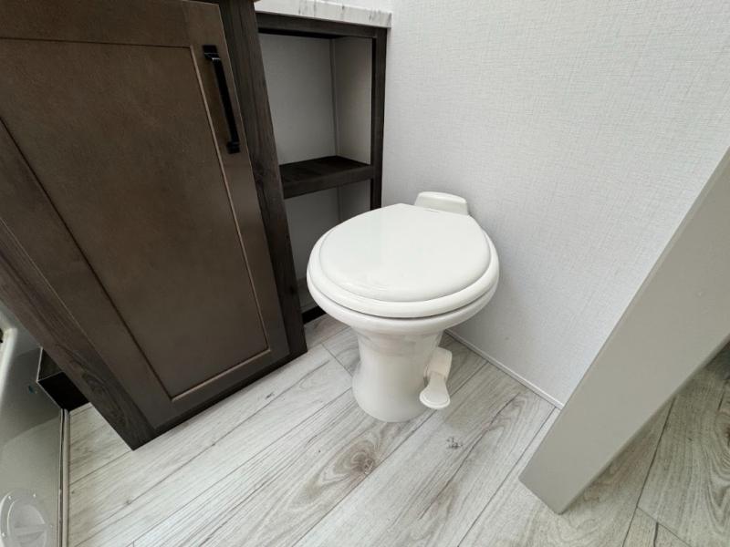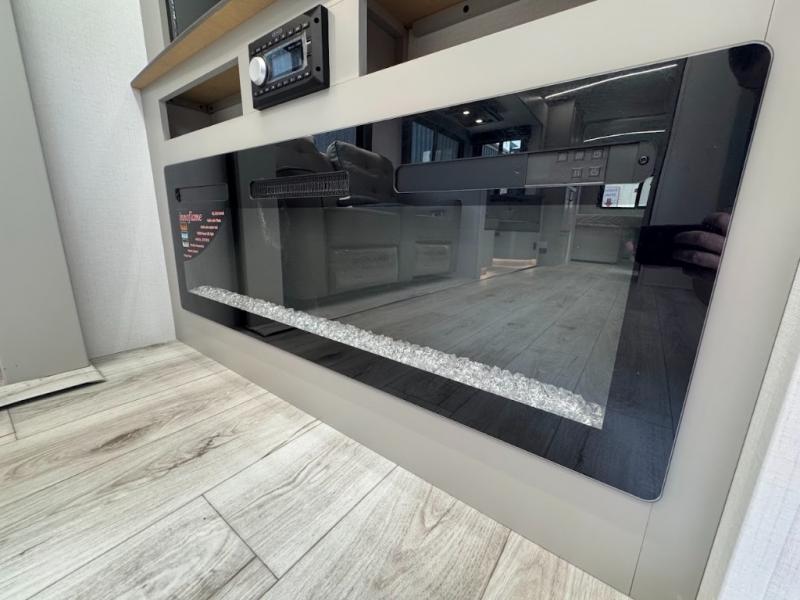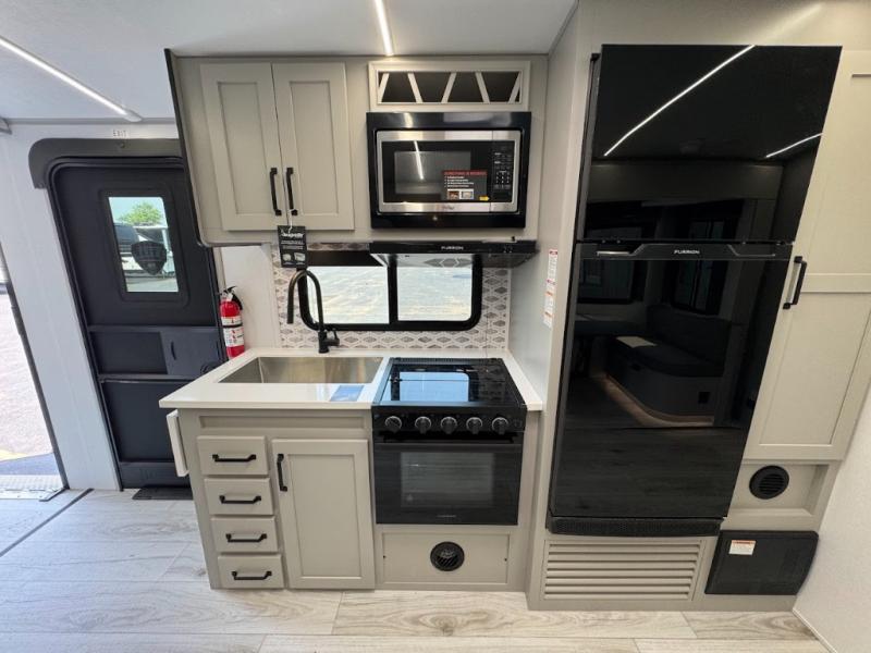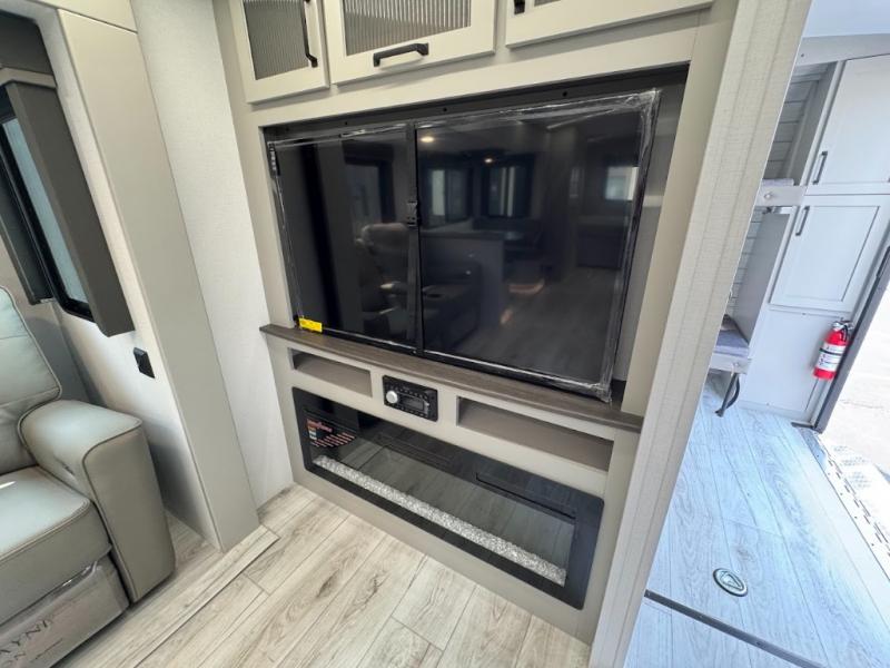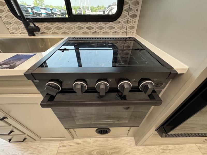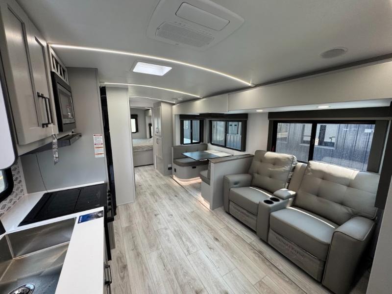 This travel trailer toy hauler allows you to load up your toys along the side using the 56" ramp door with an extension as well as allows a person in a wheelchair access inside through the front cargo garage, plus there are flip-down bunk beds, a wardrobe and a barn slider door leading into the main living and kitchen area. You will find a sofa sleeper and booth dinette slide, a 50" HDTV with a fireplace below, and full kitchen amenities for the cook to make meals, store leftovers and clean up dishes. The spacious full bathroom will keep everyone clean after the rides or hikes, and the rear master bedroom allows you to sleep like royalty while your pet has their own space in the built-in pet kennel. Having dual entry doors makes loading and unloading easy and provides a smooth flow of traffic. There are options to choose from if you would prefer a table and chairs in place of the booth dinette or theater seating in place of the sofa sleeper.