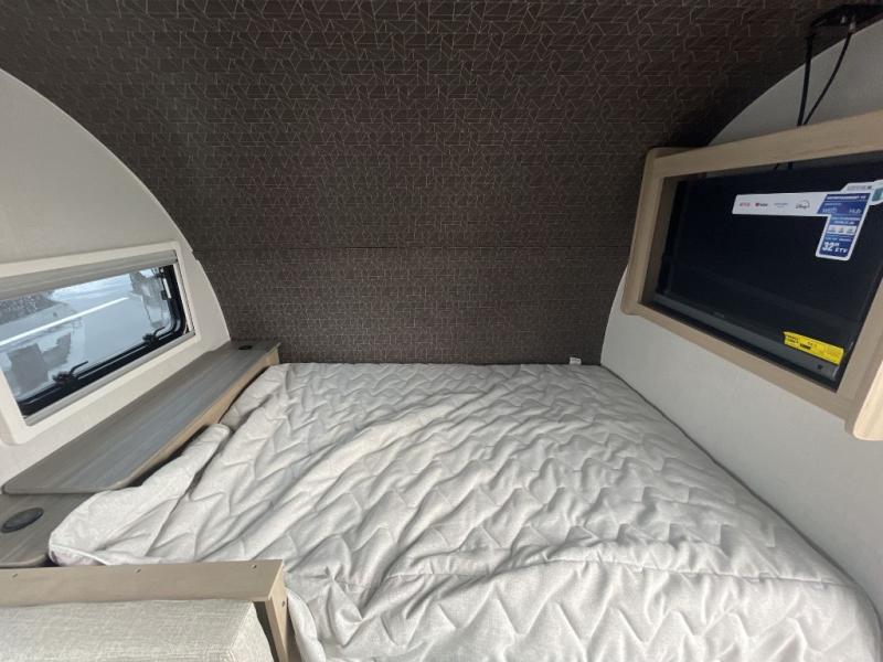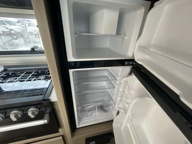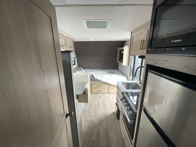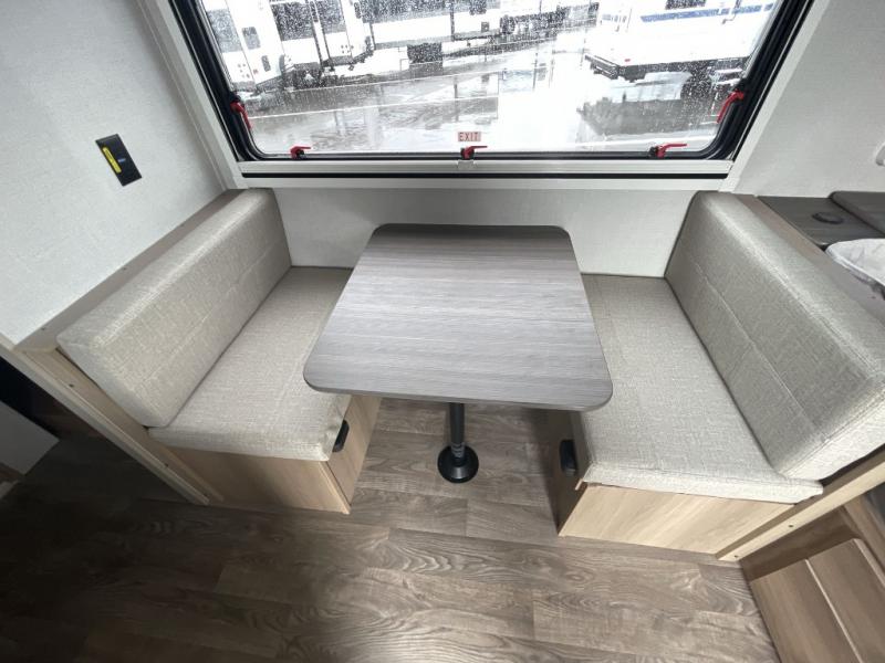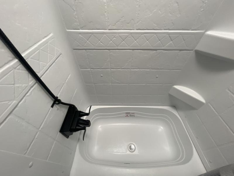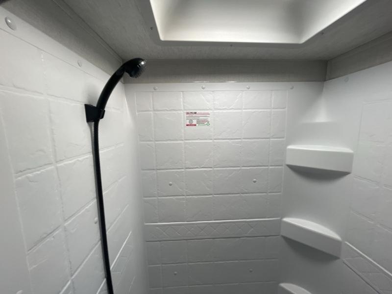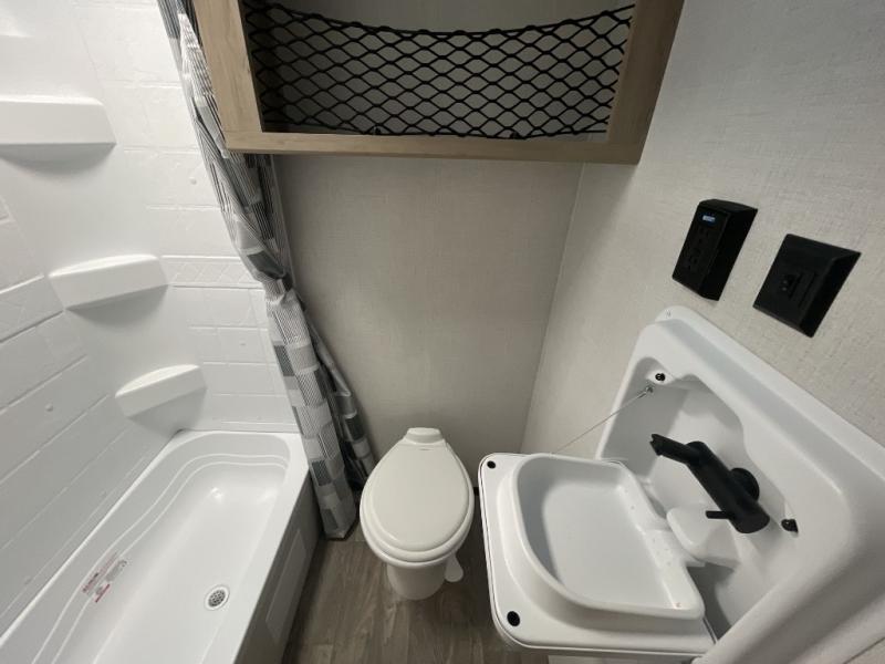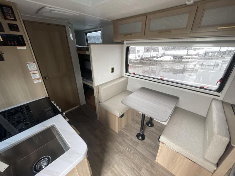 Travel to your favorite campgrounds with this stylish, compact, yet rugged trailer built for four or five campers! A full bed up front features drawers beneath for your clothing, plus there is a storage shelf above. With the 32" HDTV on the wall at the foot of the bed you can easily catch a move before you fall asleep or it can easily be viewed from the comfort of the booth dinette. Two more campers will enjoy the set of 26" x 74" bunk beds along the roadside back corner with flip-up bottom bunk for easy storage beneath. The opposite rear corner houses your private shower and toilet so you can skip the campground facilities! Cooking will be super convenient with a three-burner cooktop, a sink for cleaning up, and there is also a microwave located above the 12V refrigerator for your perishables. On the outside, a 14' awning provides added living space where you can set up your camp chairs and be protected from the sun and rain. There is also a ladder in back and a convenience center up front.