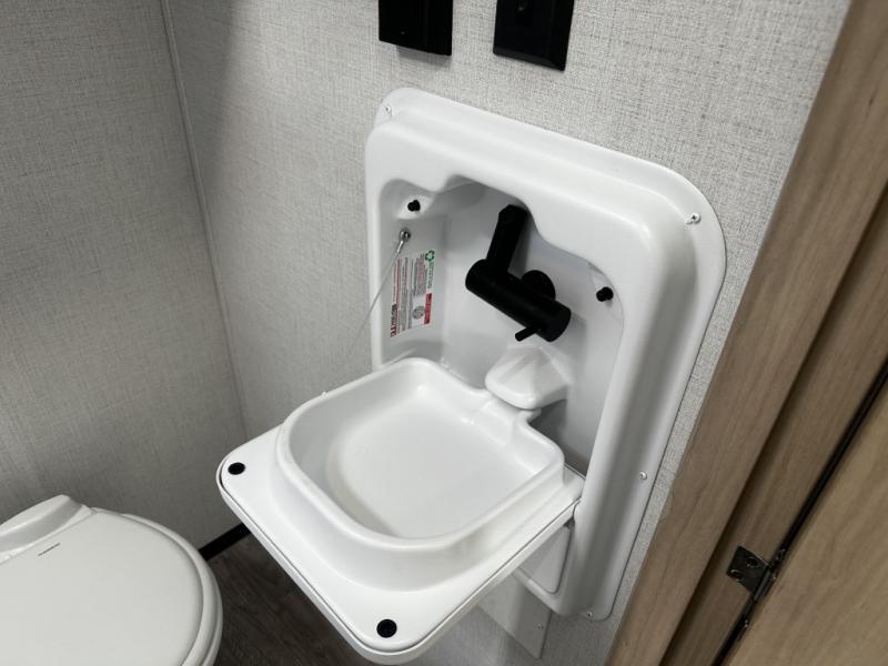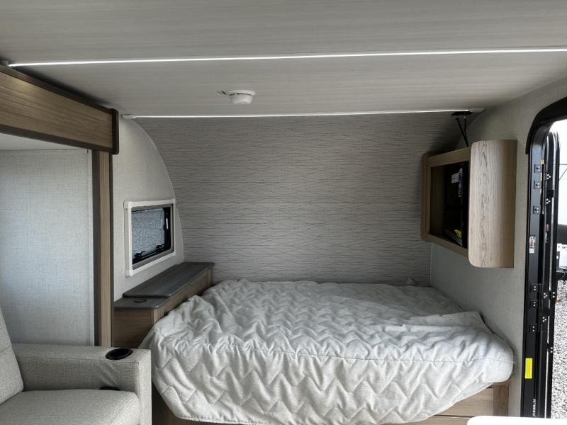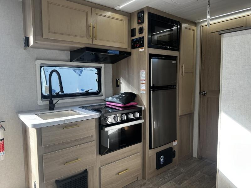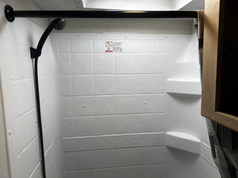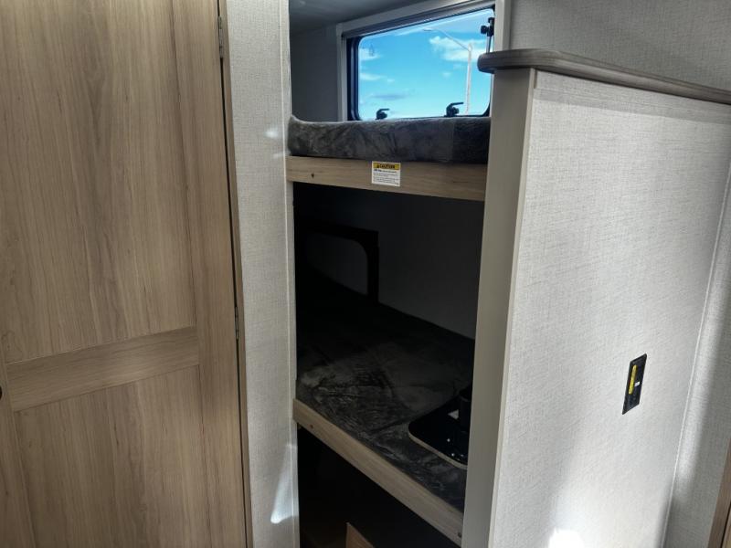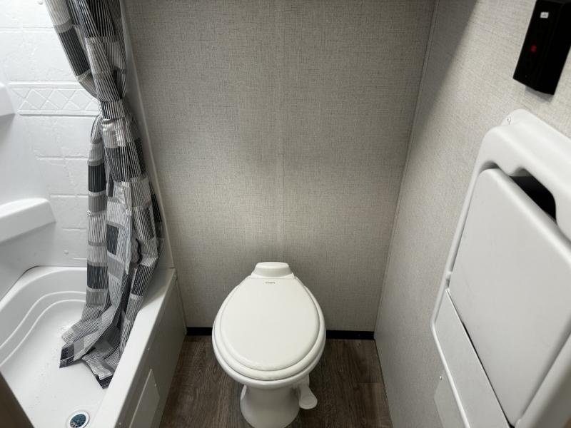 Camping will be an adventure for five or six campers featuring a single slide for added space. A full bed up front features drawers beneath for your clothing, plus there is a storage shelf above. With the 32" HDTV on the wall at the foot of the bed you can easily catch a move before you fall asleep or it can easily be viewed from the comfort of the booth dinette slide. Two more campers will enjoy the set of 26" x 74" bunk beds along the roadside back corner with flip-up bottom bunk for easy storage beneath. The opposite rear corner houses your private shower and toilet so you can skip the campground facilities! Cooking will be super convenient with a three-burner cooktop, a sink for cleaning up, and there is also a microwave located above the 12V 5.50 cu. ft. refrigerator for your perishables. On the outside, a 14' awning provides added living space where you can set up your camp chairs and be protected from the sun and rain. There is also a ladder in back and a convenience center up front.
