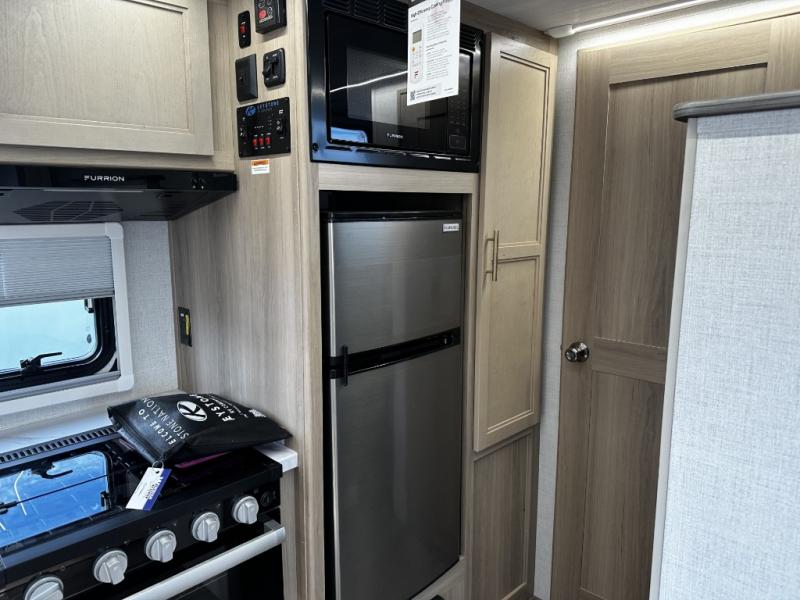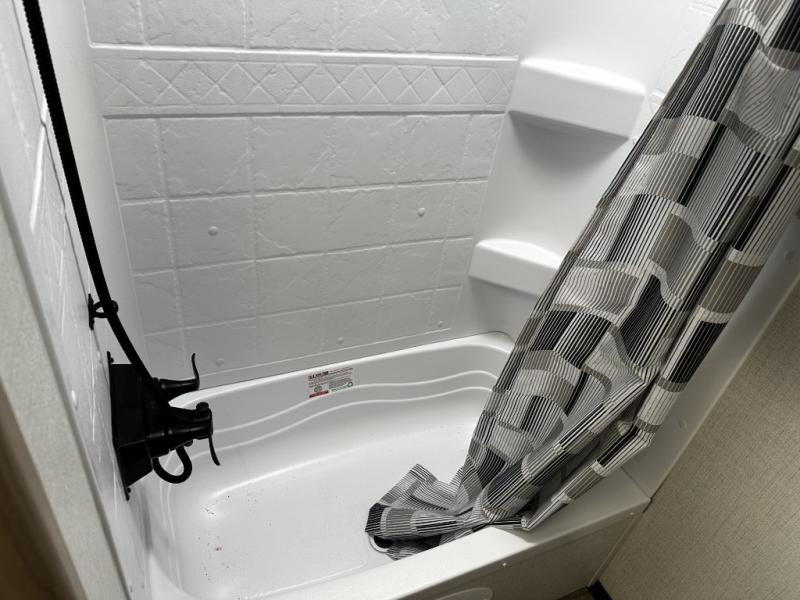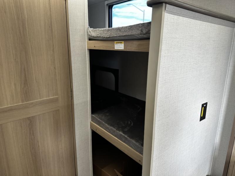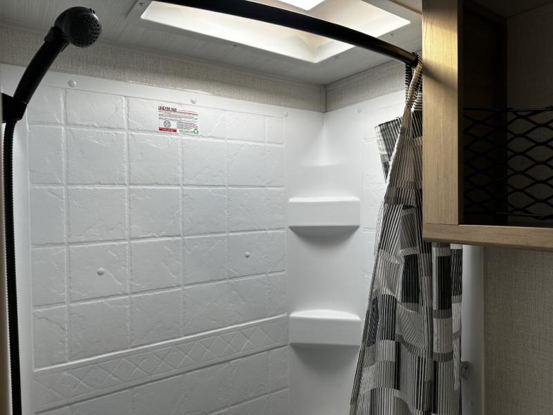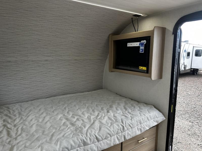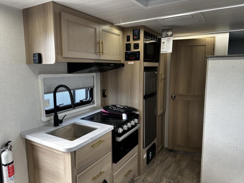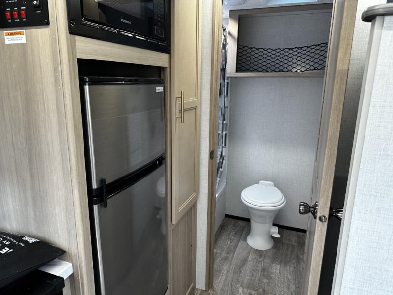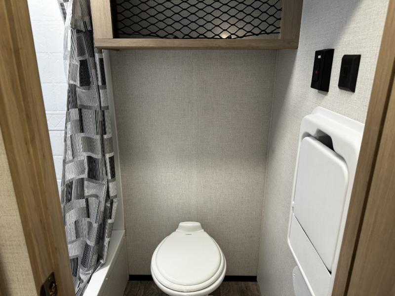 Camping will be an adventure for five or six campers featuring a single slide for added space. A full bed up front features drawers beneath for your clothing, plus there is a storage shelf above. With the 32" HDTV on the wall at the foot of the bed you can easily catch a move before you fall asleep or it can easily be viewed from the comfort of the booth dinette slide. Two more campers will enjoy the set of 26" x 74" bunk beds along the roadside back corner with flip-up bottom bunk for easy storage beneath. The opposite rear corner houses your private shower and toilet so you can skip the campground facilities! Cooking will be super convenient with a three-burner cooktop, a sink for cleaning up, and there is also a microwave located above the 12V 5.50 cu. ft. refrigerator for your perishables. On the outside, a 14' awning provides added living space where you can set up your camp chairs and be protected from the sun and rain. There is also a ladder in back and a convenience center up front.
