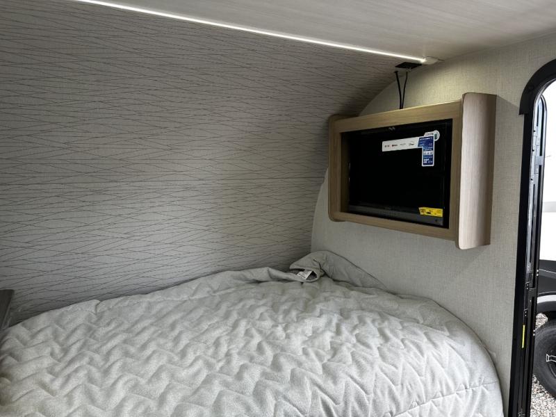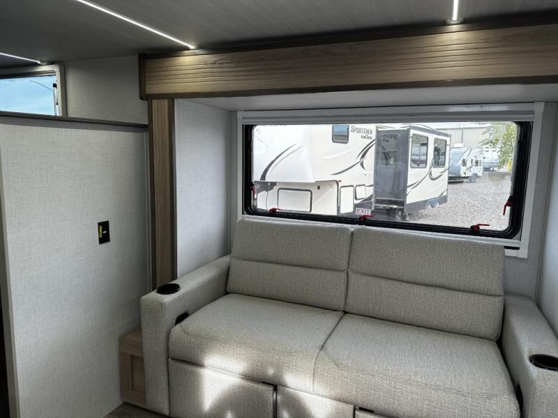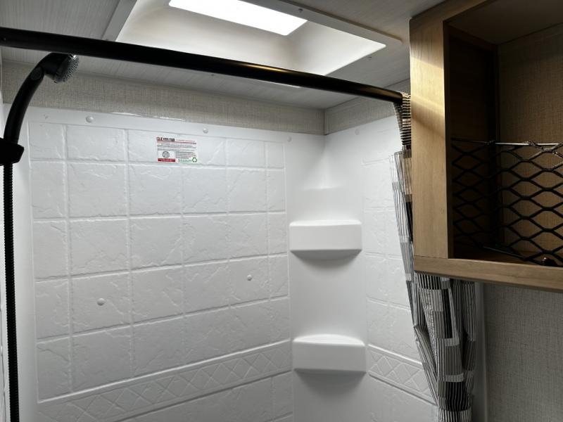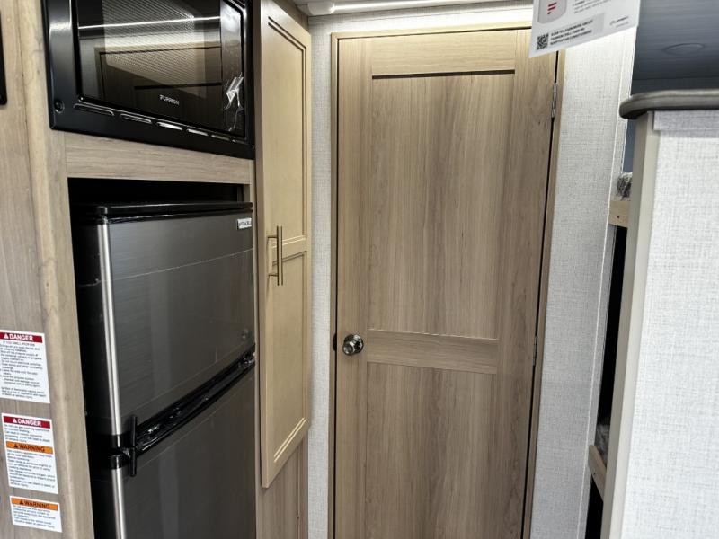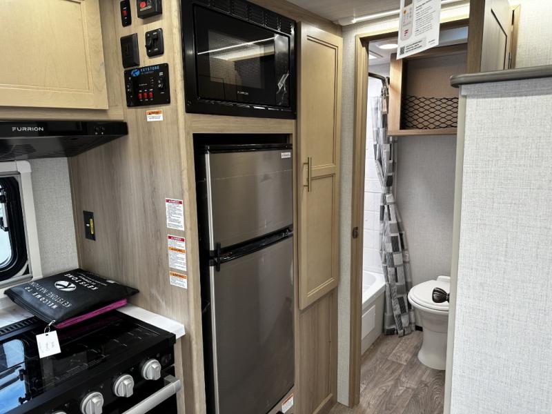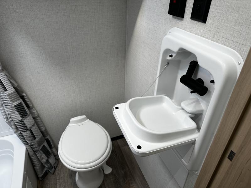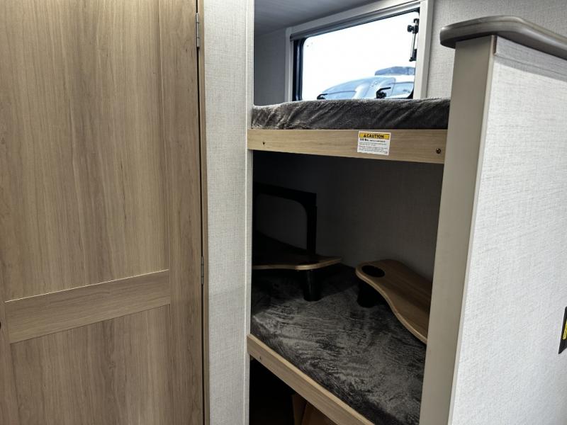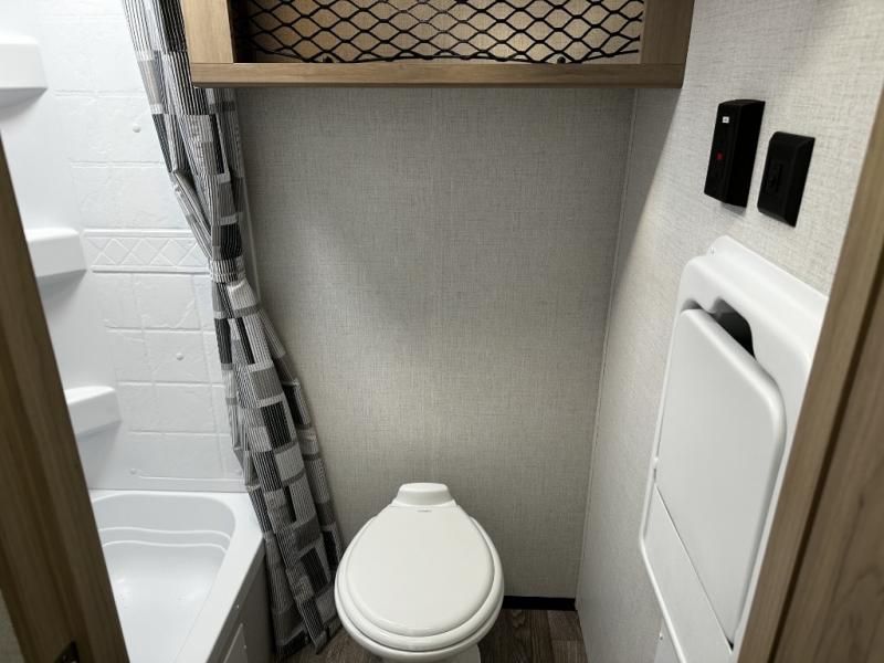 Camping will be an adventure for five or six campers featuring a single slide for added space. A full bed up front features drawers beneath for your clothing, plus there is a storage shelf above. With the 32" HDTV on the wall at the foot of the bed you can easily catch a move before you fall asleep or it can easily be viewed from the comfort of the booth dinette slide. Two more campers will enjoy the set of 26" x 74" bunk beds along the roadside back corner with flip-up bottom bunk for easy storage beneath. The opposite rear corner houses your private shower and toilet so you can skip the campground facilities! Cooking will be super convenient with a three-burner cooktop, a sink for cleaning up, and there is also a microwave located above the 12V 5.50 cu. ft. refrigerator for your perishables. On the outside, a 14' awning provides added living space where you can set up your camp chairs and be protected from the sun and rain. There is also a ladder in back and a convenience center up front.