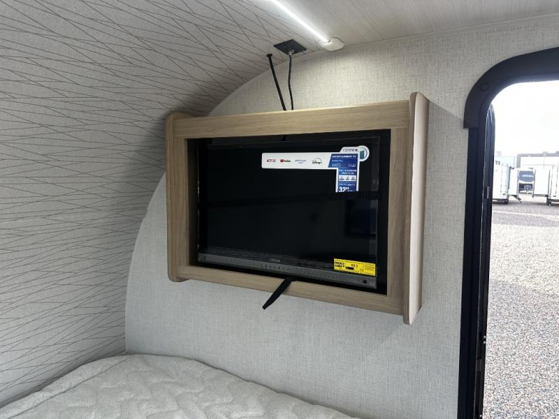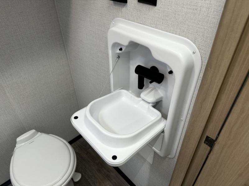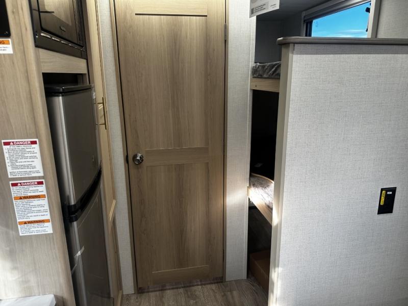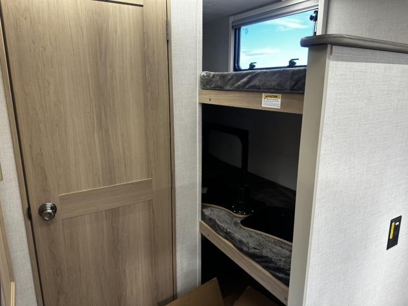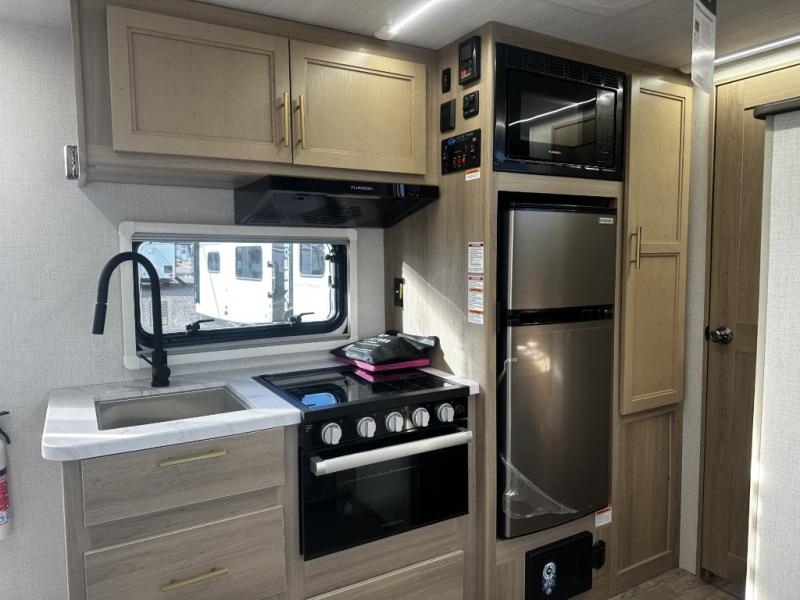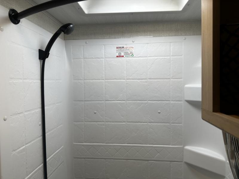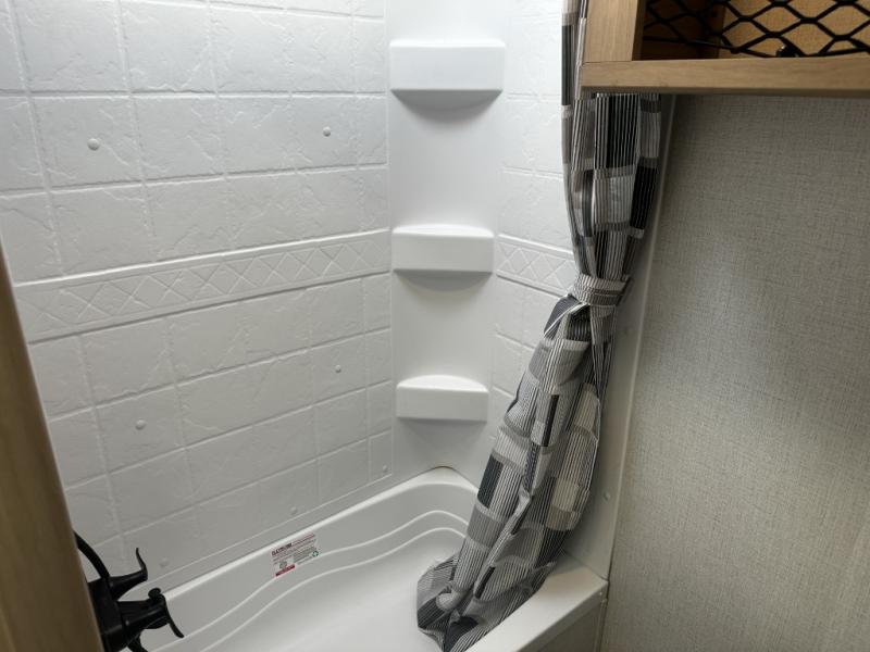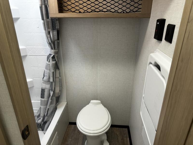 Camping will be an adventure for five or six campers featuring a single slide for added space. A full bed up front features drawers beneath for your clothing, plus there is a storage shelf above. With the 32" HDTV on the wall at the foot of the bed you can easily catch a move before you fall asleep or it can easily be viewed from the comfort of the booth dinette slide. Two more campers will enjoy the set of 26" x 74" bunk beds along the roadside back corner with flip-up bottom bunk for easy storage beneath. The opposite rear corner houses your private shower and toilet so you can skip the campground facilities! Cooking will be super convenient with a three-burner cooktop, a sink for cleaning up, and there is also a microwave located above the 12V 5.50 cu. ft. refrigerator for your perishables. On the outside, a 14' awning provides added living space where you can set up your camp chairs and be protected from the sun and rain. There is also a ladder in back and a convenience center up front.
