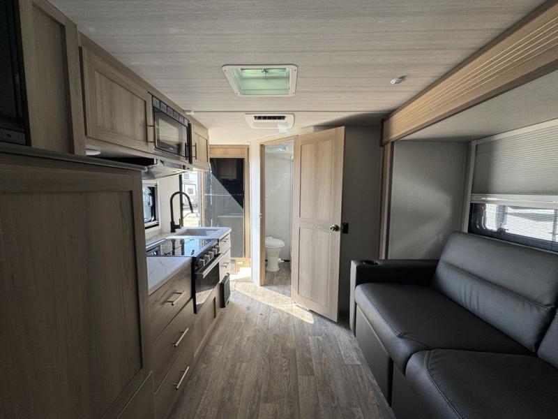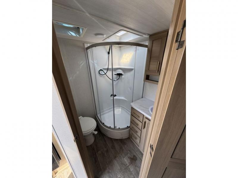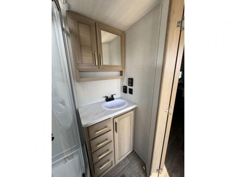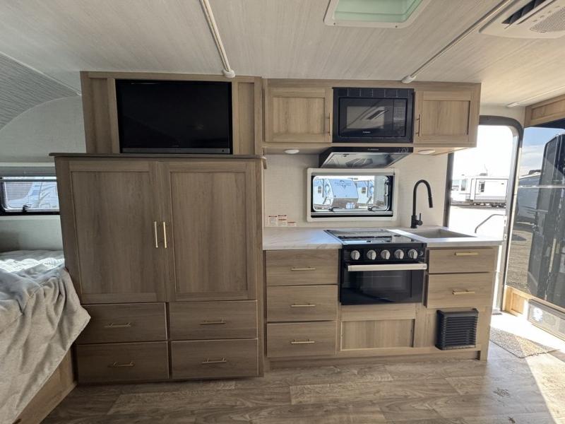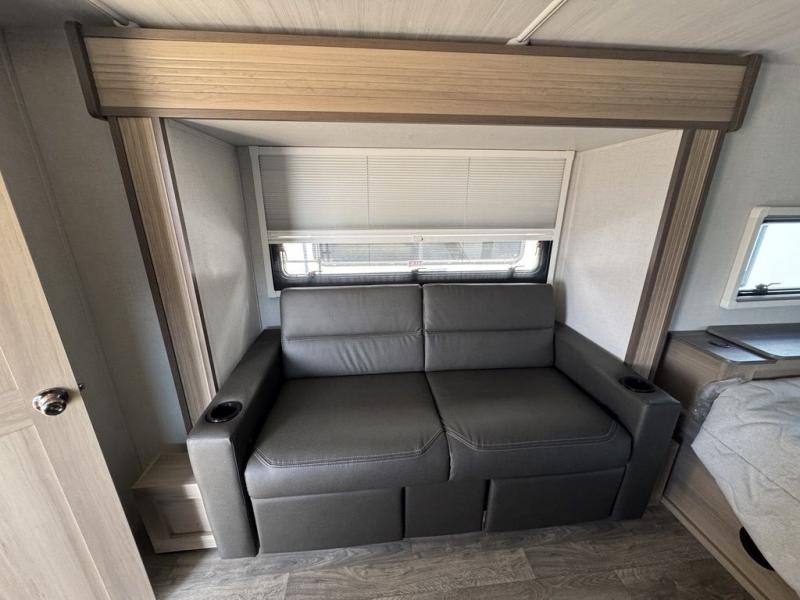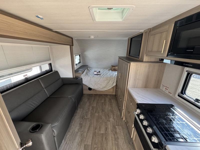 You and your partner will love this travel travel trailer! In the bedroom, the 54" X 75" full bed makes the perfect space for two, along with the flip up storage and dual USB connectors beside the bed. Have a relaxing time watching the 32" Smart TV seated on the theater dinette fitted with pivoting tables. Take a refreshing bath after a long day in the amazing radius shaped bathroom. Spend comfortable moments on the outside with the 12' awning, and there is a exterior storage space to store other belongings.