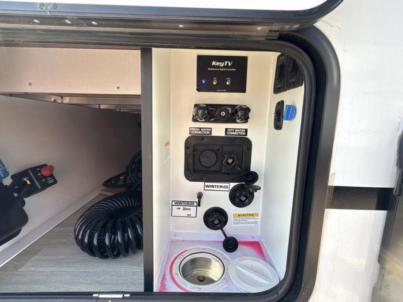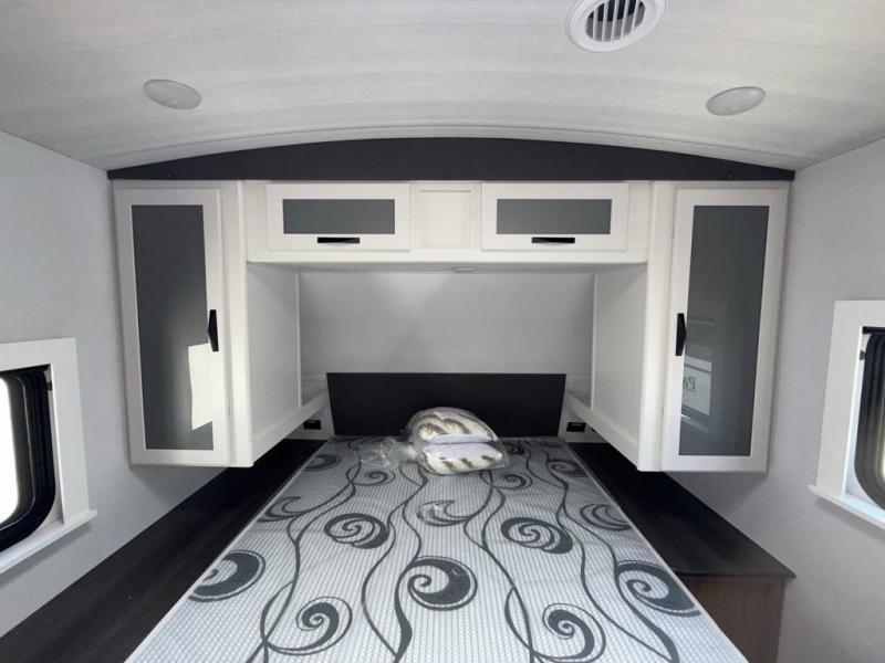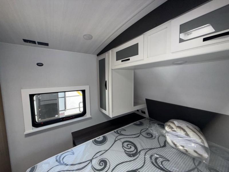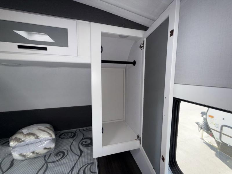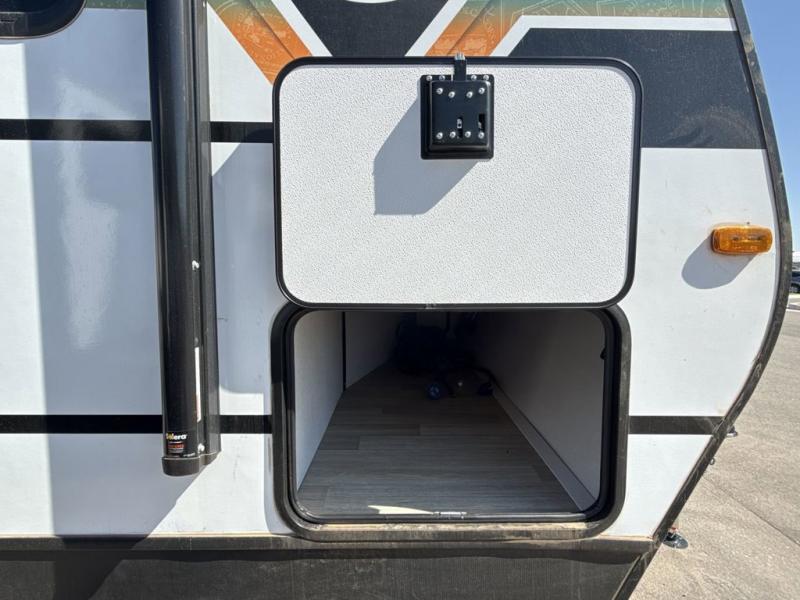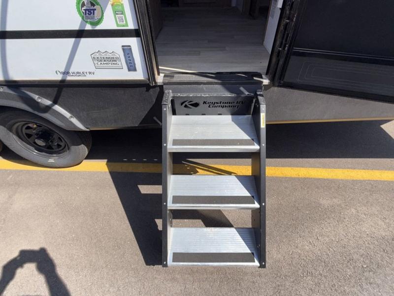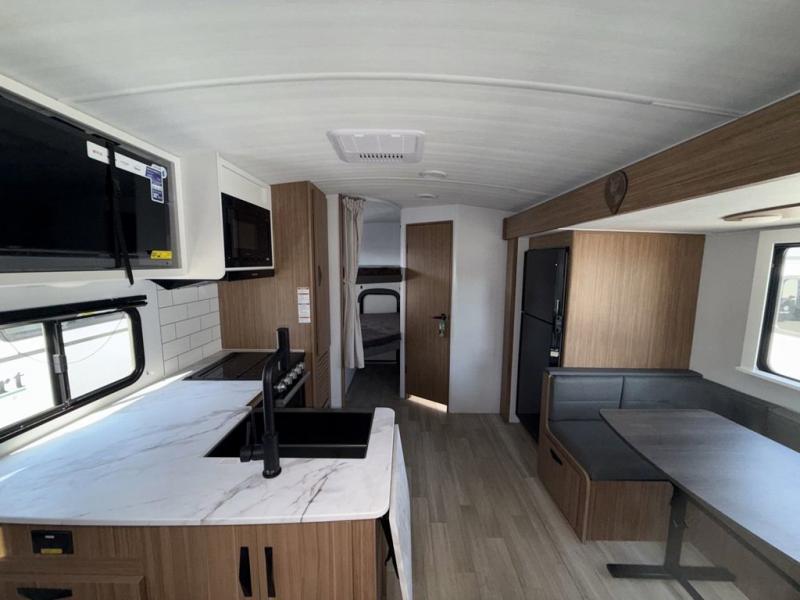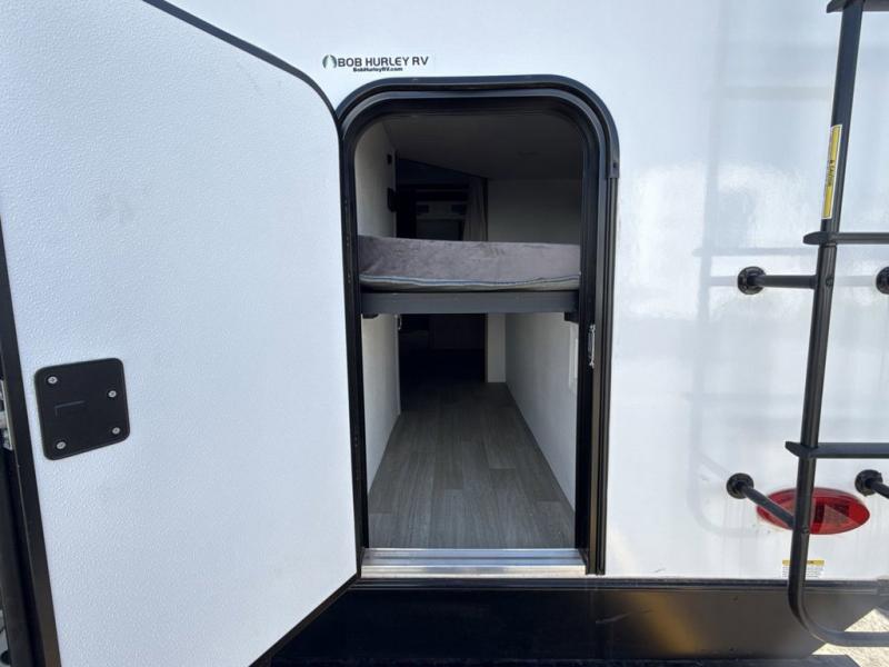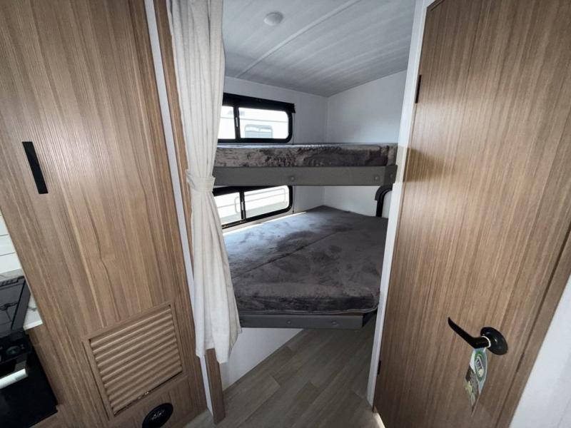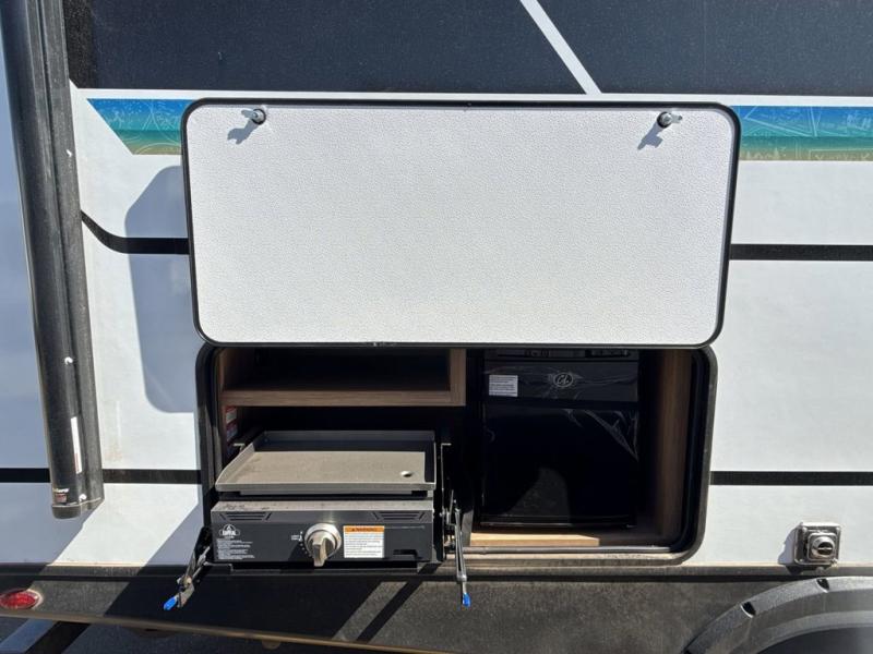 Trips to the lake with a larger group are made easy in this spacious travel trailer! The double-size bunks include a flip-up bunk for added storage, and there is a rear cargo door here so you can easily load gear from outside. The full bath is conveniently located right by the bunks for easy nighttime use, and the pantry is also close by if anyone needs a midnight snack! You will sleep like a baby in the front bedroom that includes a queen bed and dual wardrobes to keep your clothes tidy. In the morning, everyone can meet in the combined living area and kitchen while the chef makes breakfast on the three burner cooktop, and there is a U-shaped do-more dinette table to dine at. If the weather is nice, the chef just may want to cook on the outside kitchen, and everyone can sit at the picnic table under the 15' awning!