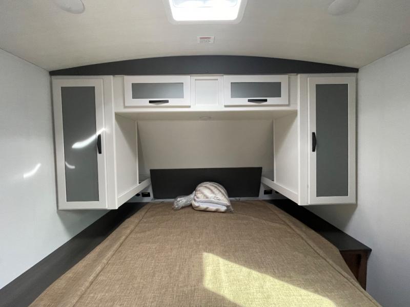 If you're looking to upgrade from a tent to a travel trailer, the time is now with this model! You will love having your own master bedroom up front with a queen bed, dual bedroom wardrobes and your own exterior entry door. The second entry door leads right into the combined kitchen and living area for added convenience. Your crew can dine or play a game around the do-more dinette table or relax on the tri-fold sofa across from the entertainment center. These pieces of furniture will also double as your guests' sleeping space at night, and you have the option to choose luxury cinema recliners in place of the sofa if you don't need that much sleeping room. There is also a full walk-through bath to clean up in each day plus a fully-equipped kitchen to make meals!