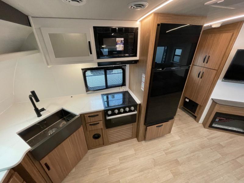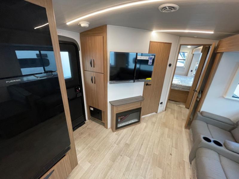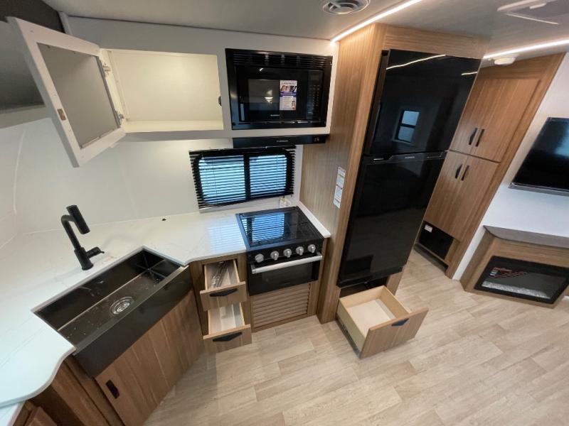 Pack your bags and hitch up this travel trailer! The dual entry doors make it easy to enter and exit especially from the rear private bedroom which has a king bed slide and a large wardrobe. The bedroom also has an entrance into the dual entry bathroom where you will find a radius shower to freshen up in each morning. After a fun day outdoors, you can relax on the tri-fold sofa across from the entertainment center with a fireplace or you can play a game or two at the Do-More dinette table. You can also choose the optional luxury cinema recliners in place of the sofa and the optional free-standing dinette in place of the standard dinette depending on your needs. The chef will enjoy all of the space provided with the front kitchen too!