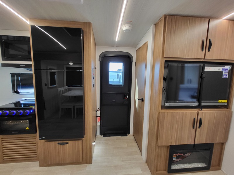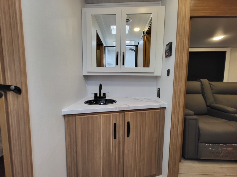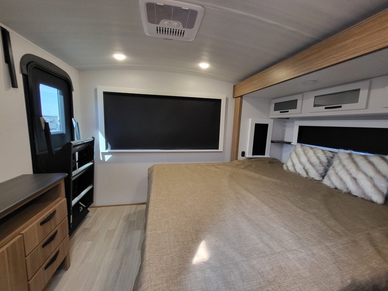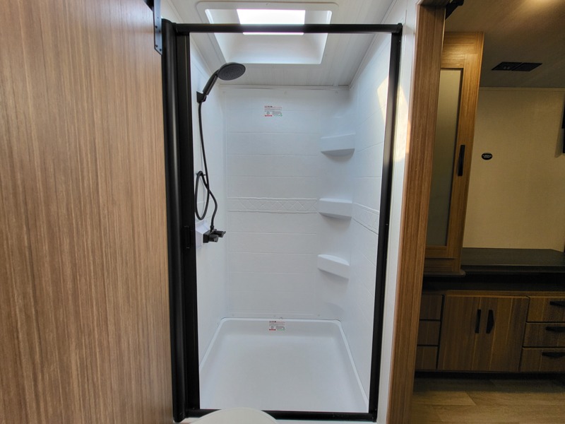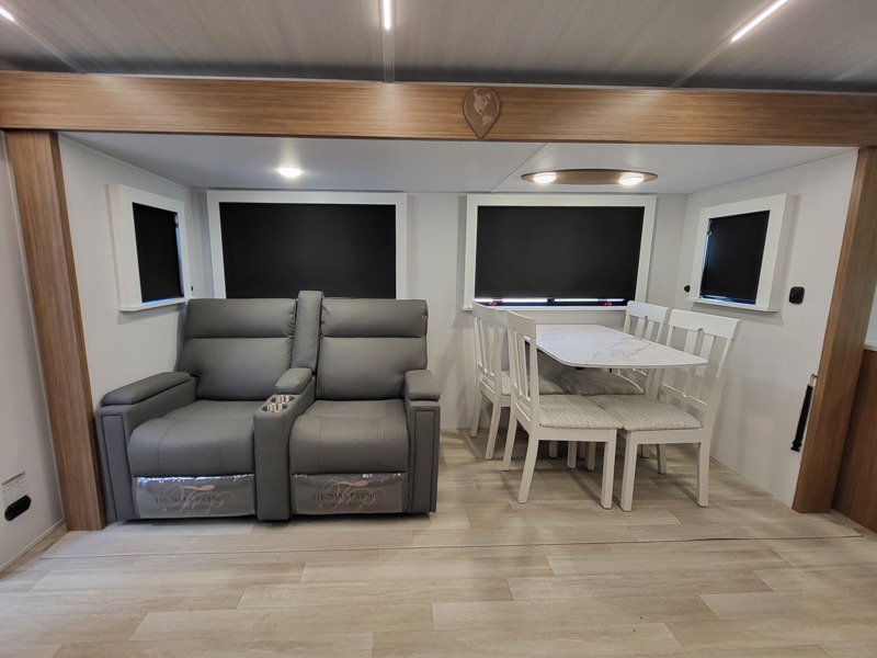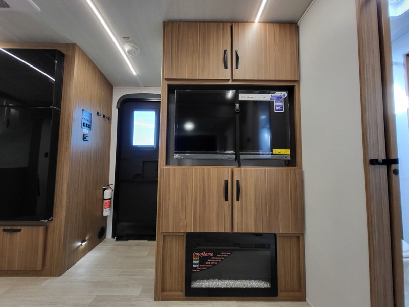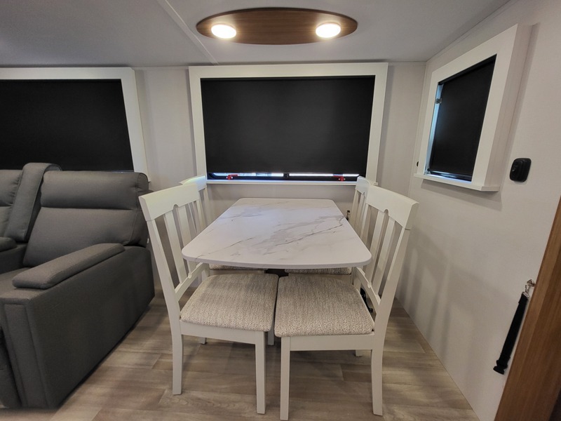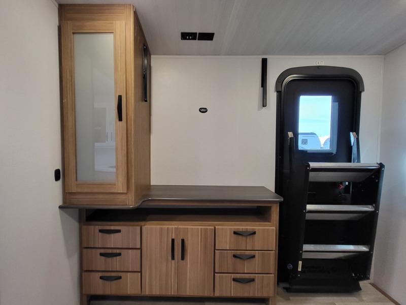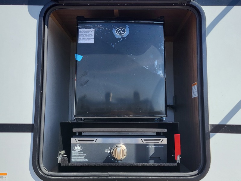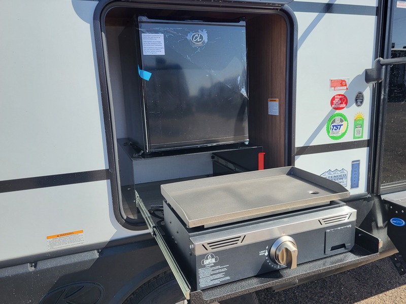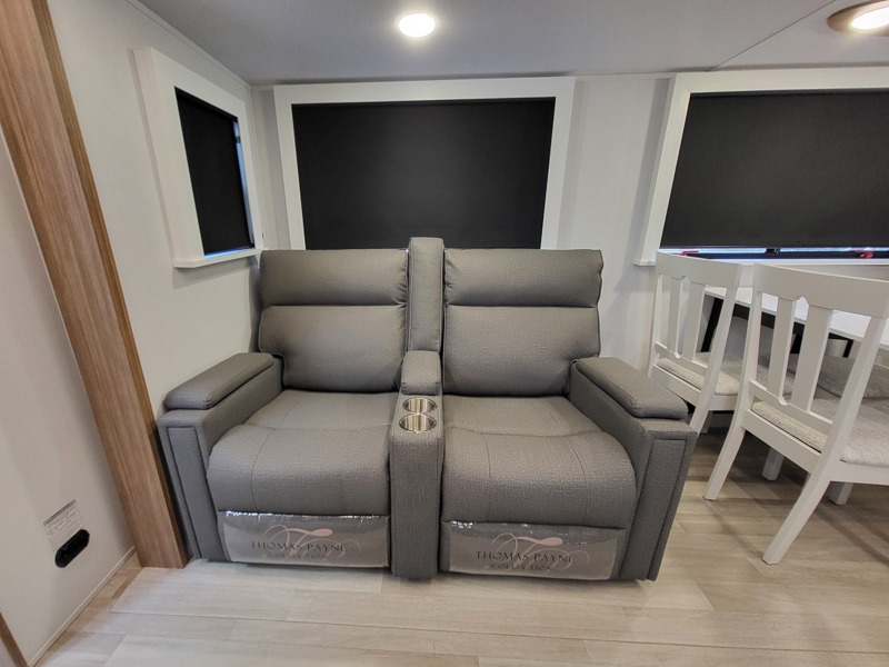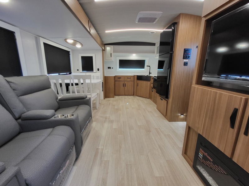 Pack your bags and hitch up this travel trailer! The dual entry doors make it easy to enter and exit especially from the rear private bedroom which has a king bed slide and a large wardrobe. The bedroom also has an entrance into the dual entry bathroom where you will find a radius shower to freshen up in each morning. After a fun day outdoors, you can relax on the tri-fold sofa across from the entertainment center with a fireplace or you can play a game or two at the Do-More dinette table. You can also choose the optional luxury cinema recliners in place of the sofa and the optional free-standing dinette in place of the standard dinette depending on your needs. The chef will enjoy all of the space provided with the front kitchen too!