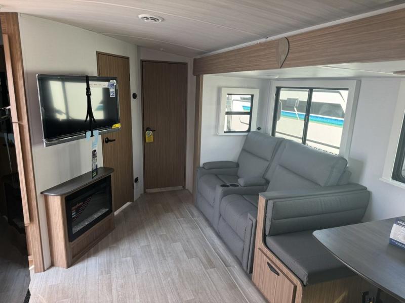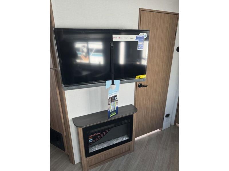 Pack your bags and hitch up this travel trailer! The dual entry doors make it easy to enter and exit especially from the rear private bedroom which has a king bed slide and a large wardrobe. The bedroom also has an entrance into the dual entry bathroom where you will find a radius shower to freshen up in each morning. After a fun day outdoors, you can relax on the tri-fold sofa across from the entertainment center with a fireplace or you can play a game or two at the Do-More dinette table. You can also choose the optional luxury cinema recliners in place of the sofa and the optional free-standing dinette in place of the standard dinette depending on your needs. The chef will enjoy all of the space provided with the front kitchen too!
