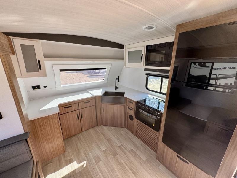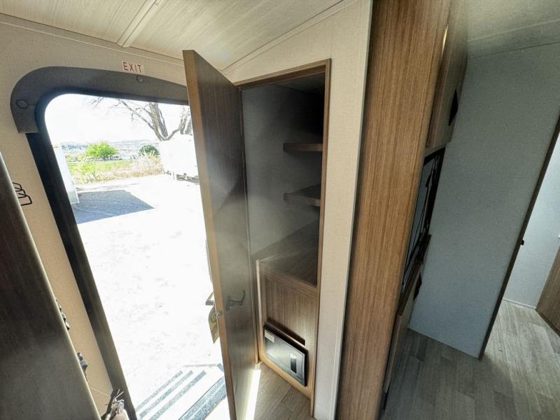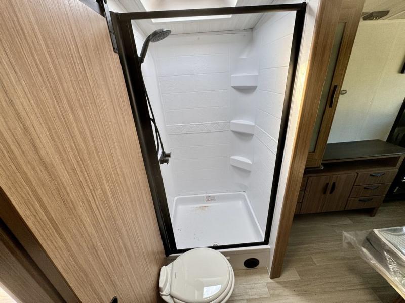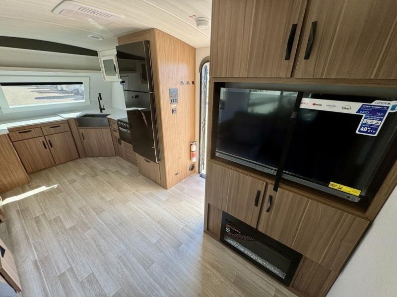 Pack your bags and hitch up this travel trailer! The dual entry doors make it easy to enter and exit especially from the rear private bedroom which has a king bed slide and a large wardrobe. The bedroom also has an entrance into the dual entry bathroom where you will find a radius shower to freshen up in each morning. After a fun day outdoors, you can relax on the tri-fold sofa across from the entertainment center with a fireplace or you can play a game or two at the Do-More dinette table. You can also choose the optional luxury cinema recliners in place of the sofa and the optional free-standing dinette in place of the standard dinette depending on your needs. The chef will enjoy all of the space provided with the front kitchen too!