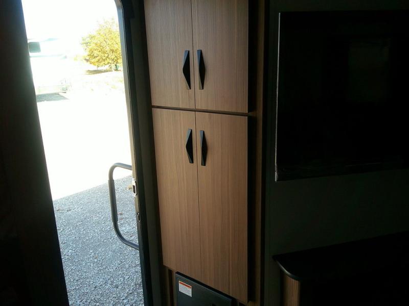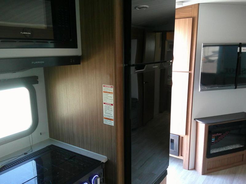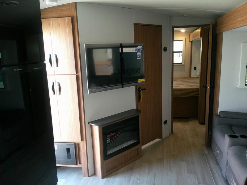 Pack your bags and hitch up this travel trailer! The dual entry doors make it easy to enter and exit especially from the rear private bedroom which has a king bed slide and a large wardrobe. The bedroom also has an entrance into the dual entry bathroom where you will find a radius shower to freshen up in each morning. After a fun day outdoors, you can relax on the tri-fold sofa across from the entertainment center with a fireplace or you can play a game or two at the Do-More dinette table. You can also choose the optional luxury cinema recliners in place of the sofa and the optional free-standing dinette in place of the standard dinette depending on your needs. The chef will enjoy all of the space provided with the front kitchen too!