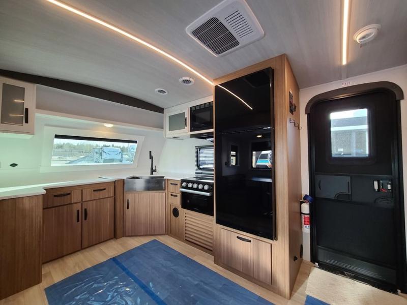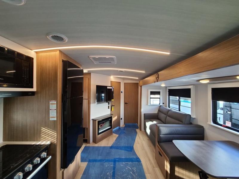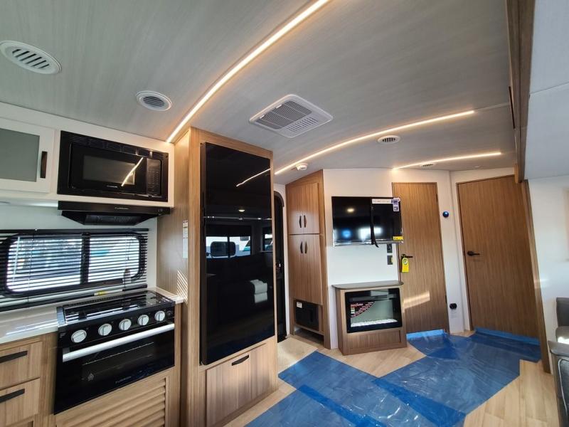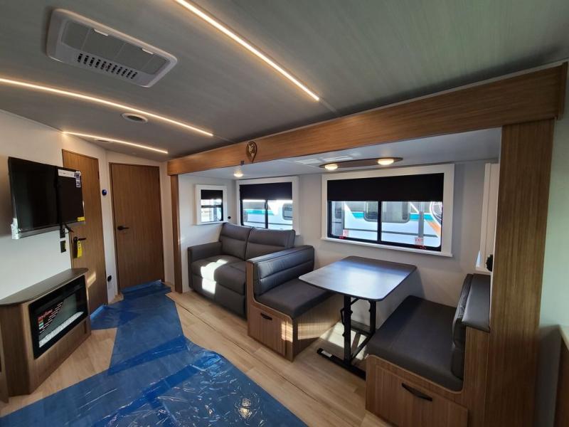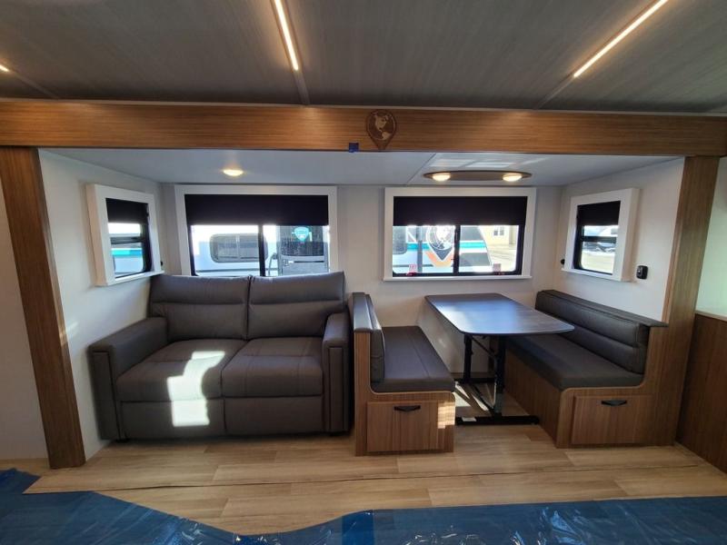 Pack your bags and hitch up this travel trailer! The dual entry doors make it easy to enter and exit especially from the rear private bedroom which has a king bed slide and a large wardrobe. The bedroom also has an entrance into the dual entry bathroom where you will find a radius shower to freshen up in each morning. After a fun day outdoors, you can relax on the tri-fold sofa across from the entertainment center with a fireplace or you can play a game or two at the Do-More dinette table. You can also choose the optional luxury cinema recliners in place of the sofa and the optional free-standing dinette in place of the standard dinette depending on your needs. The chef will enjoy all of the space provided with the front kitchen too!
