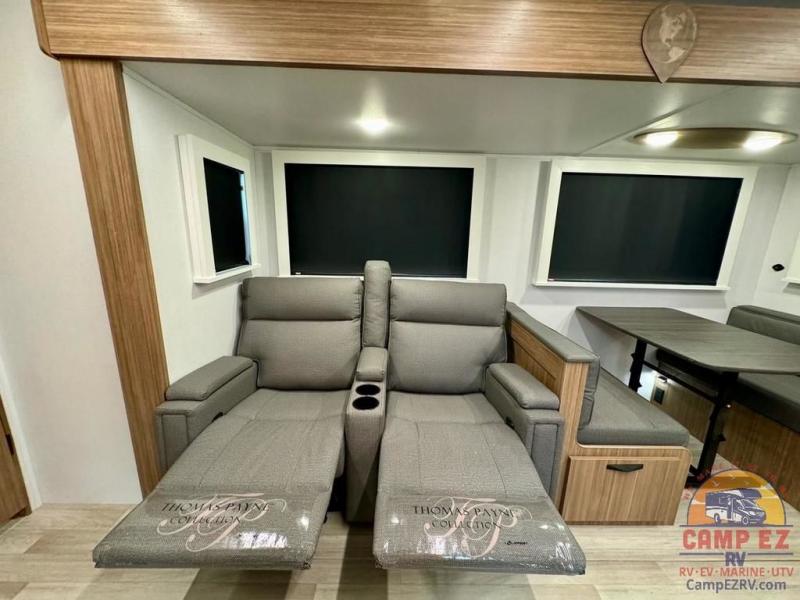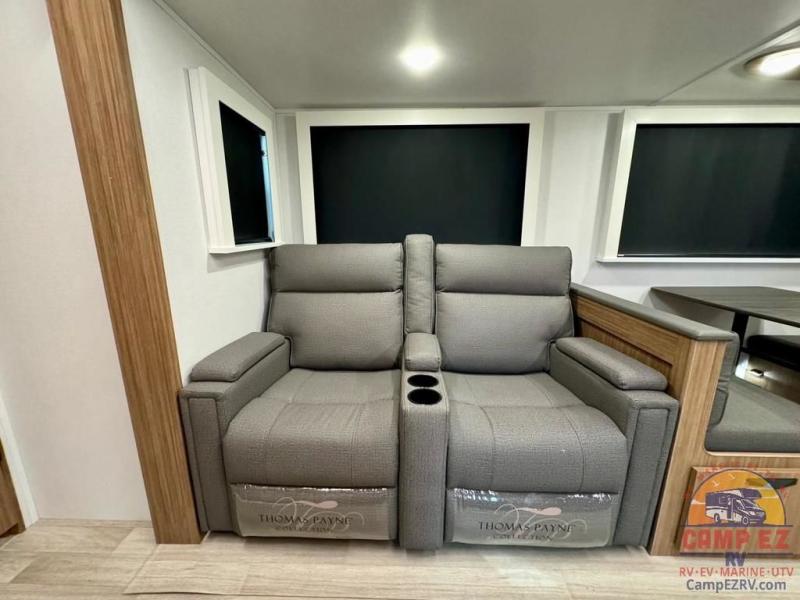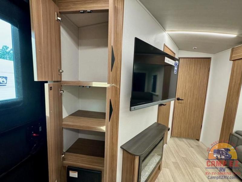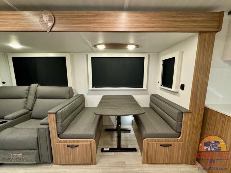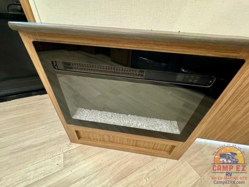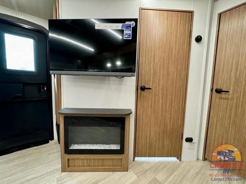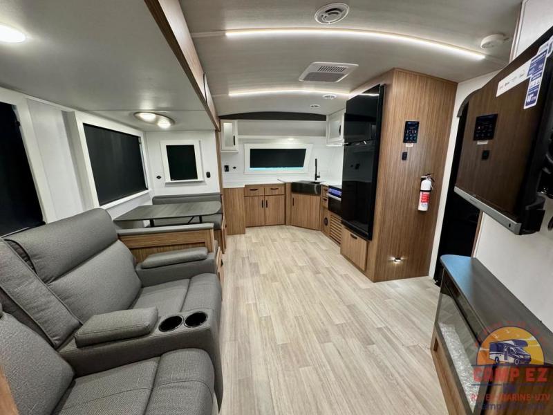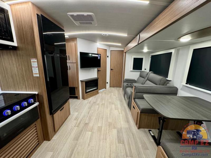 Pack your bags and hitch up this travel trailer! The dual entry doors make it easy to enter and exit especially from the rear private bedroom which has a king bed slide and a large wardrobe. The bedroom also has an entrance into the dual entry bathroom where you will find a radius shower to freshen up in each morning. After a fun day outdoors, you can relax on the tri-fold sofa across from the entertainment center with a fireplace or you can play a game or two at the Do-More dinette table. You can also choose the optional luxury cinema recliners in place of the sofa and the optional free-standing dinette in place of the standard dinette depending on your needs. The chef will enjoy all of the space provided with the front kitchen too!