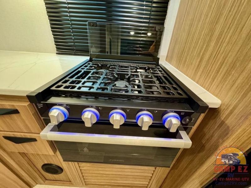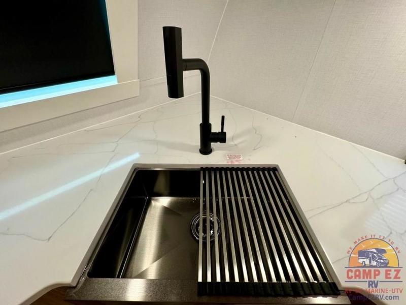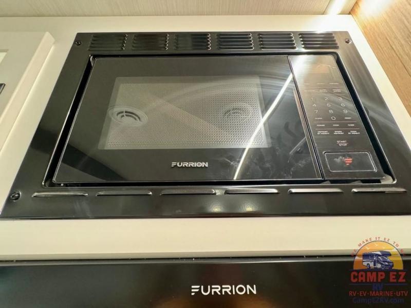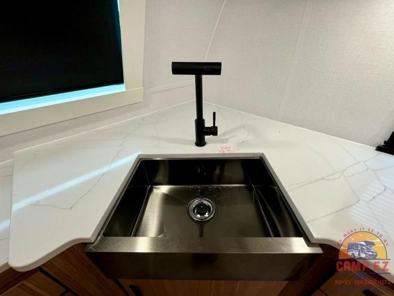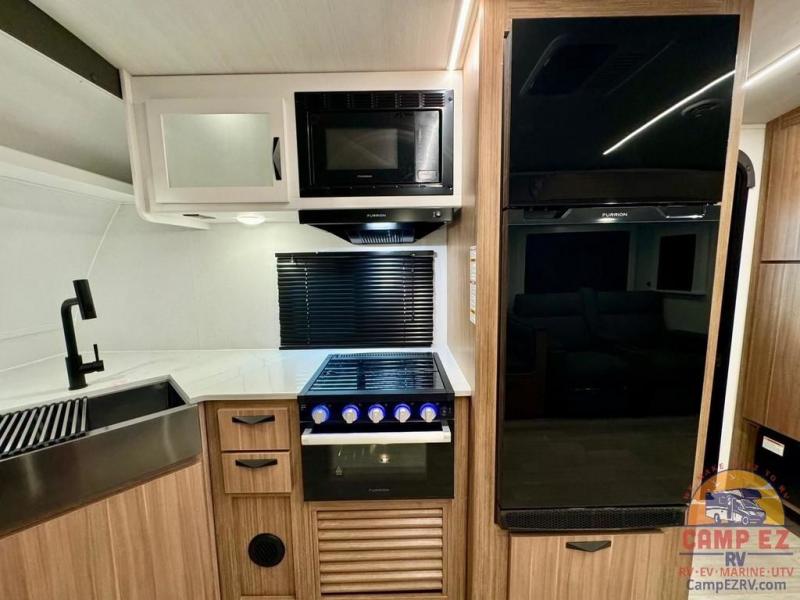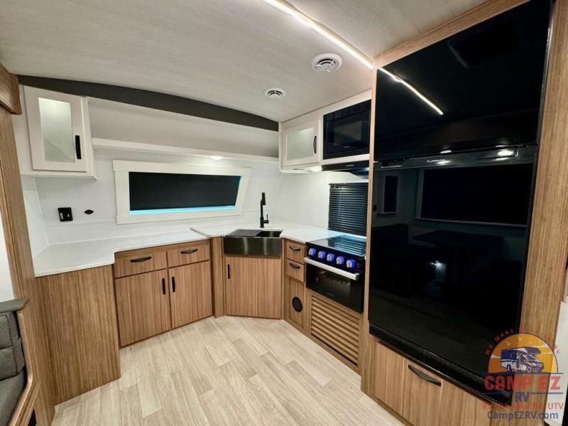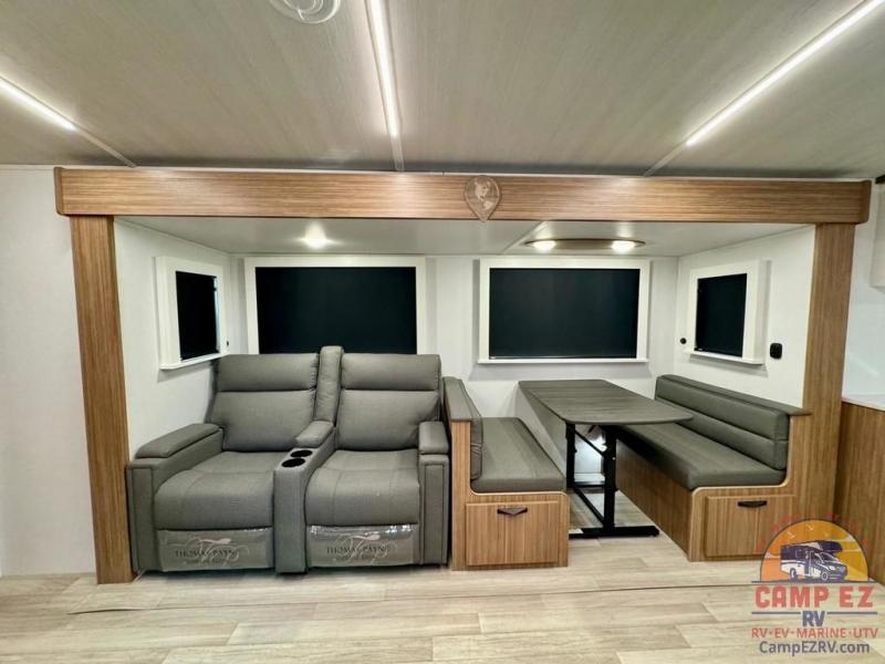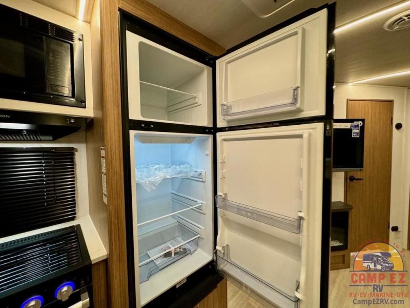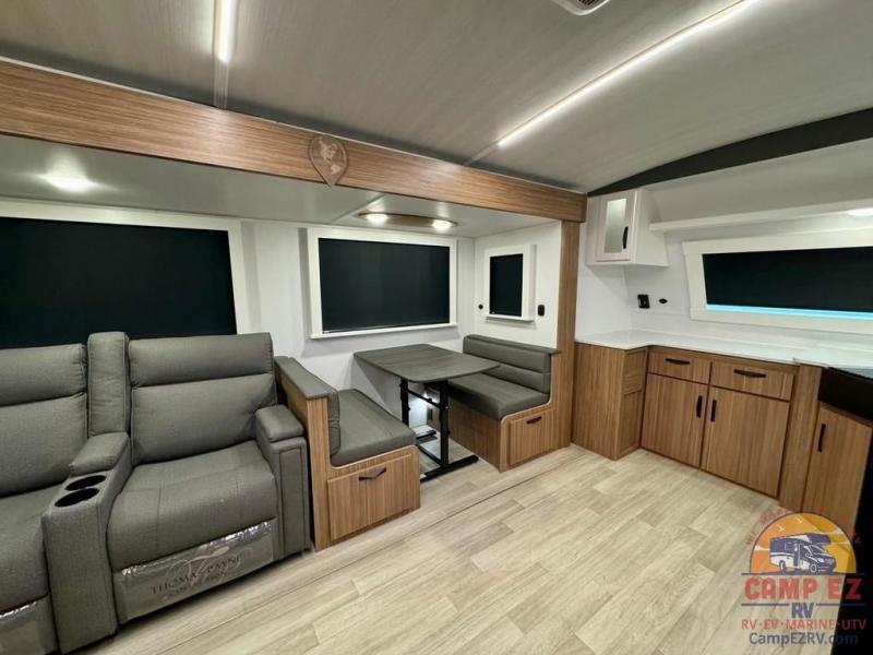 Pack your bags and hitch up this travel trailer! The dual entry doors make it easy to enter and exit especially from the rear private bedroom which has a king bed slide and a large wardrobe. The bedroom also has an entrance into the dual entry bathroom where you will find a radius shower to freshen up in each morning. After a fun day outdoors, you can relax on the tri-fold sofa across from the entertainment center with a fireplace or you can play a game or two at the Do-More dinette table. You can also choose the optional luxury cinema recliners in place of the sofa and the optional free-standing dinette in place of the standard dinette depending on your needs. The chef will enjoy all of the space provided with the front kitchen too!
