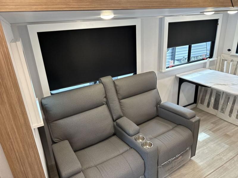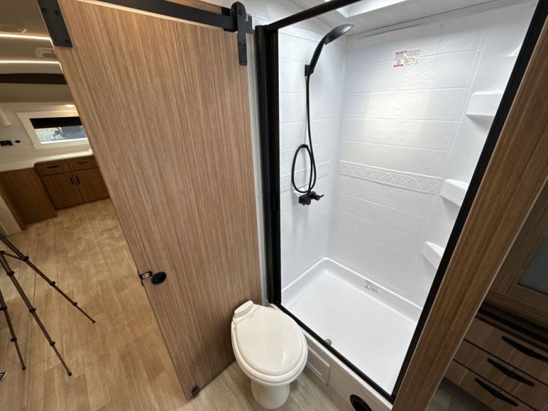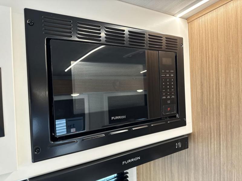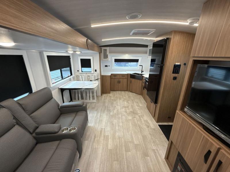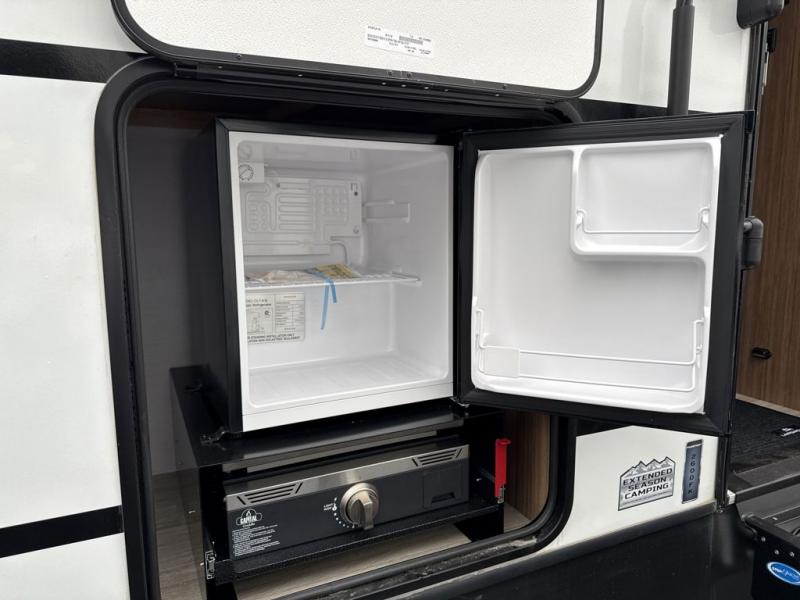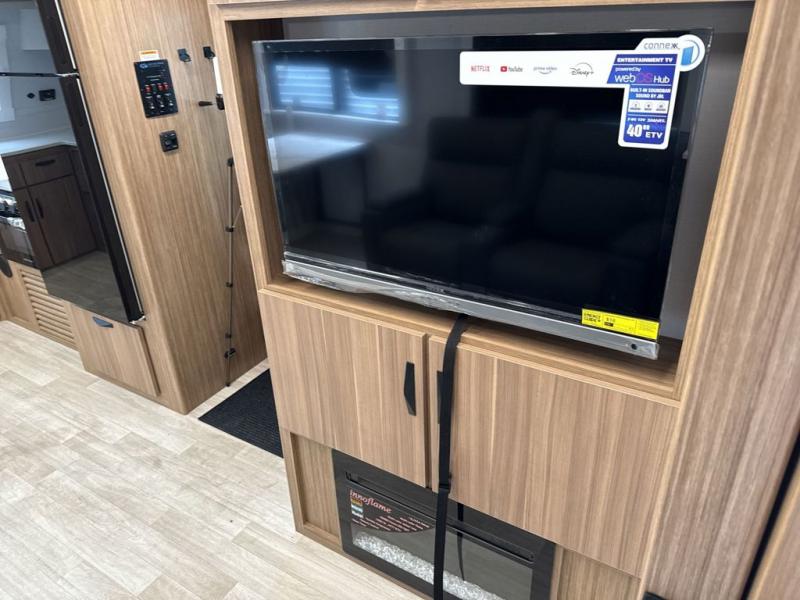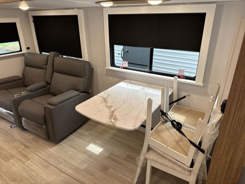 Pack your bags and hitch up this travel trailer! The dual entry doors make it easy to enter and exit especially from the rear private bedroom which has a king bed slide and a large wardrobe. The bedroom also has an entrance into the dual entry bathroom where you will find a radius shower to freshen up in each morning. After a fun day outdoors, you can relax on the tri-fold sofa across from the entertainment center with a fireplace or you can play a game or two at the Do-More dinette table. You can also choose the optional luxury cinema recliners in place of the sofa and the optional free-standing dinette in place of the standard dinette depending on your needs. The chef will enjoy all of the space provided with the front kitchen too!