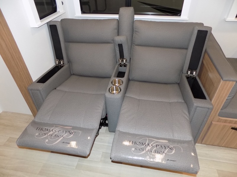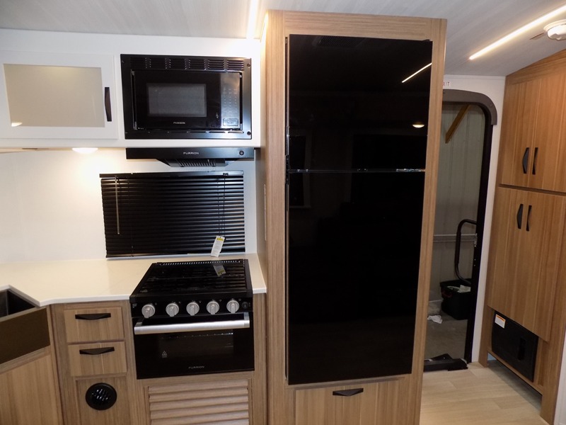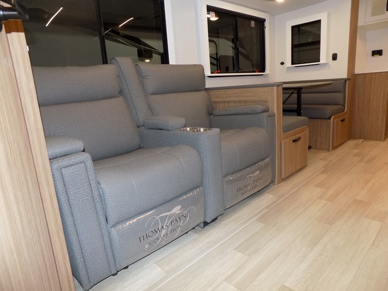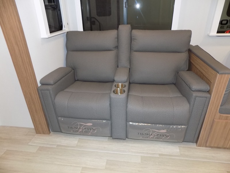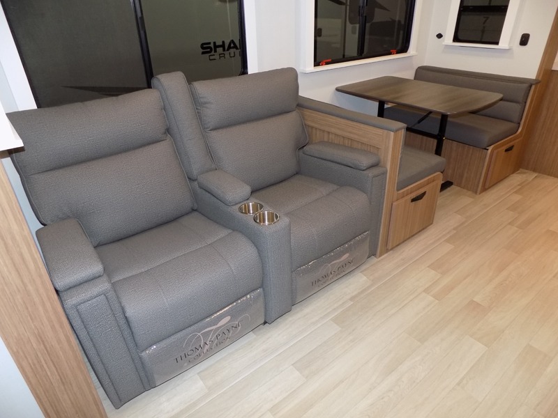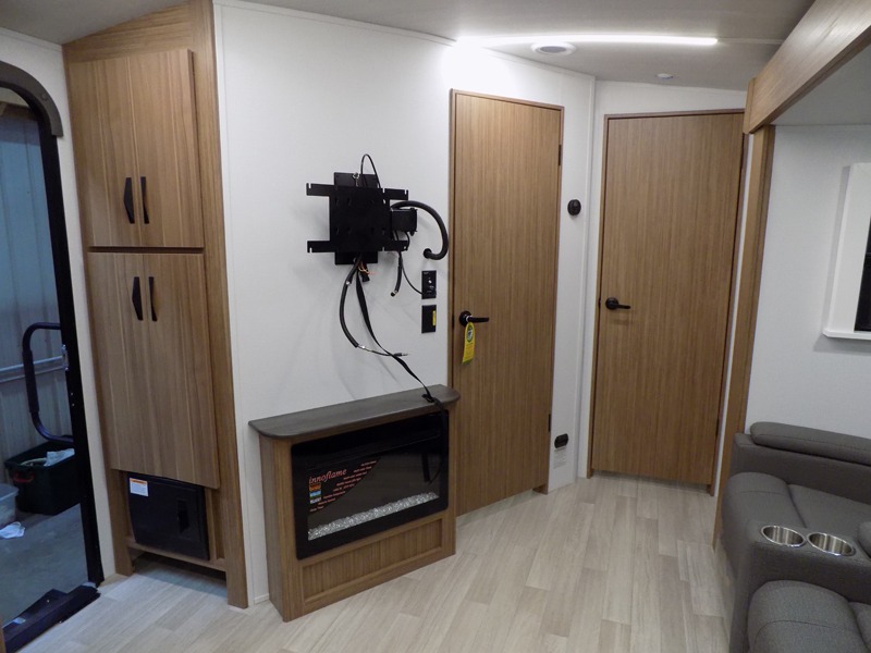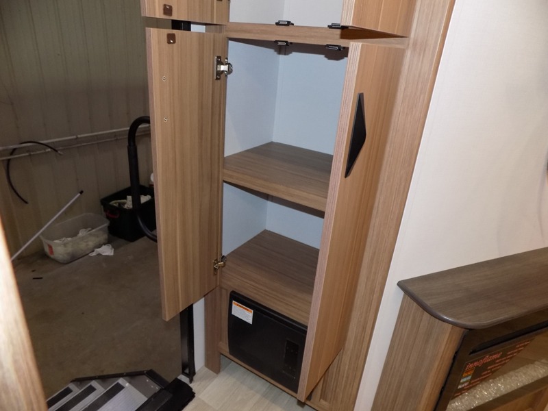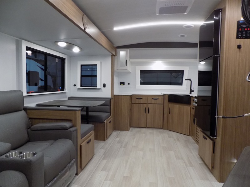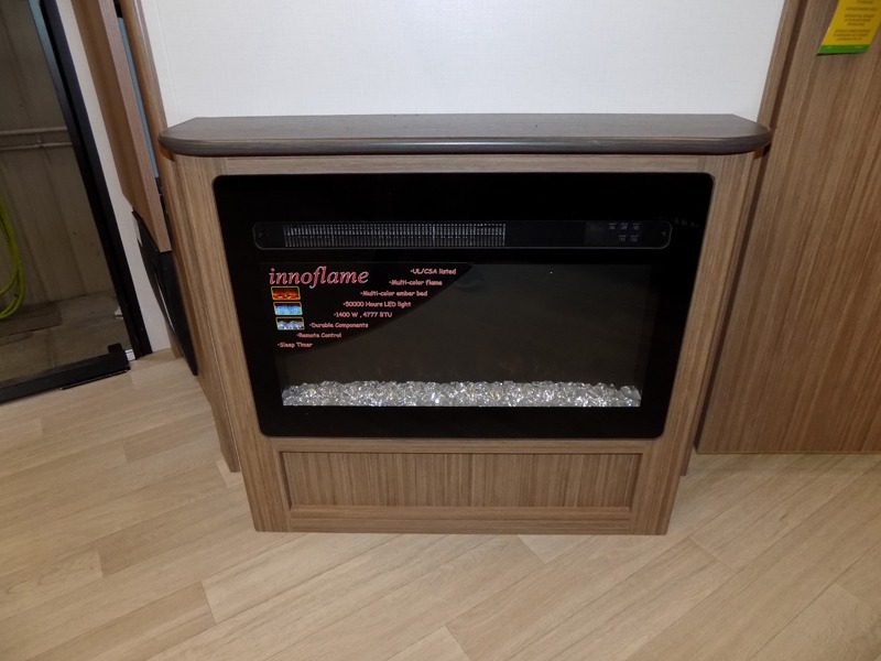 Pack your bags and hitch up this travel trailer! The dual entry doors make it easy to enter and exit especially from the rear private bedroom which has a king bed slide and a large wardrobe. The bedroom also has an entrance into the dual entry bathroom where you will find a radius shower to freshen up in each morning. After a fun day outdoors, you can relax on the tri-fold sofa across from the entertainment center with a fireplace or you can play a game or two at the Do-More dinette table. You can also choose the optional luxury cinema recliners in place of the sofa and the optional free-standing dinette in place of the standard dinette depending on your needs. The chef will enjoy all of the space provided with the front kitchen too!