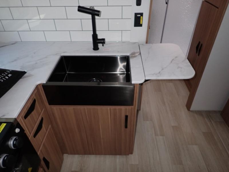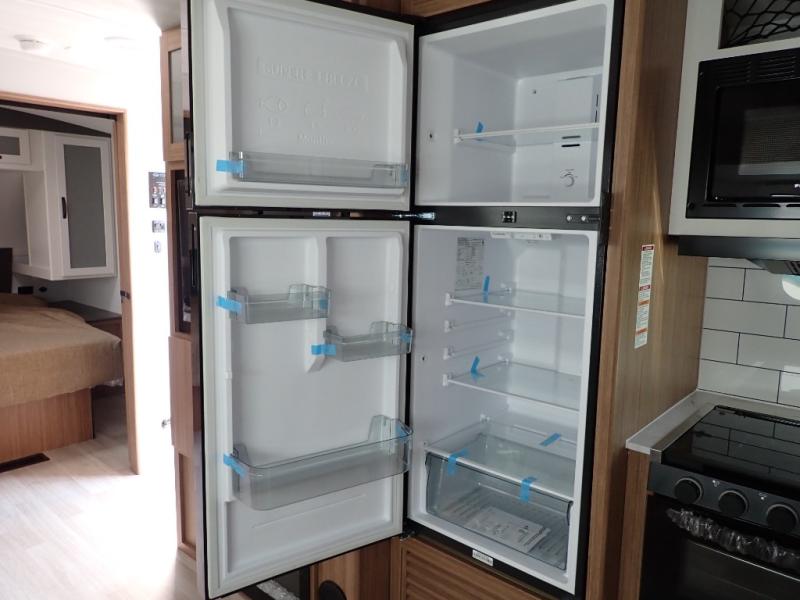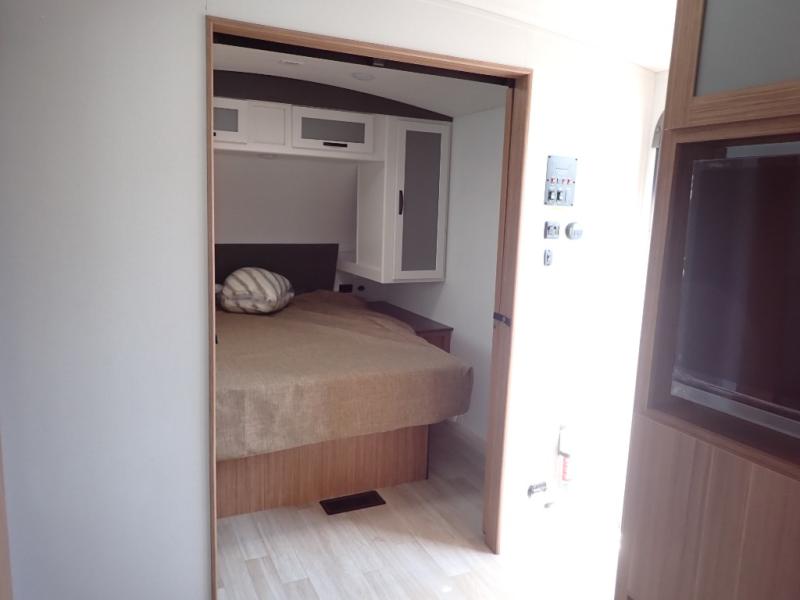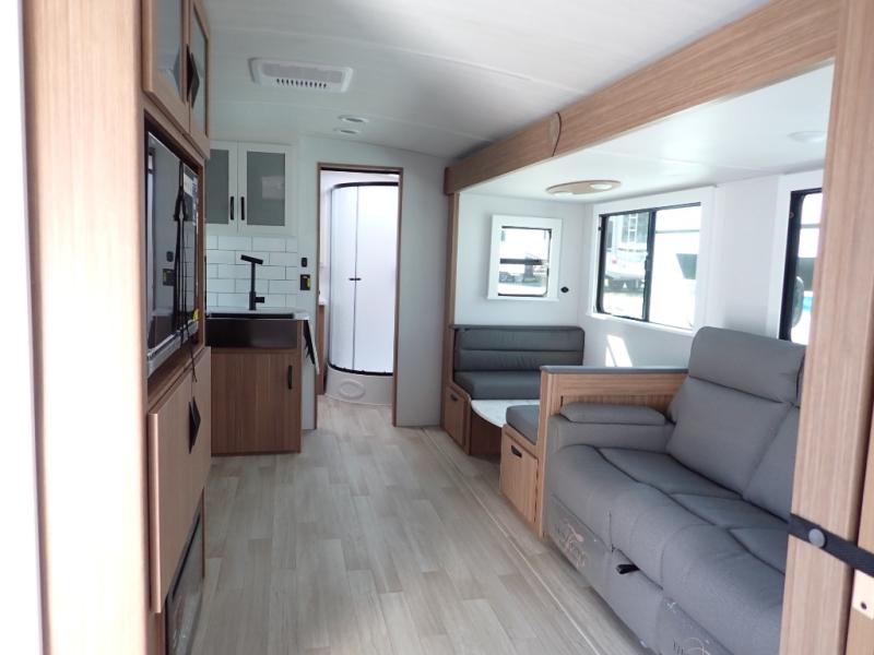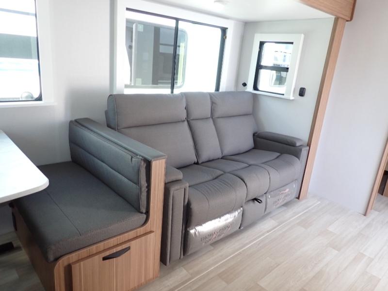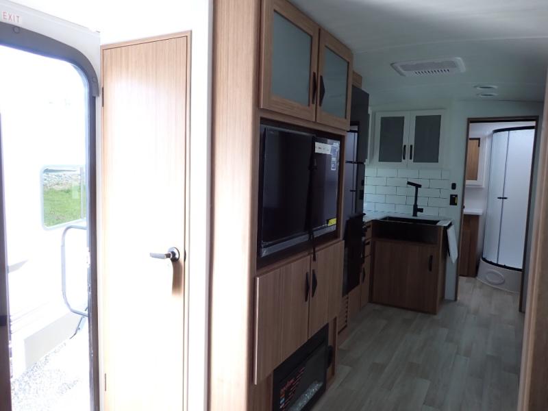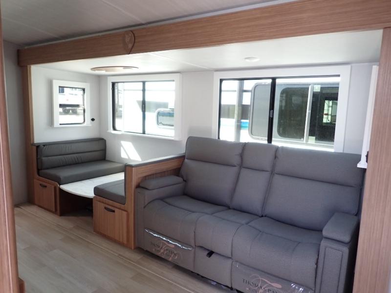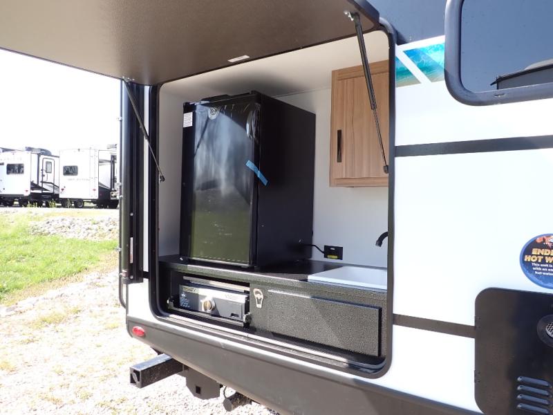 Time spent in this dual axle travel trailer will be time well spent. You can put out the 21' awning when you arrive, then unload the pass-thru storage and start lunch on the exterior kitchen with a Capital grill, sink, and 4.4 cu. ft. refrigerator. The tri-fold sofa and Do-More dinette table within the large slide out will provide a place to relax and dine each day, and there is a full interior kitchen when the weather isn't cooperating outdoors. This unit includes a front private bedroom with sliding doors for more space, a queen bed, dual wardrobes, and a nightstand to keep everything tidy. And don't overlook the full rear bath that will allow you to clean up each day without having to leave your trailer!