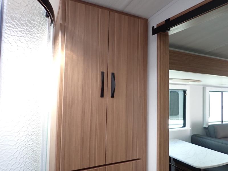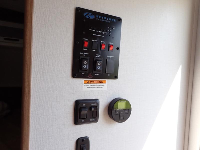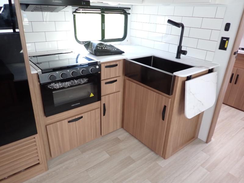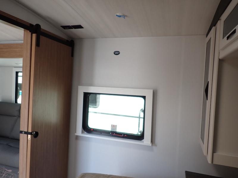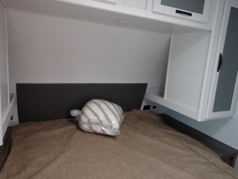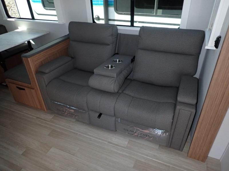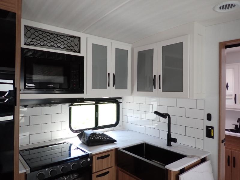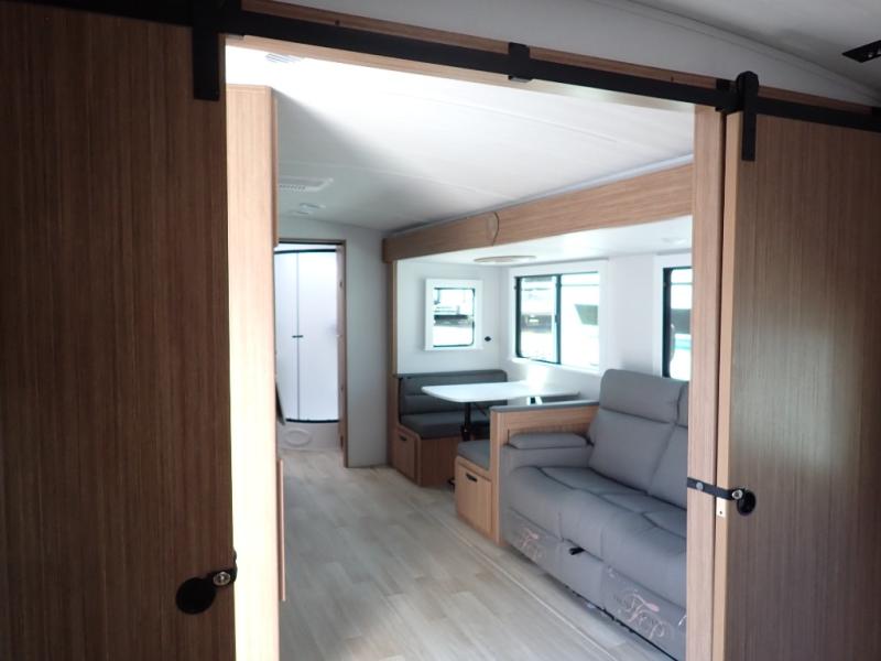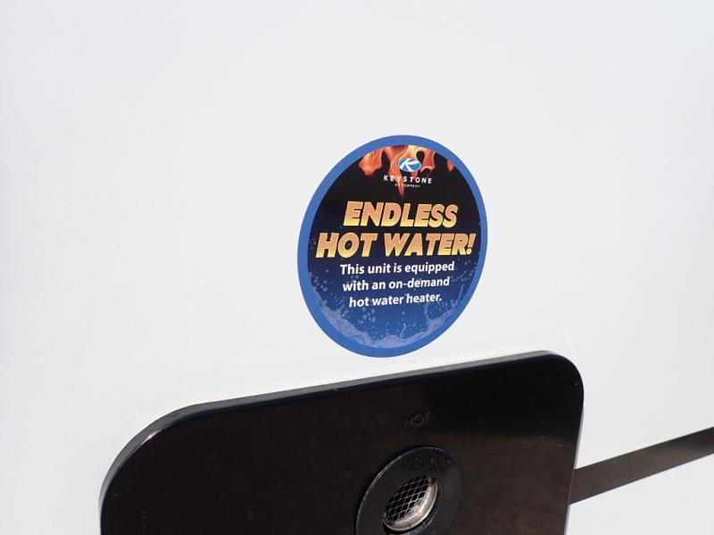 Time spent in this dual axle travel trailer will be time well spent. You can put out the 21' awning when you arrive, then unload the pass-thru storage and start lunch on the exterior kitchen with a Capital grill, sink, and 4.4 cu. ft. refrigerator. The tri-fold sofa and Do-More dinette table within the large slide out will provide a place to relax and dine each day, and there is a full interior kitchen when the weather isn't cooperating outdoors. This unit includes a front private bedroom with sliding doors for more space, a queen bed, dual wardrobes, and a nightstand to keep everything tidy. And don't overlook the full rear bath that will allow you to clean up each day without having to leave your trailer!