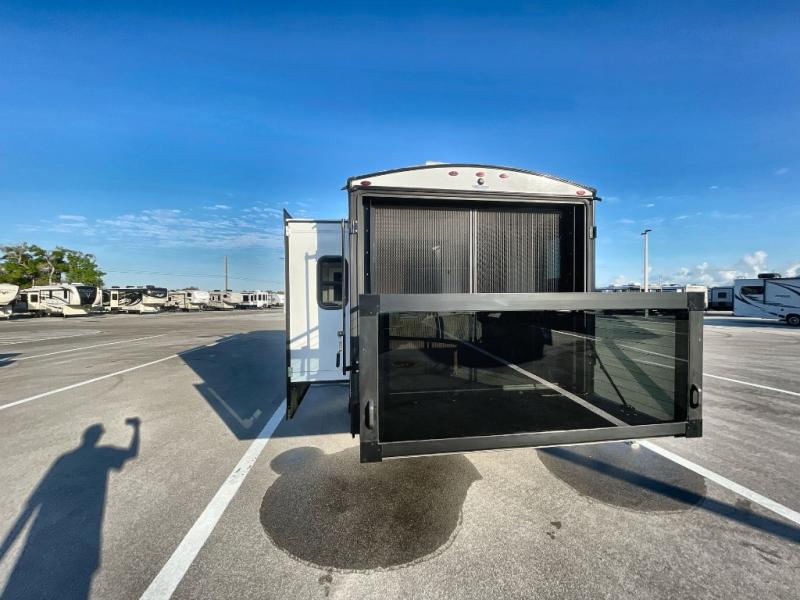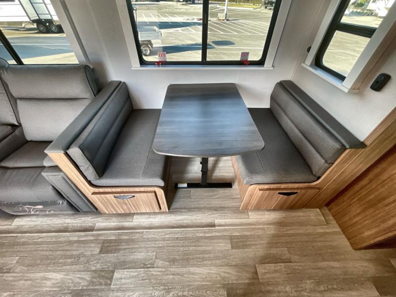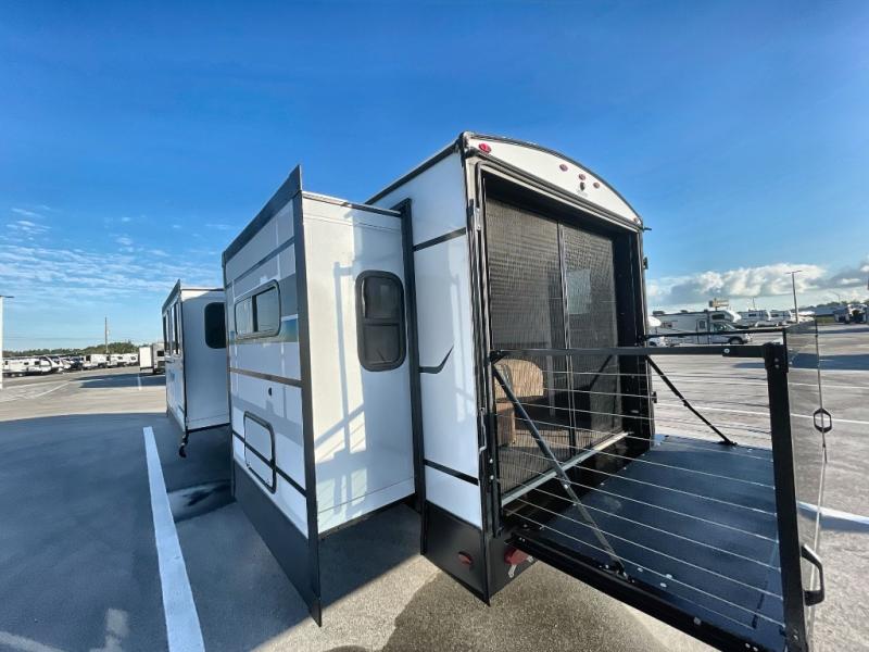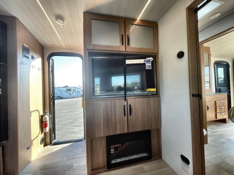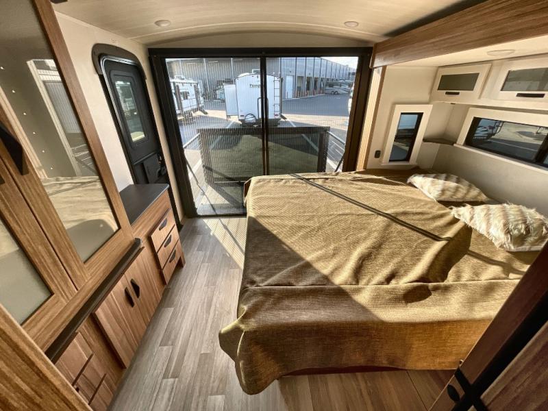 Camping in this travel trailer will feel just like home thanks to its double slides giving you more space and the rear fold-out balcony where you can enjoy evenings outdoors! The bedroom includes a king bed slide, dresser, wardrobe, and one of the dual entry doors for added convenience. A walk-thru bath will lead you to the living area and front kitchen where you can dine at the booth dinette or relax on the luxury cinema theater seating. There is also an entertainment center here and a fireplace. The chef of your group will love the generous counter space in the front kitchen, along with the large pantry to keep dry goods and snacks stocked. Head outdoors to enjoy the outside kitchen with a griddle, then grab your fishing poles from the pass-thru storage and head to the lake!