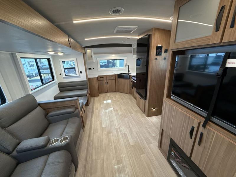 Camping in this travel trailer will feel just like home thanks to its double slides giving you more space and the rear fold-out balcony where you can enjoy evenings outdoors! The bedroom includes a king bed slide, dresser, wardrobe, and one of the dual entry doors for added convenience. A walk-thru bath will lead you to the living area and front kitchen where you can dine at the booth dinette or relax on the luxury cinema theater seating. There is also an entertainment center here and a fireplace. The chef of your group will love the generous counter space in the front kitchen, along with the large pantry to keep dry goods and snacks stocked. Head outdoors to enjoy the outside kitchen with a griddle, then grab your fishing poles from the pass-thru storage and head to the lake!