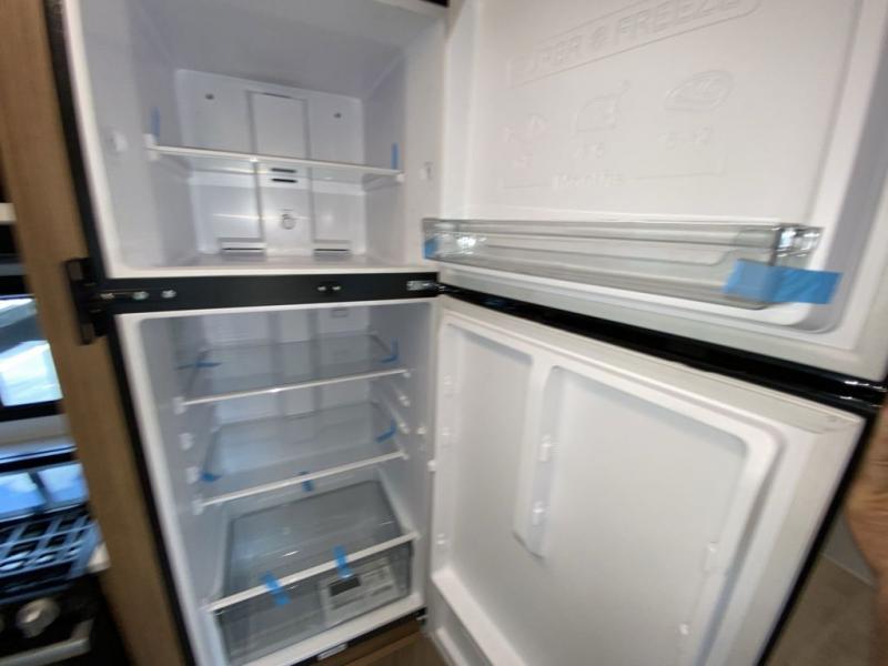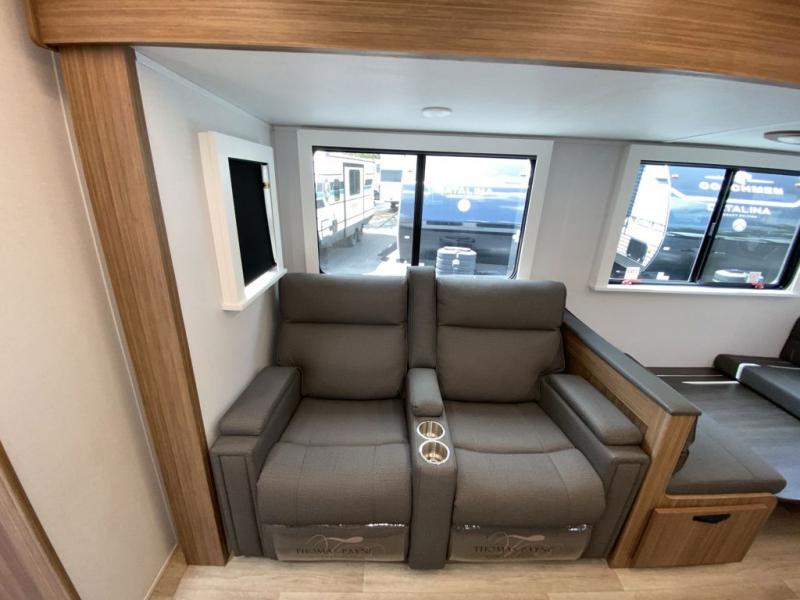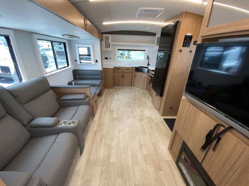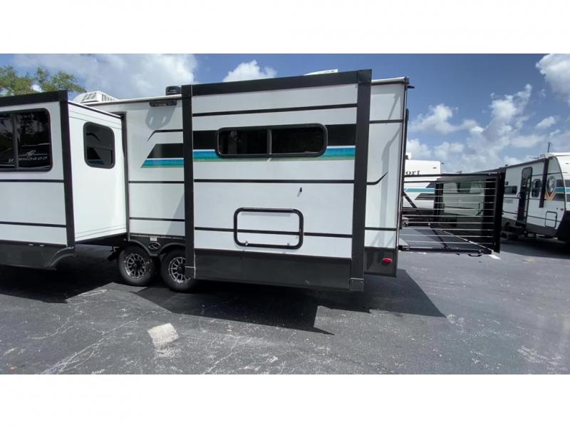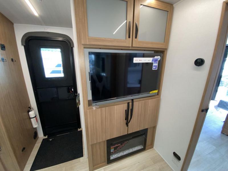 Camping in this travel trailer will feel just like home thanks to its double slides giving you more space and the rear fold-out balcony where you can enjoy evenings outdoors! The bedroom includes a king bed slide, dresser, wardrobe, and one of the dual entry doors for added convenience. A walk-thru bath will lead you to the living area and front kitchen where you can dine at the booth dinette or relax on the luxury cinema theater seating. There is also an entertainment center here and a fireplace. The chef of your group will love the generous counter space in the front kitchen, along with the large pantry to keep dry goods and snacks stocked. Head outdoors to enjoy the outside kitchen with a griddle, then grab your fishing poles from the pass-thru storage and head to the lake!