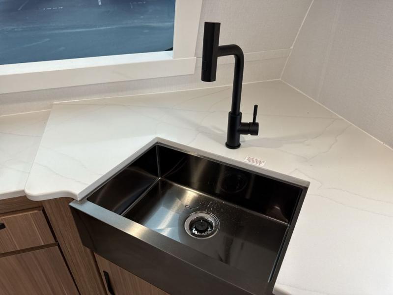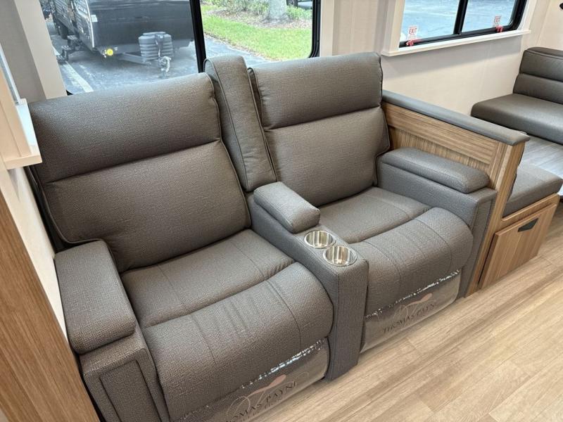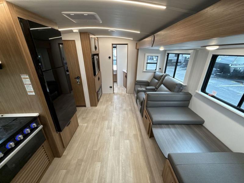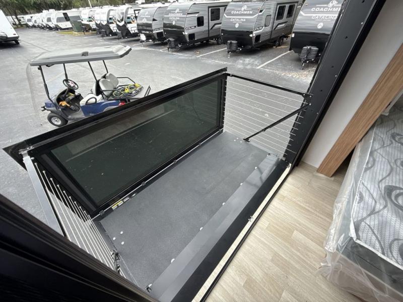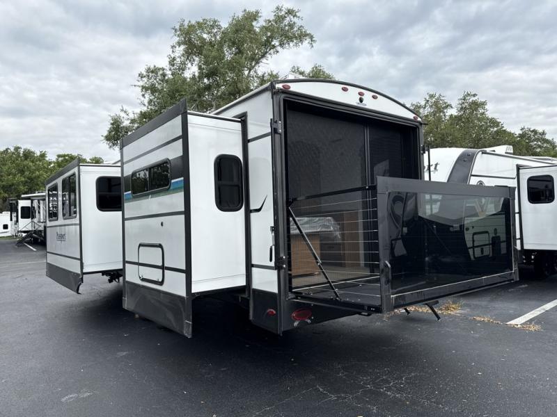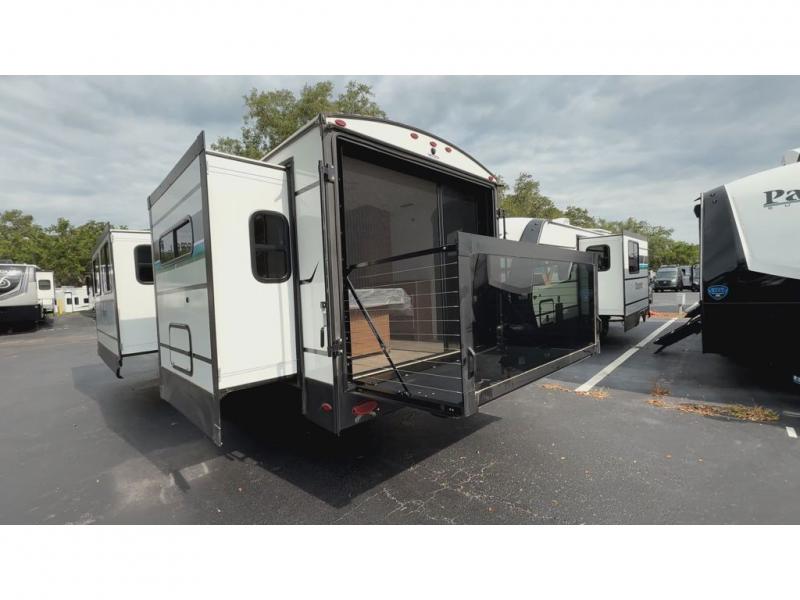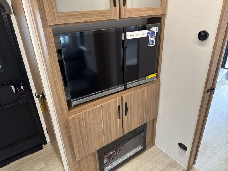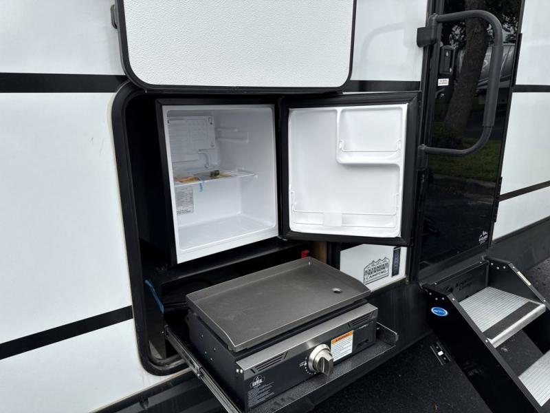 Camping in this travel trailer will feel just like home thanks to its double slides giving you more space and the rear fold-out balcony where you can enjoy evenings outdoors! The bedroom includes a king bed slide, dresser, wardrobe, and one of the dual entry doors for added convenience. A walk-thru bath will lead you to the living area and front kitchen where you can dine at the booth dinette or relax on the luxury cinema theater seating. There is also an entertainment center here and a fireplace. The chef of your group will love the generous counter space in the front kitchen, along with the large pantry to keep dry goods and snacks stocked. Head outdoors to enjoy the outside kitchen with a griddle, then grab your fishing poles from the pass-thru storage and head to the lake!