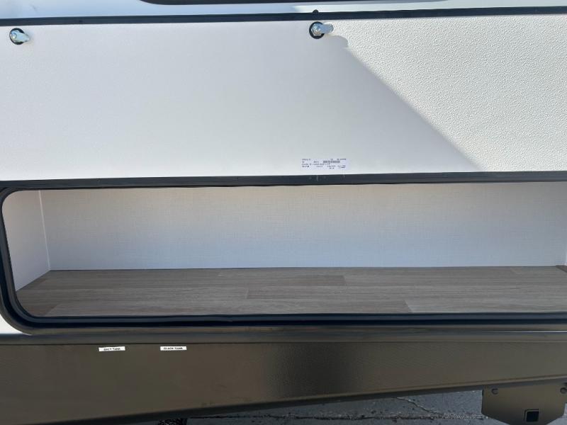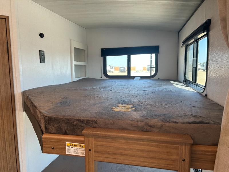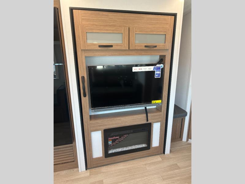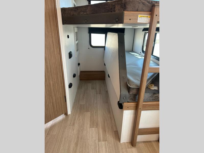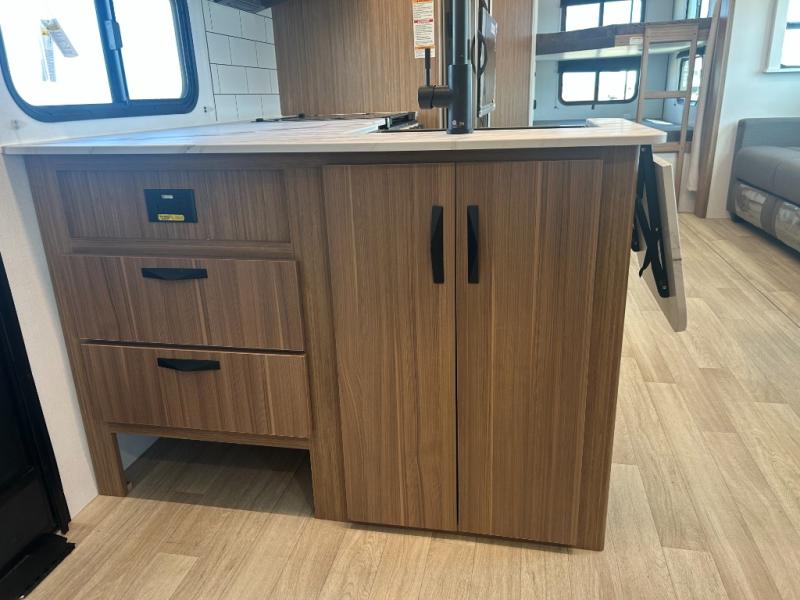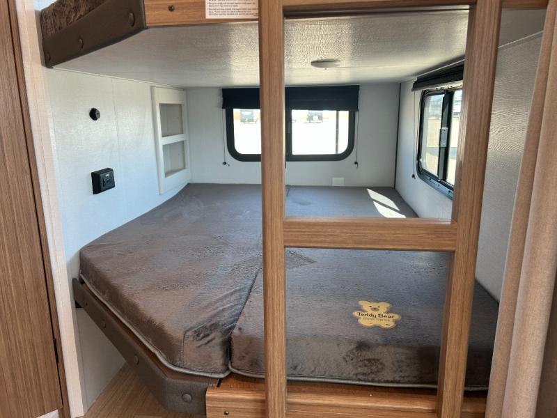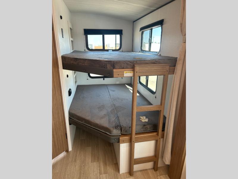 Camping at your favorite campground in this bunkhouse model will be just what the doctor ordered! One of the bunks is a flip-up bunk for added storage, and the full bath with its own exterior entry door is close by for easy nighttime use. The combined living area and kitchen is made spacious by the large slide out, and here you can relax on the tri-fold sofa and Do-more dinette table. There is also an entertainment center with a fireplace to make this space feel a little more like home. The chef of your group can choose to cook indoors or outdoors on the exterior kitchen, and there is a 21' awning for shade. This unit also includes a front private bedroom with a queen bed and dual wardrobes to keep your things tidy.