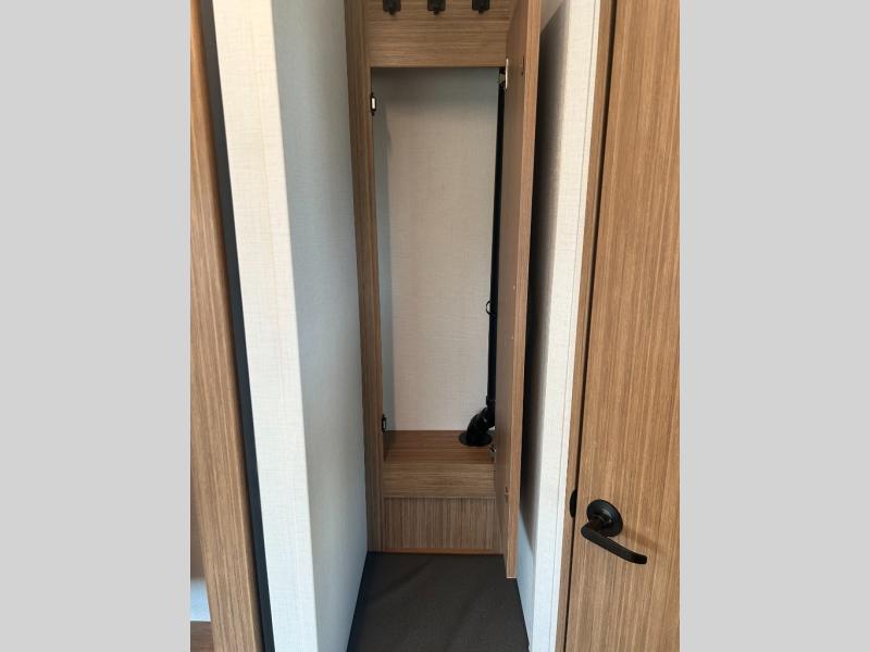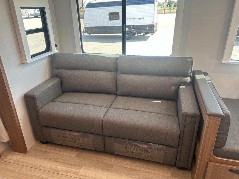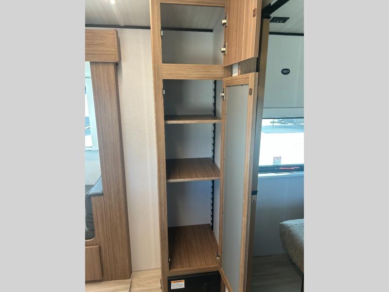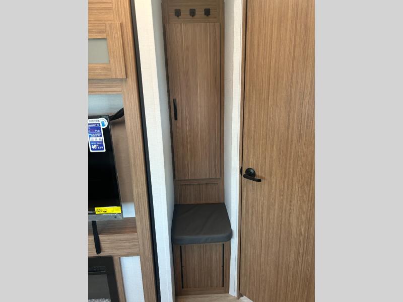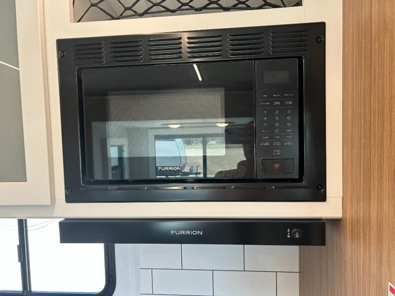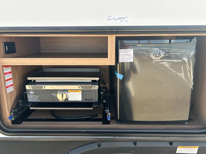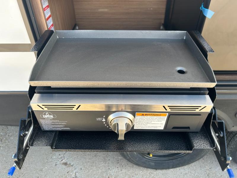 Camping at your favorite campground in this bunkhouse model will be just what the doctor ordered! One of the bunks is a flip-up bunk for added storage, and the full bath with its own exterior entry door is close by for easy nighttime use. The combined living area and kitchen is made spacious by the large slide out, and here you can relax on the tri-fold sofa and Do-more dinette table. There is also an entertainment center with a fireplace to make this space feel a little more like home. The chef of your group can choose to cook indoors or outdoors on the exterior kitchen, and there is a 21' awning for shade. This unit also includes a front private bedroom with a queen bed and dual wardrobes to keep your things tidy.