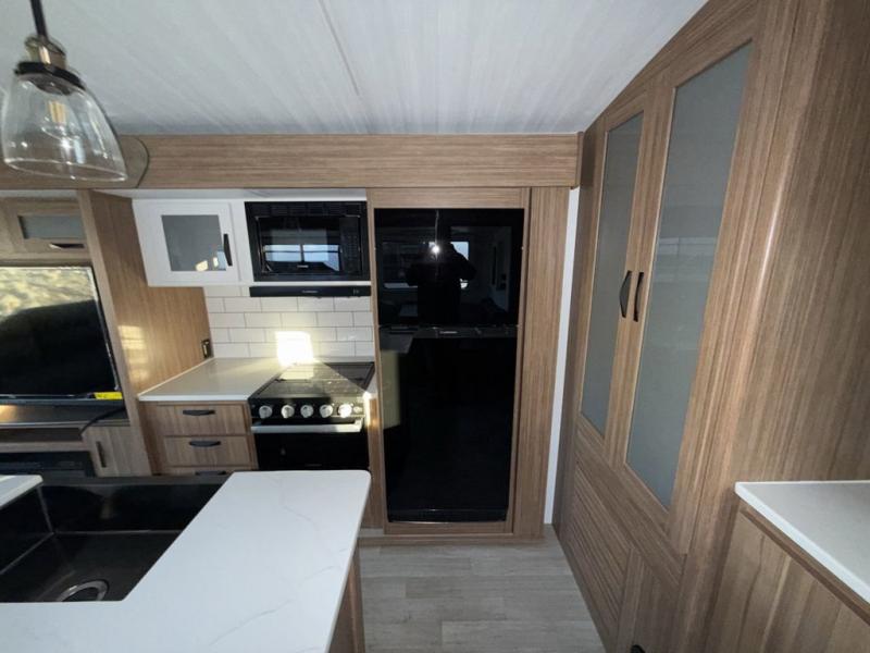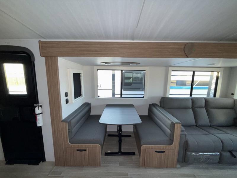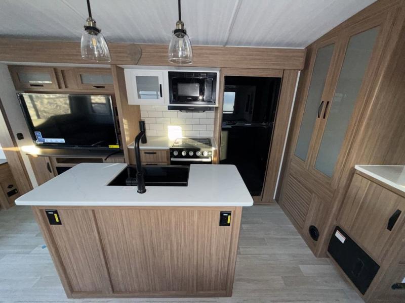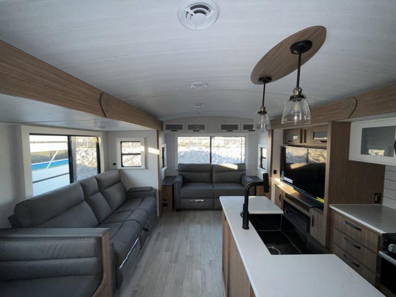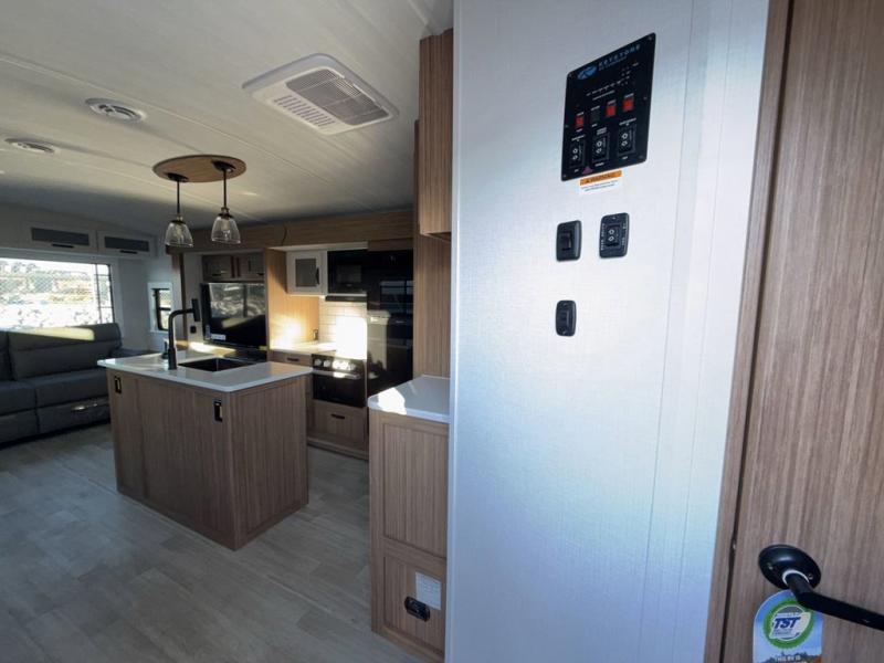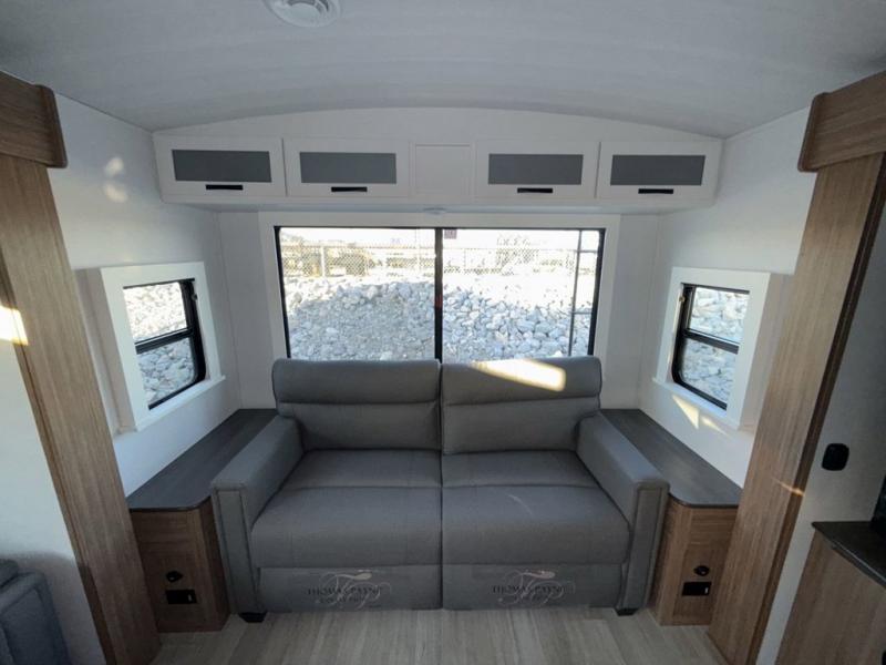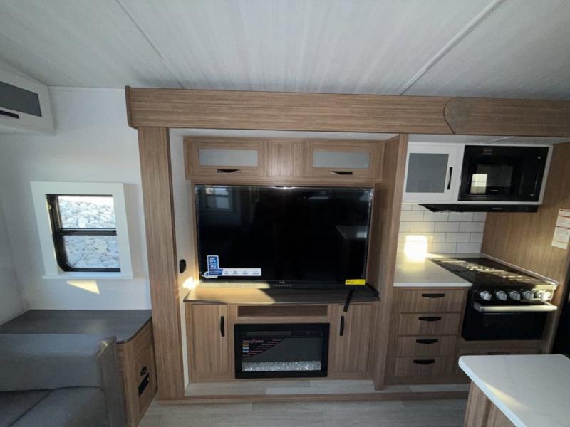 You will feel right at home in this travel trailer! The front private bedroom has a king bed slide to lay your head on at night, a front closet with washer and dryer prep, and a wardrobe with TV prep. Just outside the bedroom is the full bathroom with a shower with a skylight for added natural lighting as you get ready. Now that you're ready for the day, you can head to the fully equipped kitchen complete with a kitchen island to whip up some delicious cinnamon rolls that can be enjoyed at the Do-More Dinette table. The rear living area not only has luxury cinema recliners, but also a 68" tri-fold sofa by an entertainment center with a fireplace!