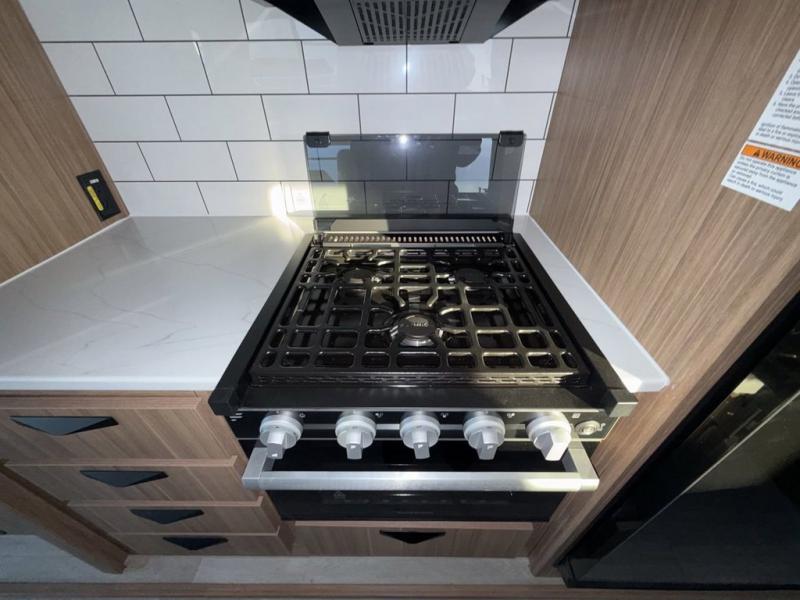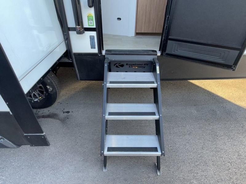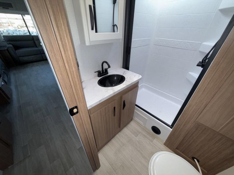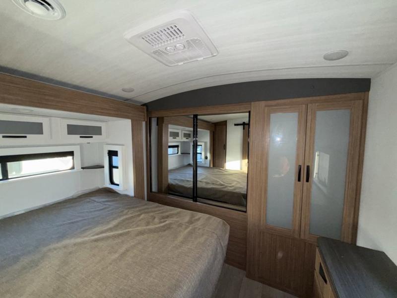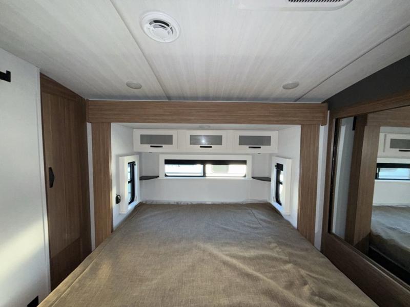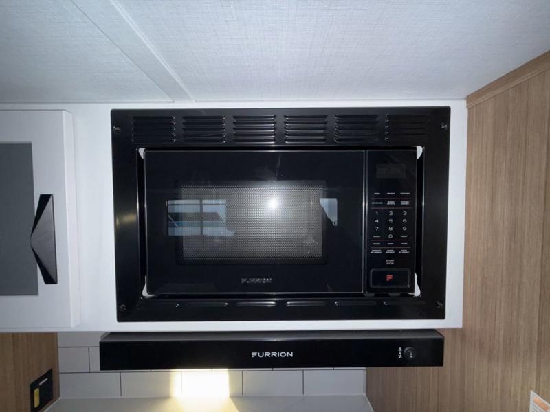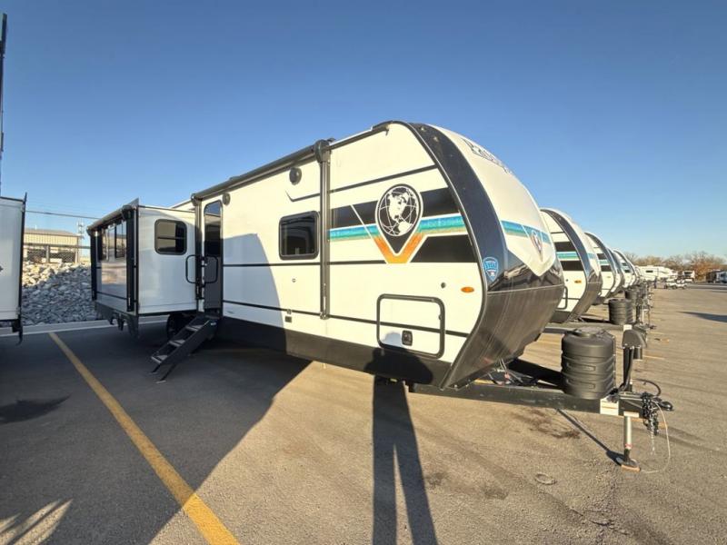 You will feel right at home in this travel trailer! The front private bedroom has a king bed slide to lay your head on at night, a front closet with washer and dryer prep, and a wardrobe with TV prep. Just outside the bedroom is the full bathroom with a shower with a skylight for added natural lighting as you get ready. Now that you're ready for the day, you can head to the fully equipped kitchen complete with a kitchen island to whip up some delicious cinnamon rolls that can be enjoyed at the Do-More Dinette table. The rear living area not only has luxury cinema recliners, but also a 68" tri-fold sofa by an entertainment center with a fireplace!