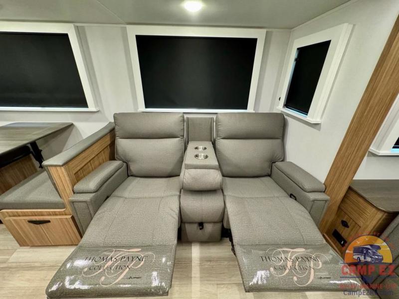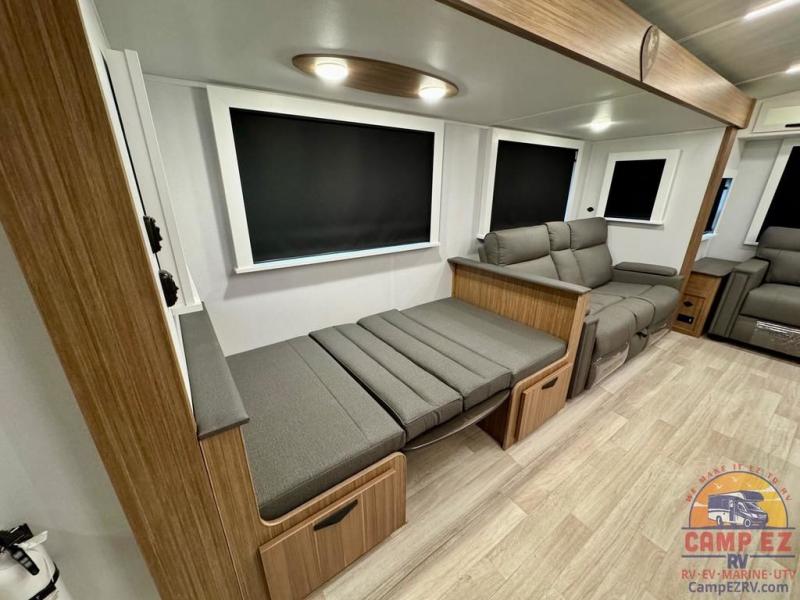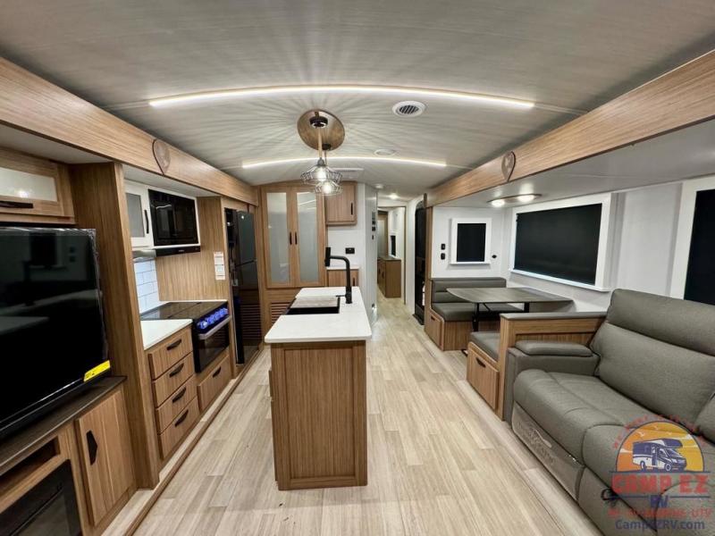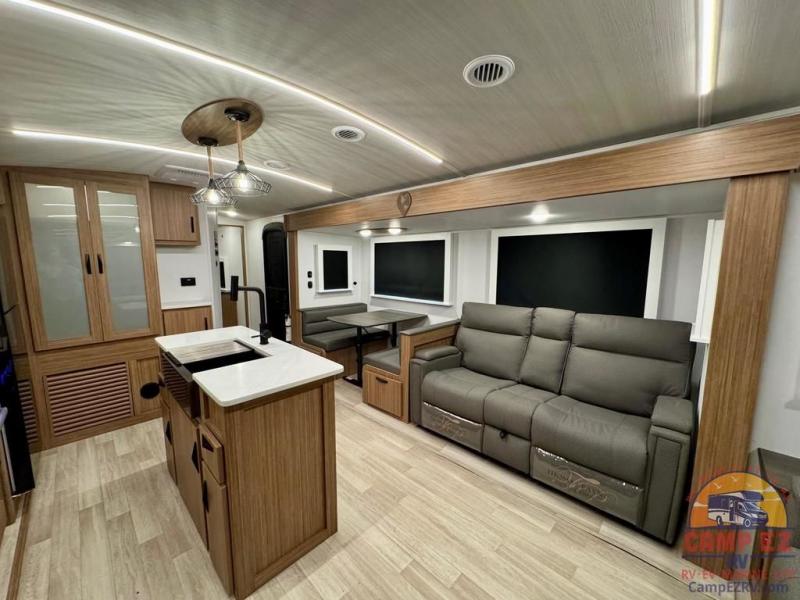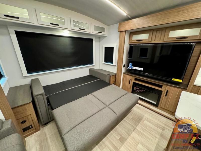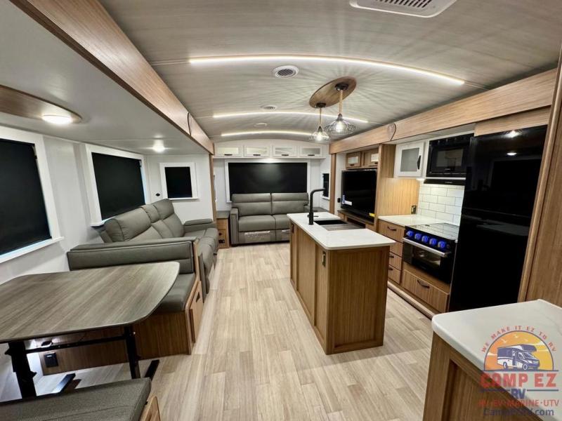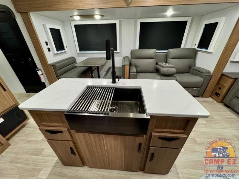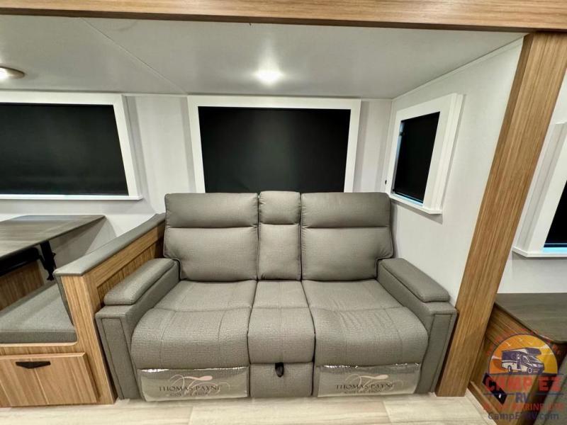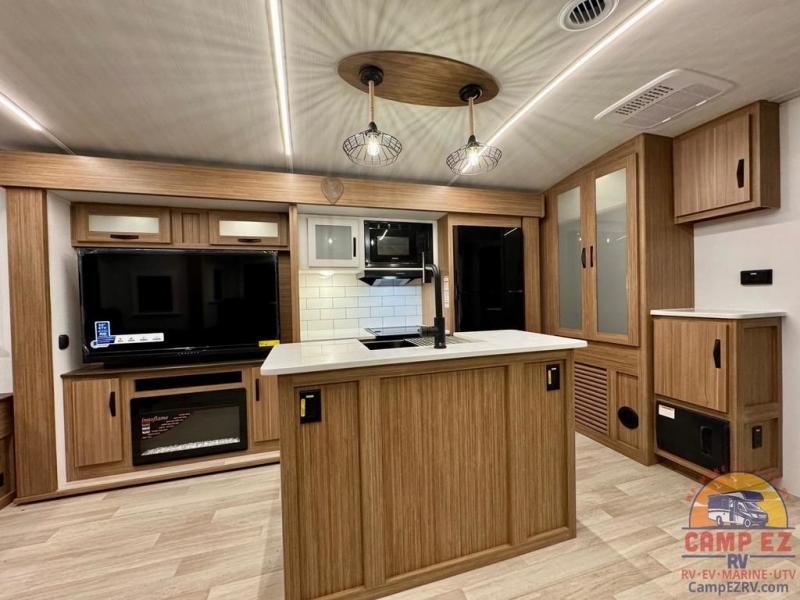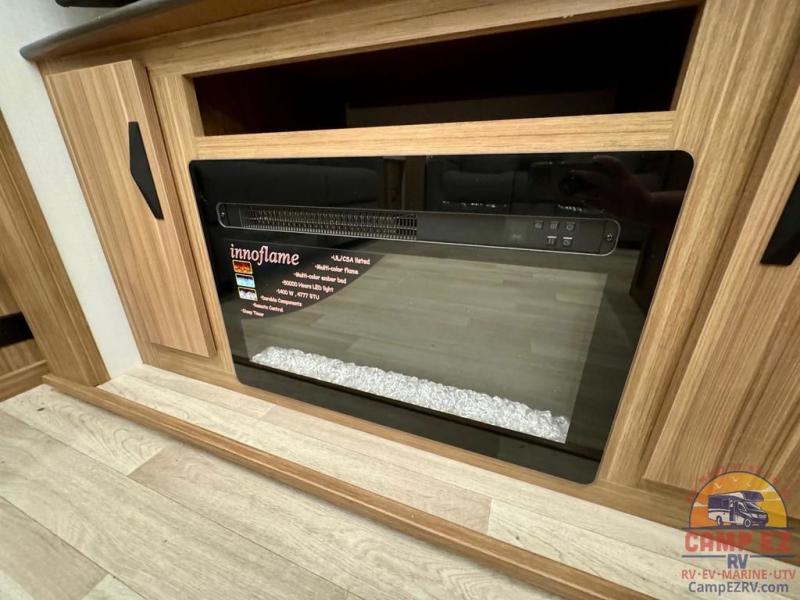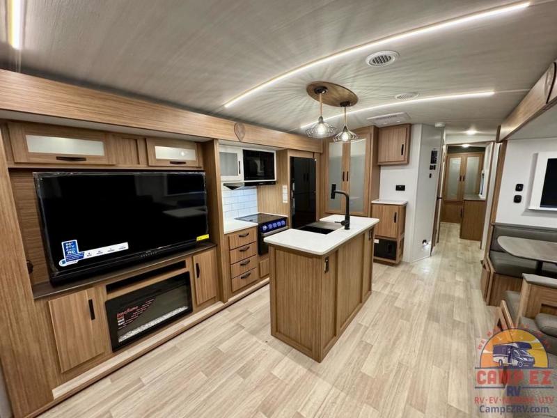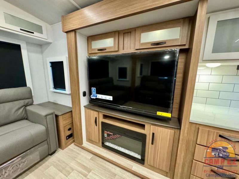 You will feel right at home in this travel trailer! The front private bedroom has a king bed slide to lay your head on at night, a front closet with washer and dryer prep, and a wardrobe with TV prep. Just outside the bedroom is the full bathroom with a shower with a skylight for added natural lighting as you get ready. Now that you're ready for the day, you can head to the fully equipped kitchen complete with a kitchen island to whip up some delicious cinnamon rolls that can be enjoyed at the Do-More Dinette table. The rear living area not only has luxury cinema recliners, but also a 68" tri-fold sofa by an entertainment center with a fireplace!