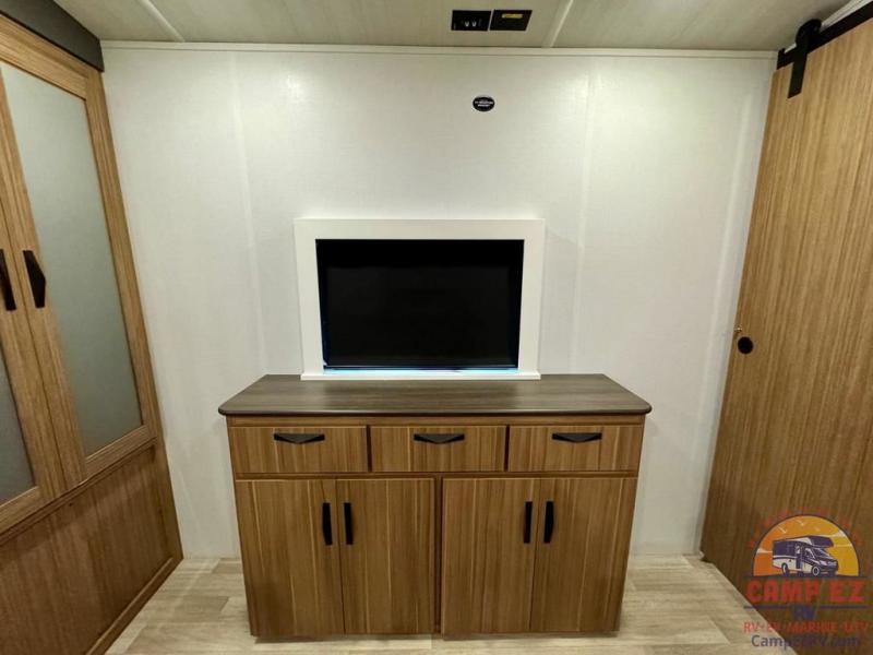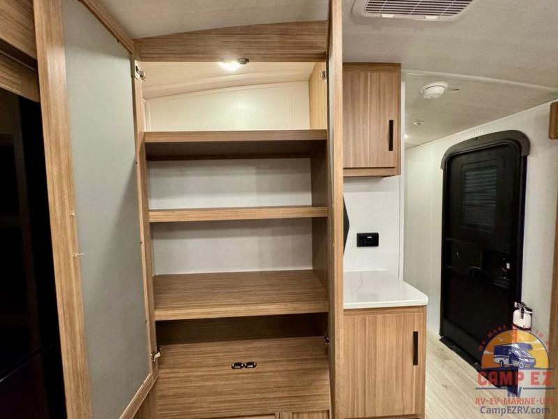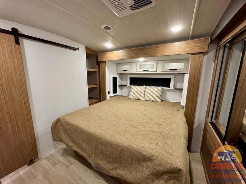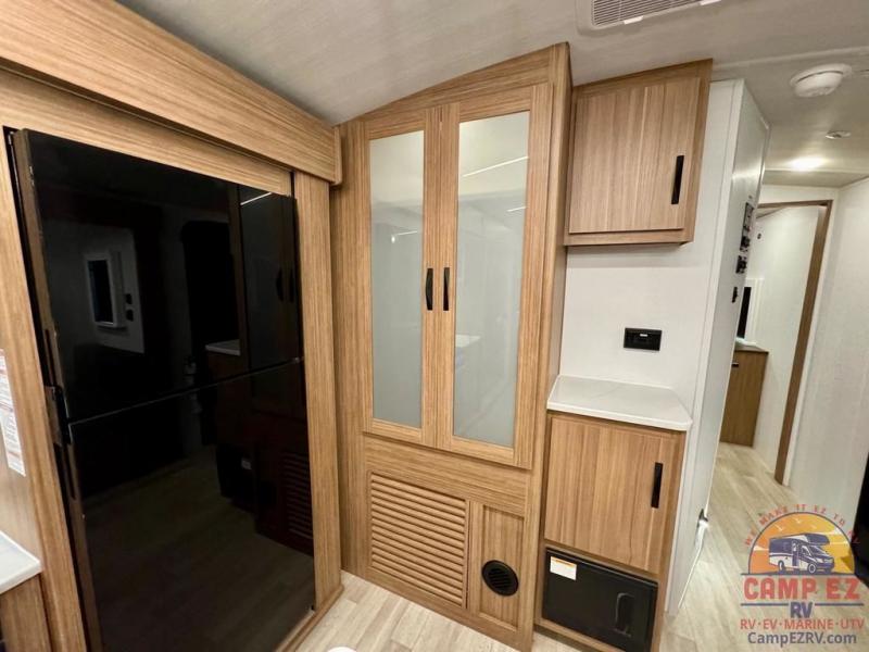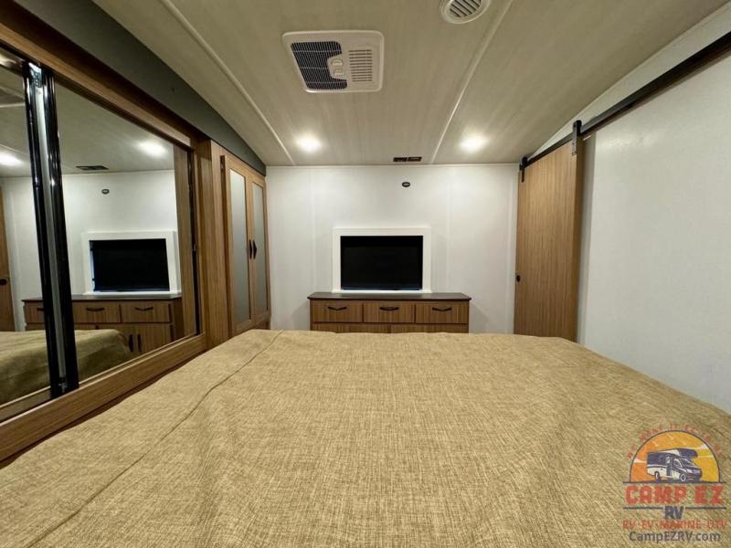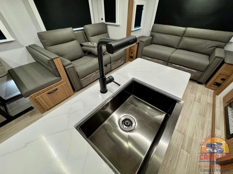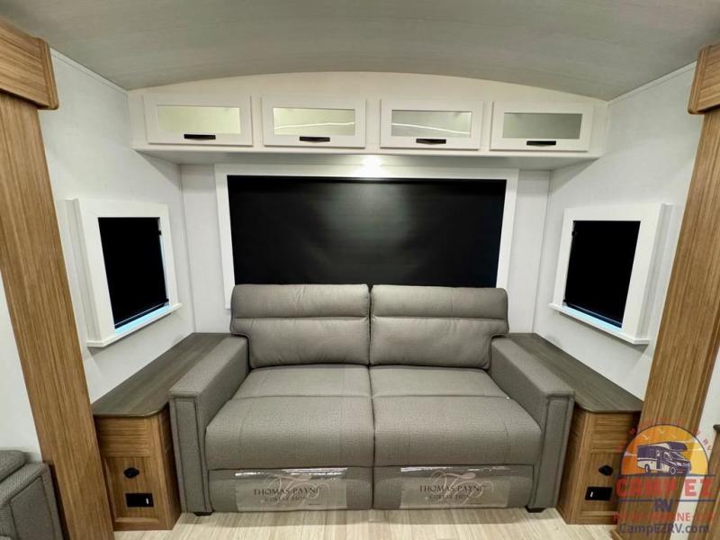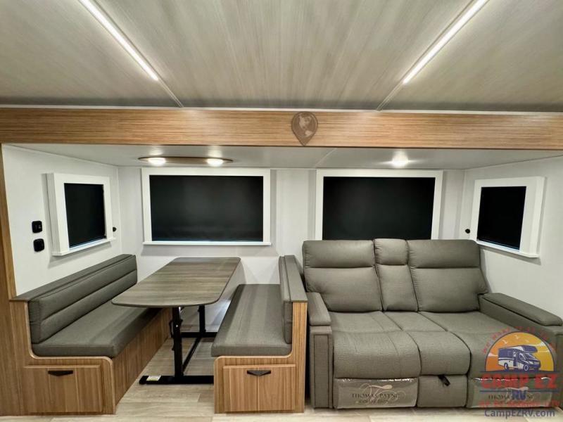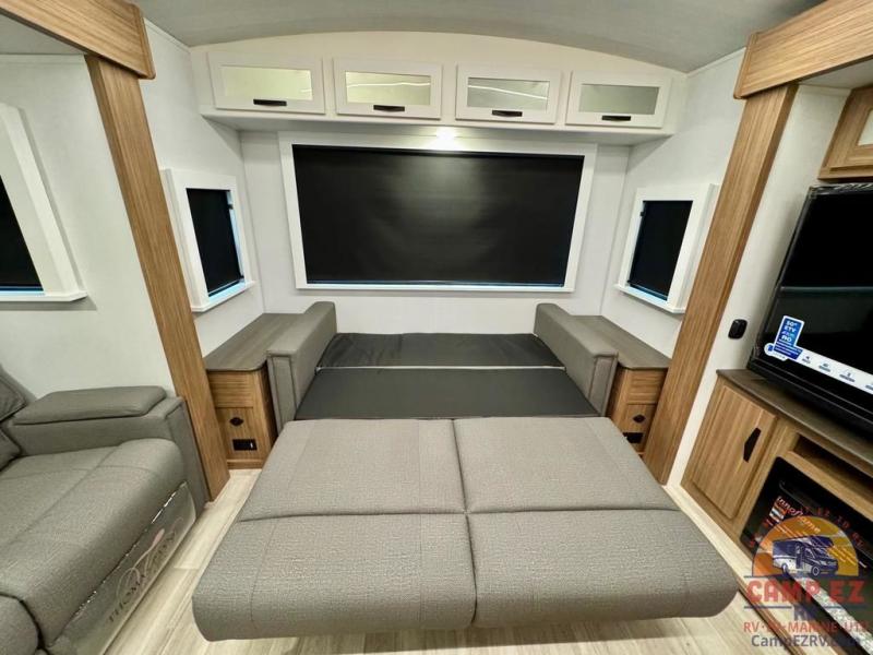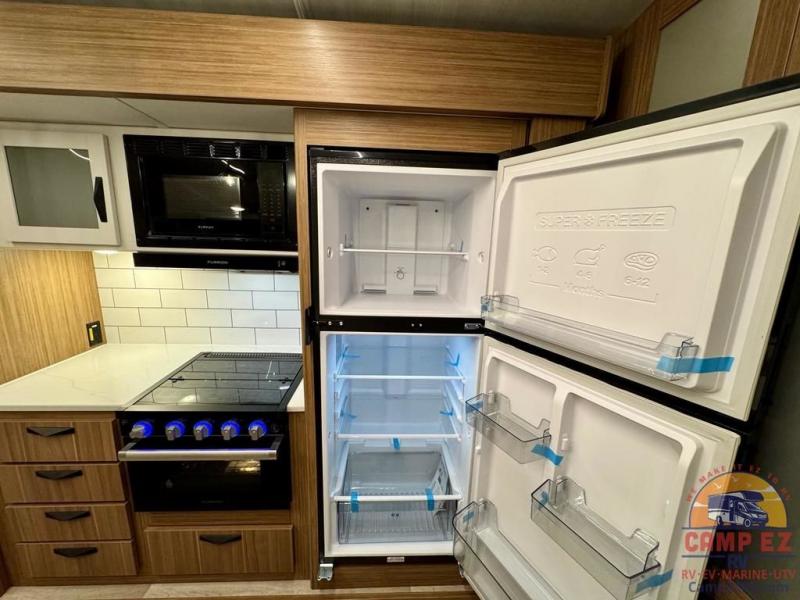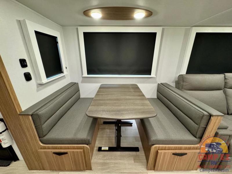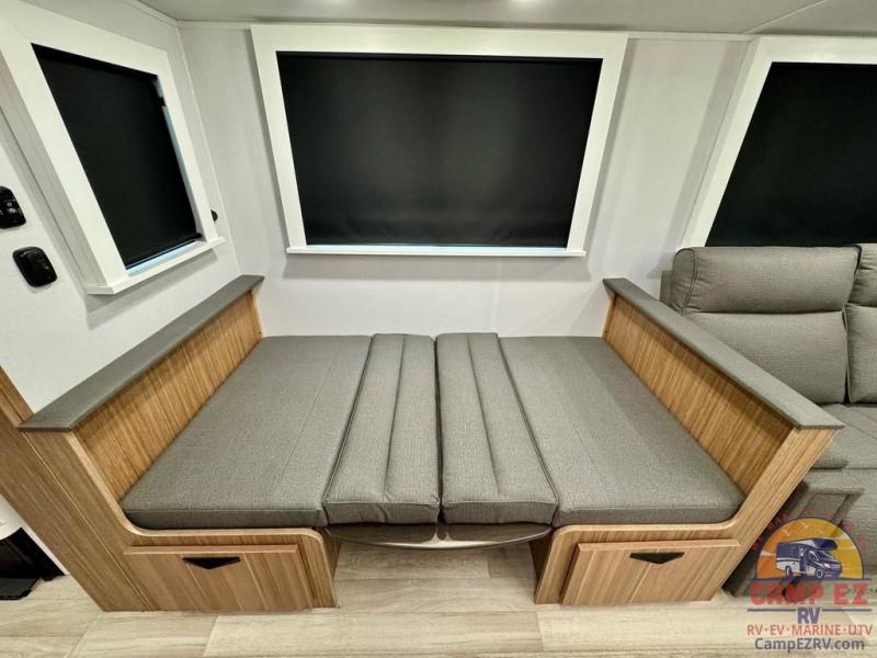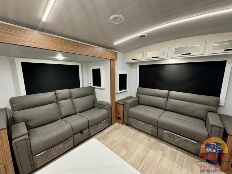 You will feel right at home in this travel trailer! The front private bedroom has a king bed slide to lay your head on at night, a front closet with washer and dryer prep, and a wardrobe with TV prep. Just outside the bedroom is the full bathroom with a shower with a skylight for added natural lighting as you get ready. Now that you're ready for the day, you can head to the fully equipped kitchen complete with a kitchen island to whip up some delicious cinnamon rolls that can be enjoyed at the Do-More Dinette table. The rear living area not only has luxury cinema recliners, but also a 68" tri-fold sofa by an entertainment center with a fireplace!