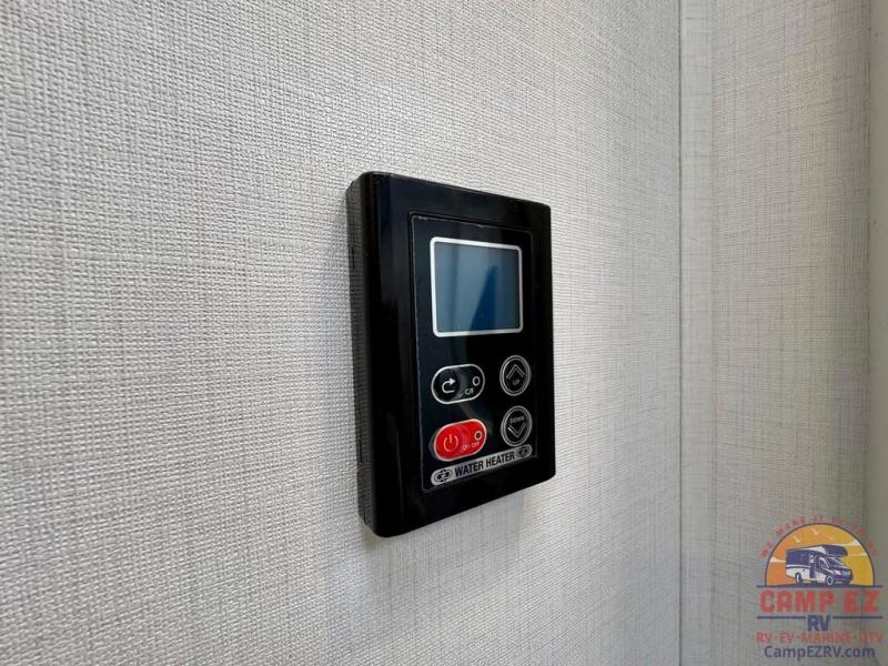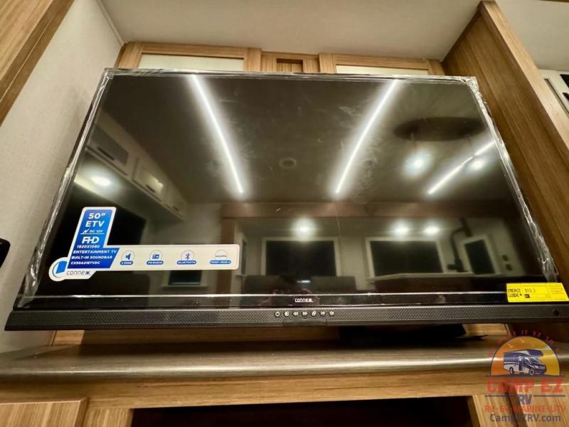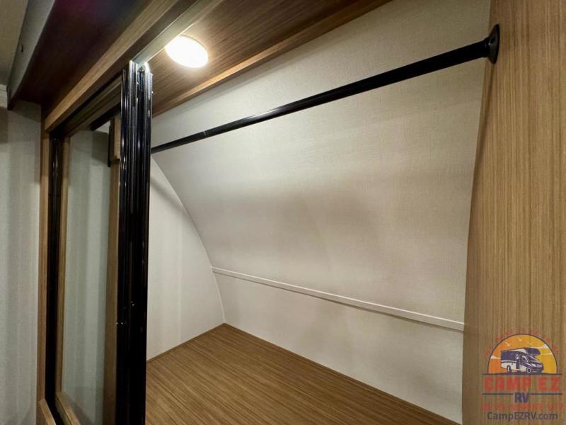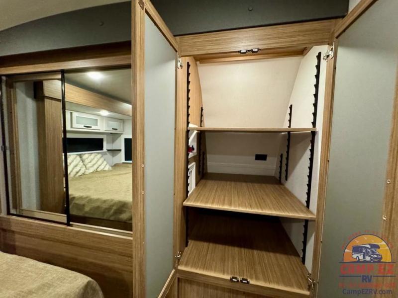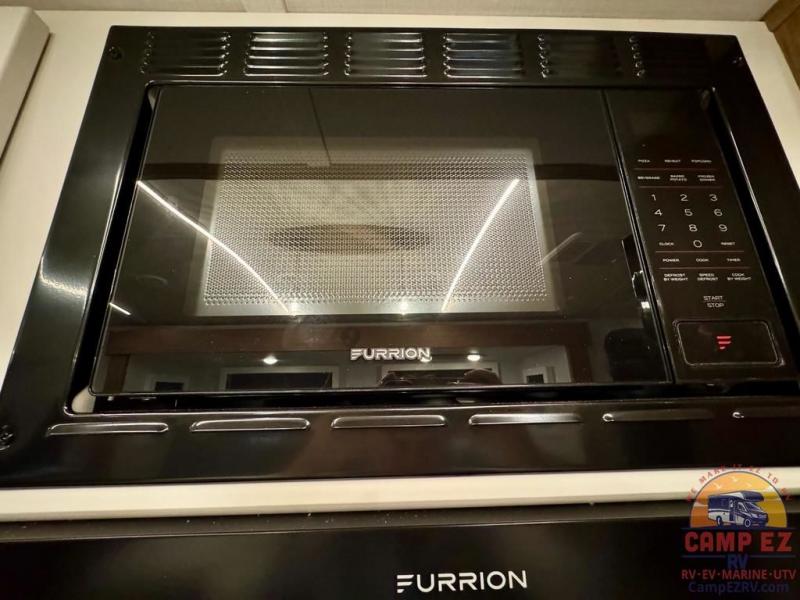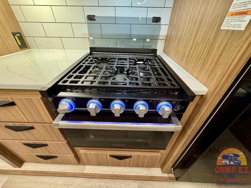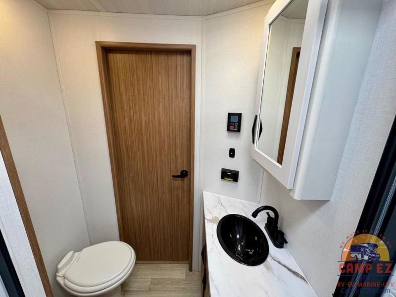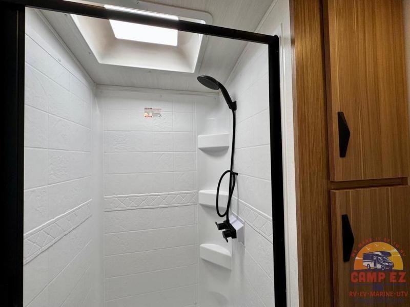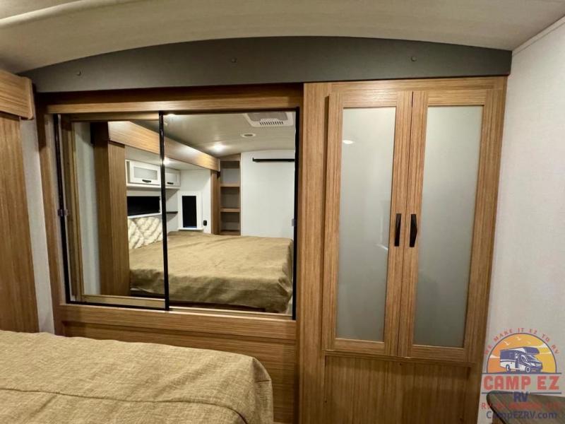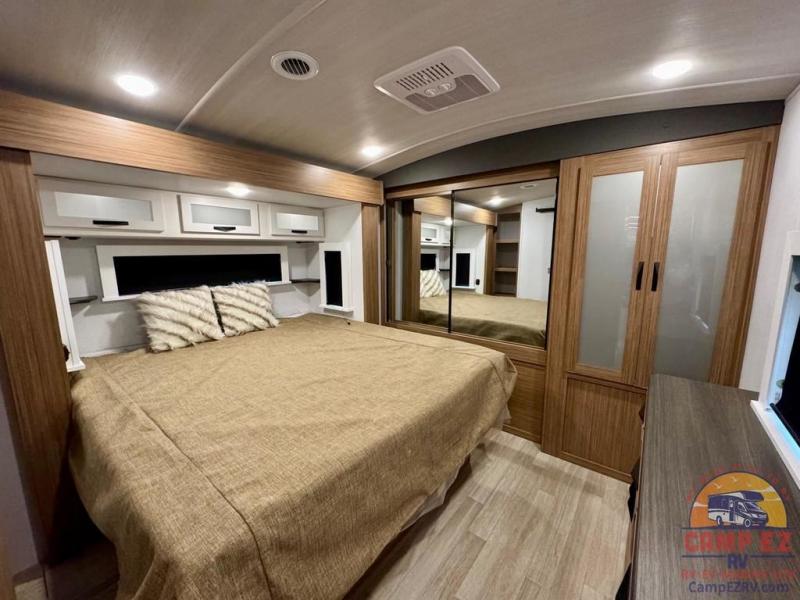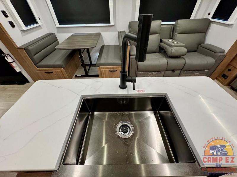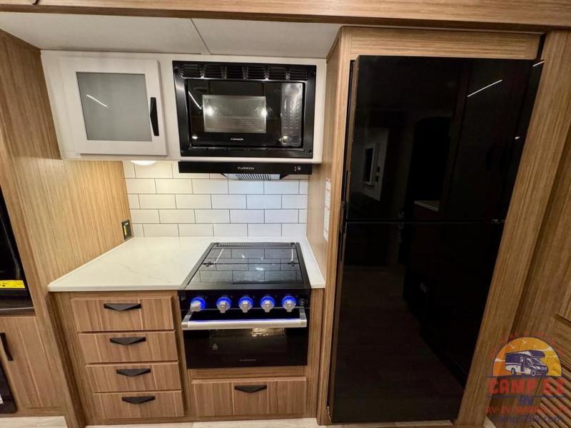 You will feel right at home in this travel trailer! The front private bedroom has a king bed slide to lay your head on at night, a front closet with washer and dryer prep, and a wardrobe with TV prep. Just outside the bedroom is the full bathroom with a shower with a skylight for added natural lighting as you get ready. Now that you're ready for the day, you can head to the fully equipped kitchen complete with a kitchen island to whip up some delicious cinnamon rolls that can be enjoyed at the Do-More Dinette table. The rear living area not only has luxury cinema recliners, but also a 68" tri-fold sofa by an entertainment center with a fireplace!