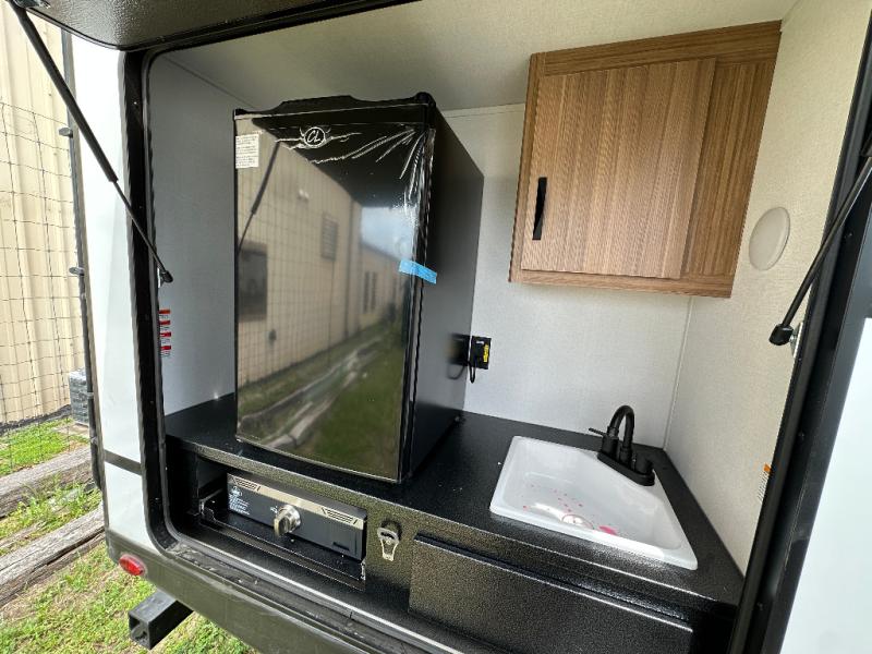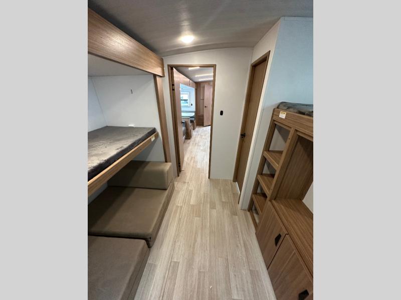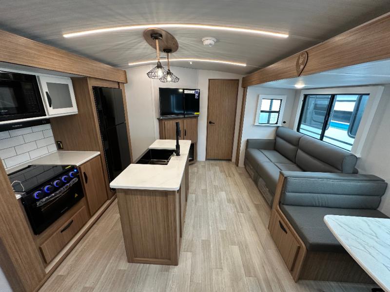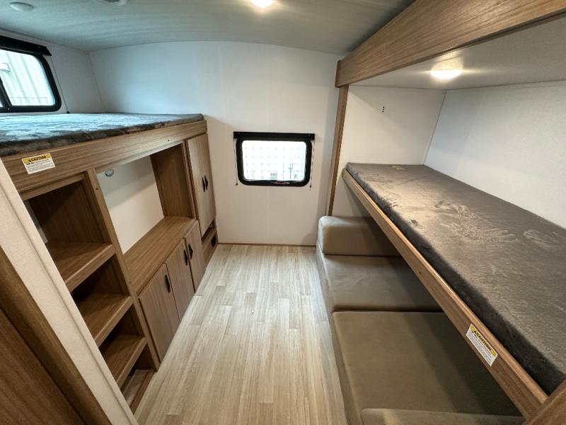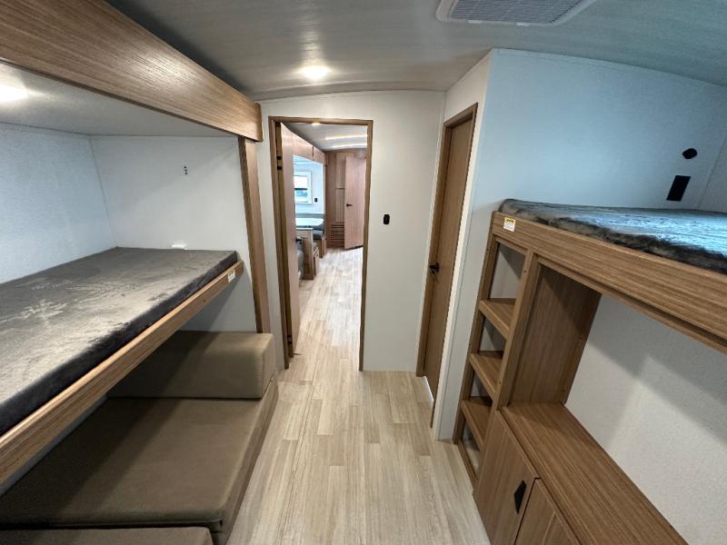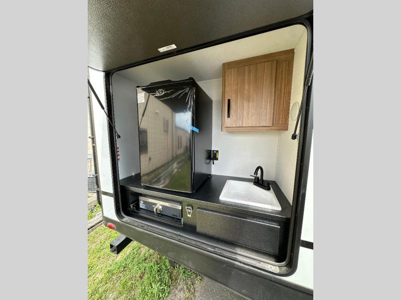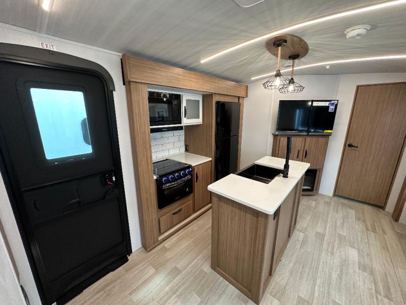 You won't believe all that this travel trailer has to offer! Starting with the rear private bunkhouse which has a 28" x 74" flip-up bunk above a 68" tri-fold sofa, a 51" x 74" bunk above an entertainment center, and even a half bathroom which has one of the dual entry doors to the unit. The front private bedroom has a queen bed to lay your head on at night with wardrobes on either side. As you exit the bedroom, you will enter the walk-through bathroom. Now that you're ready for the day, you can head to the fully equipped kitchen complete with a kitchen island to whip up some delicious cinnamon rolls that can be enjoyed at the Do-More dinette table. You even have an outside kitchen with a capital grill, a 4.4 cu. ft. refrigerator, and a sink!