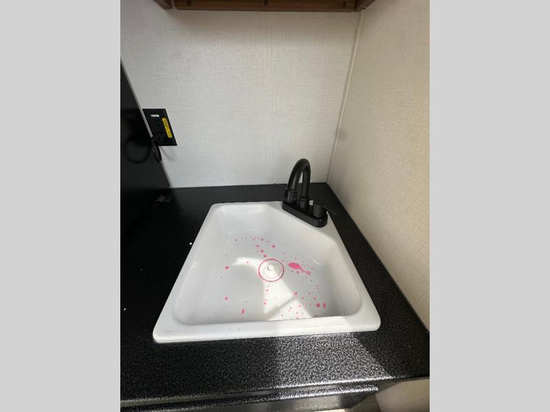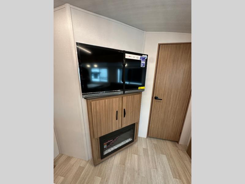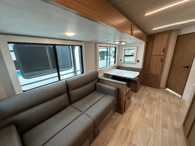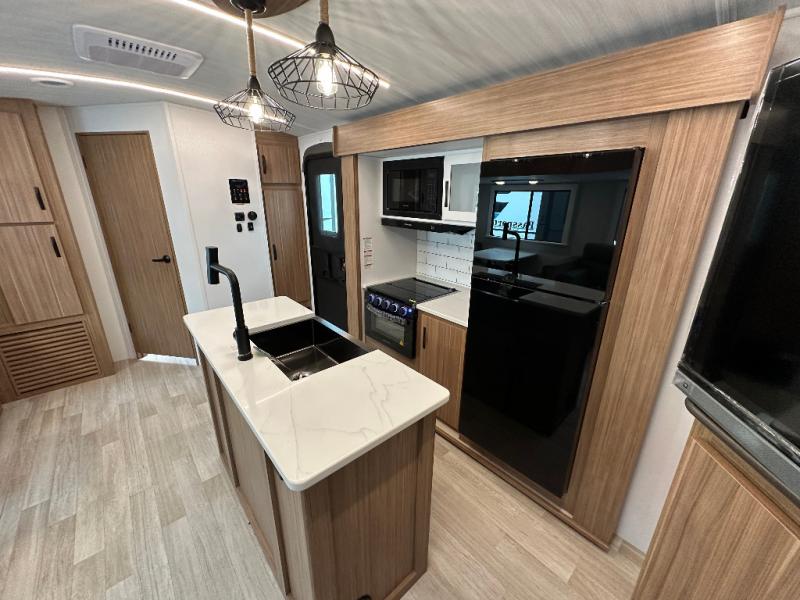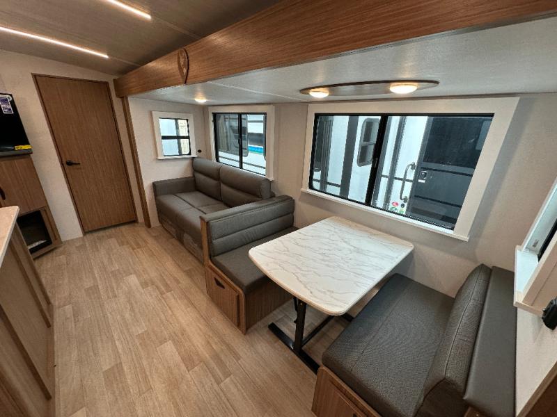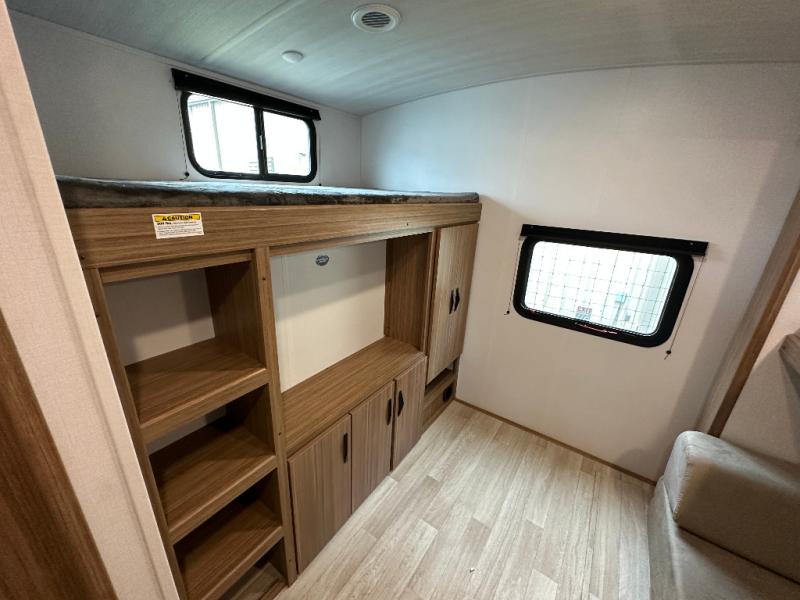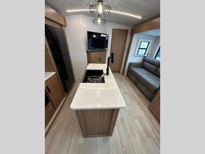 You won't believe all that this travel trailer has to offer! Starting with the rear private bunkhouse which has a 28" x 74" flip-up bunk above a 68" tri-fold sofa, a 51" x 74" bunk above an entertainment center, and even a half bathroom which has one of the dual entry doors to the unit. The front private bedroom has a queen bed to lay your head on at night with wardrobes on either side. As you exit the bedroom, you will enter the walk-through bathroom. Now that you're ready for the day, you can head to the fully equipped kitchen complete with a kitchen island to whip up some delicious cinnamon rolls that can be enjoyed at the Do-More dinette table. You even have an outside kitchen with a capital grill, a 4.4 cu. ft. refrigerator, and a sink!