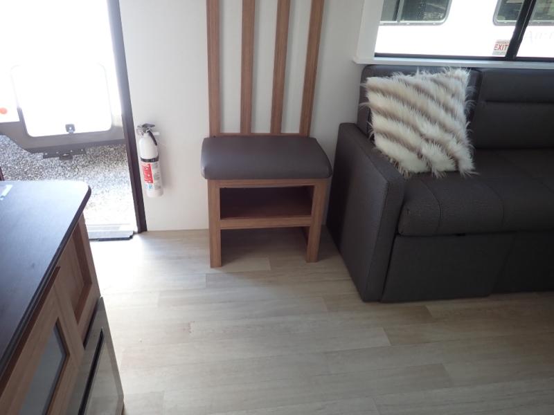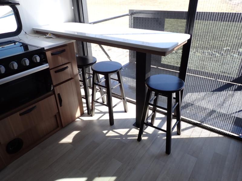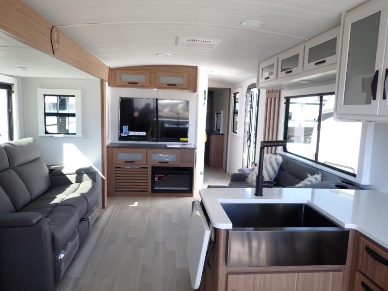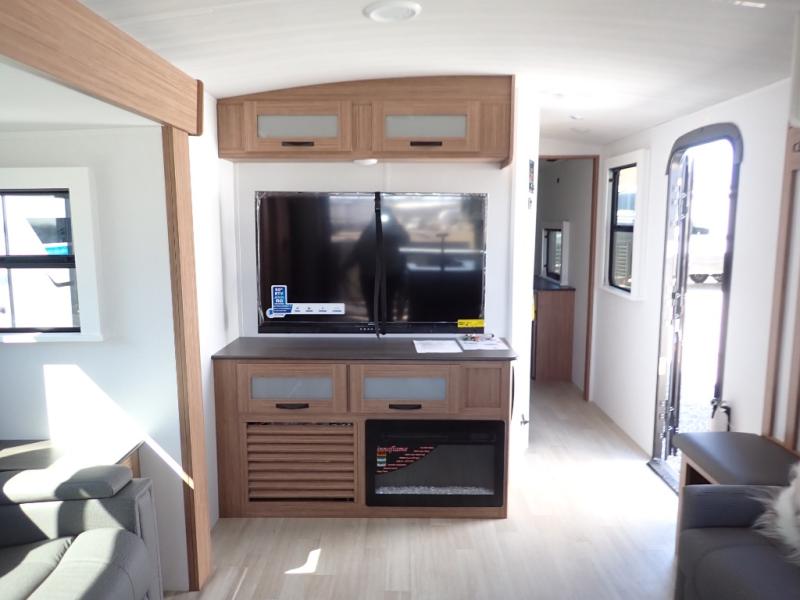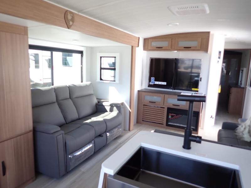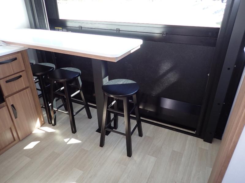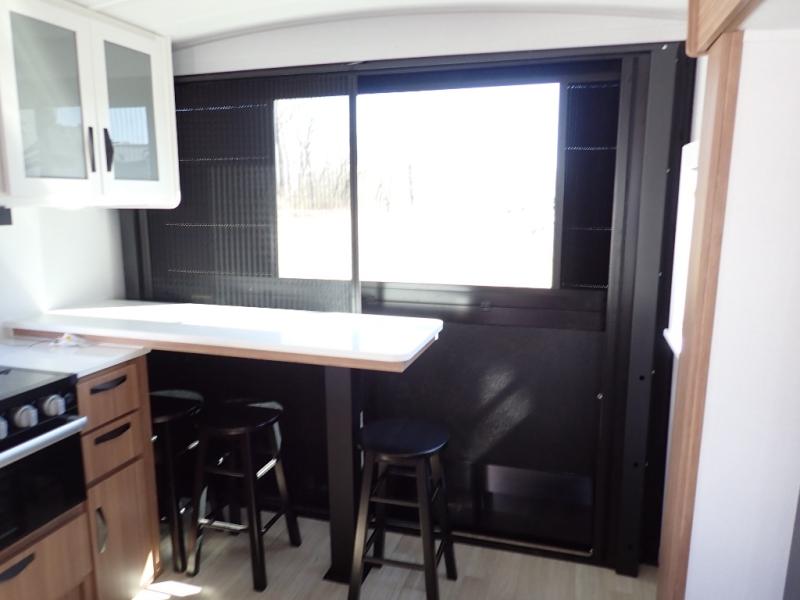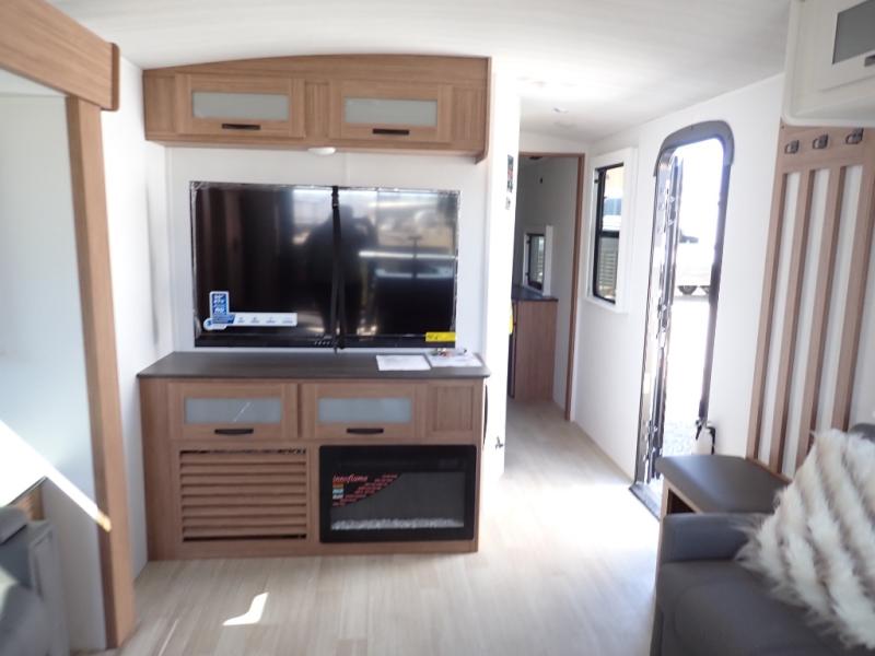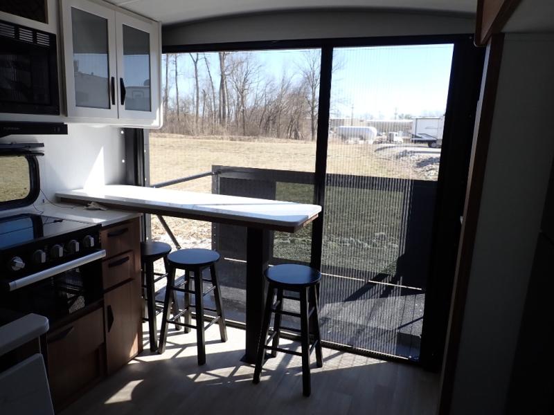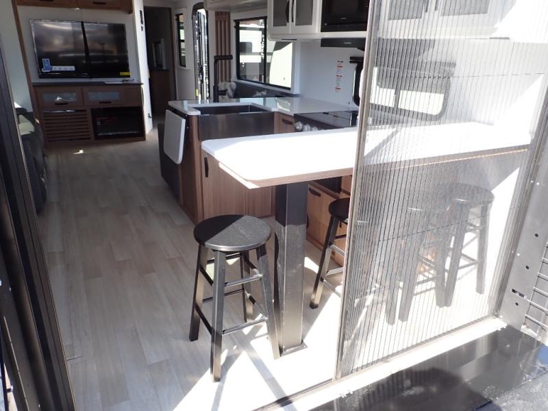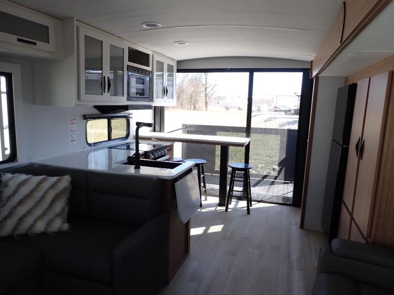 It will be so easy to enjoy trips in this double slide out travel trailer! Once you arrive at your campsite, you can set up the 21' awning, unload the pass-thru storage, then relax on the rear balcony! Head inside to make lunch in the U-shaped kitchen area that includes a bar top with stools and a flip-up counter extension for more prep space. The large slide out here houses the theater seating with a flip-up end table, plus the pantry and 12V refrigerator. Across the room is an L-shaped sectional sofa for more seating, along with an entryway bench/storage where you can sit to pull your hiking boots on. A full bath will let you freshen up each day, and the front private bedroom will give you your own space at night. There is a king bed slide out, two closets, a dresser with TV prep, plus washer and dryer prep if you want to add those appliances!