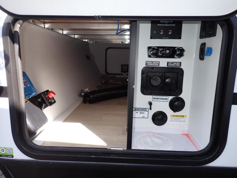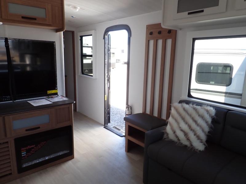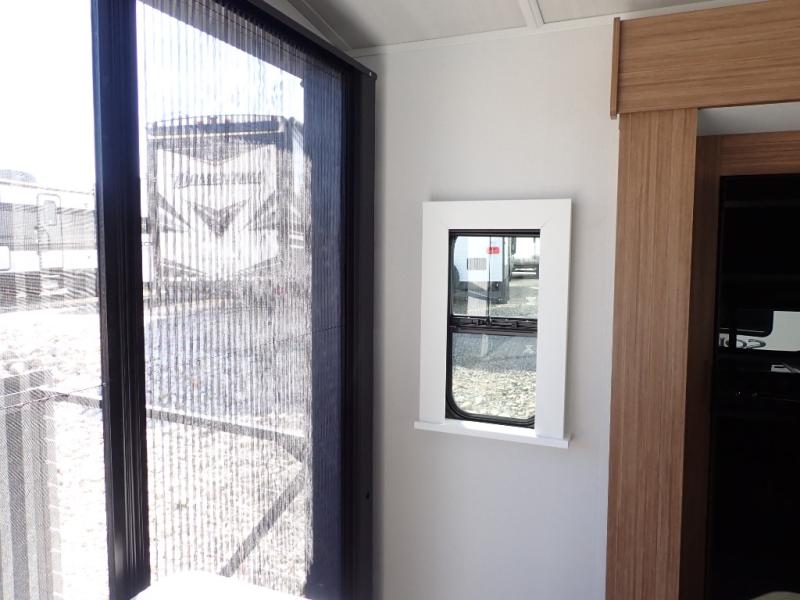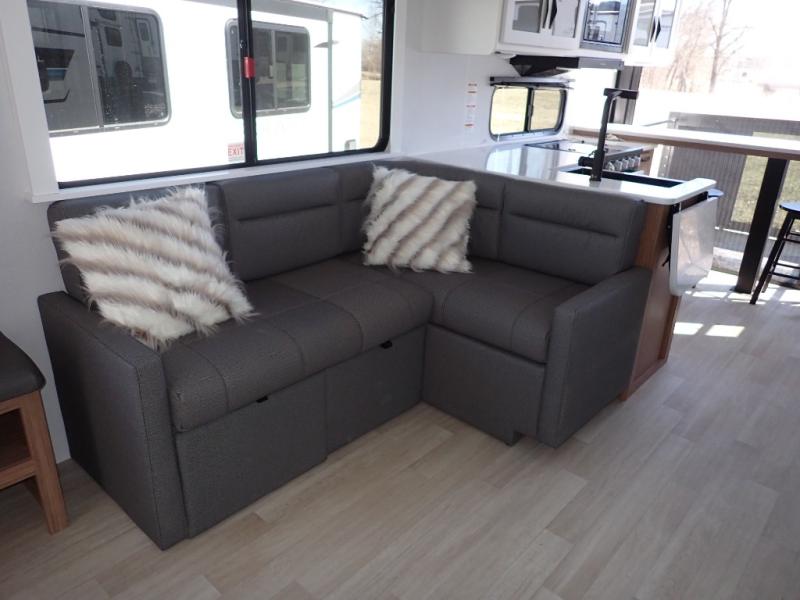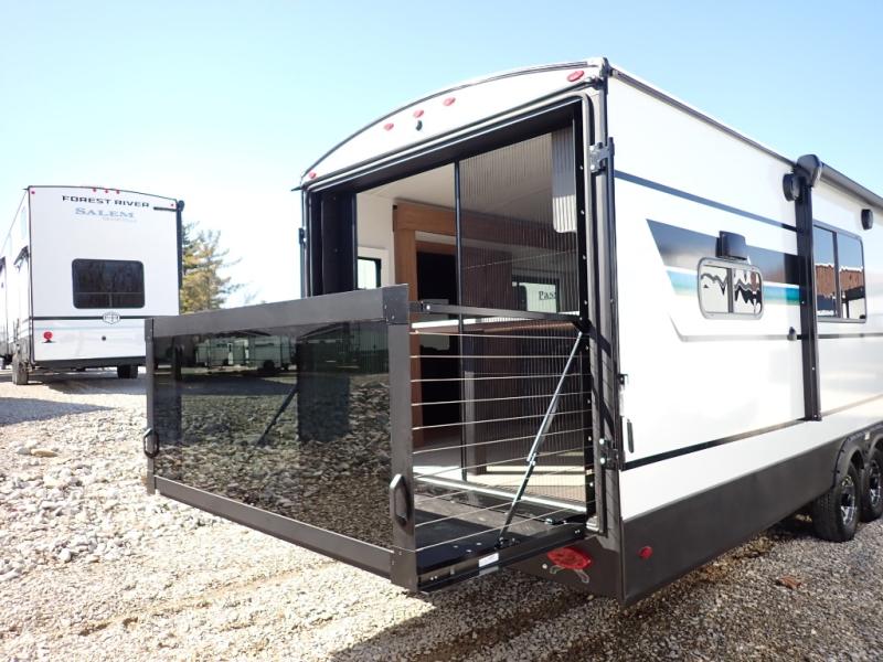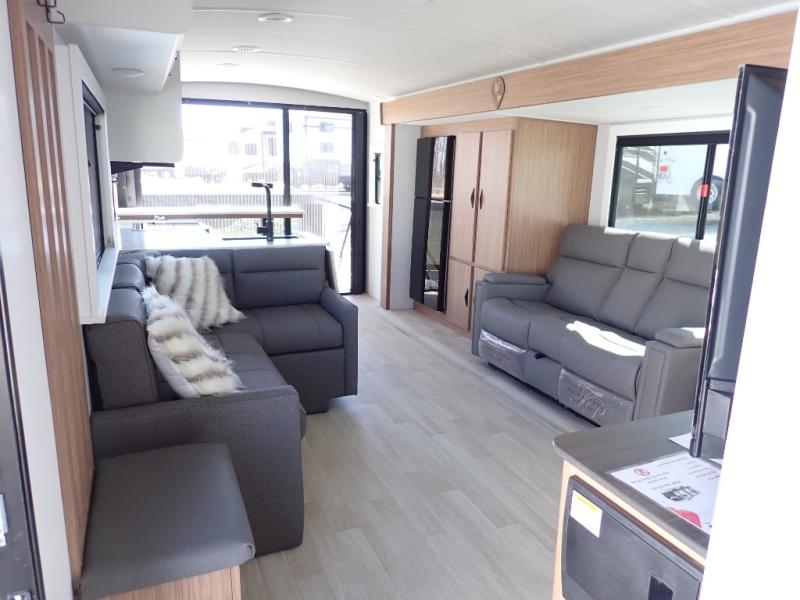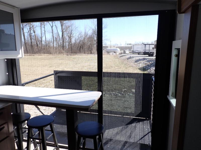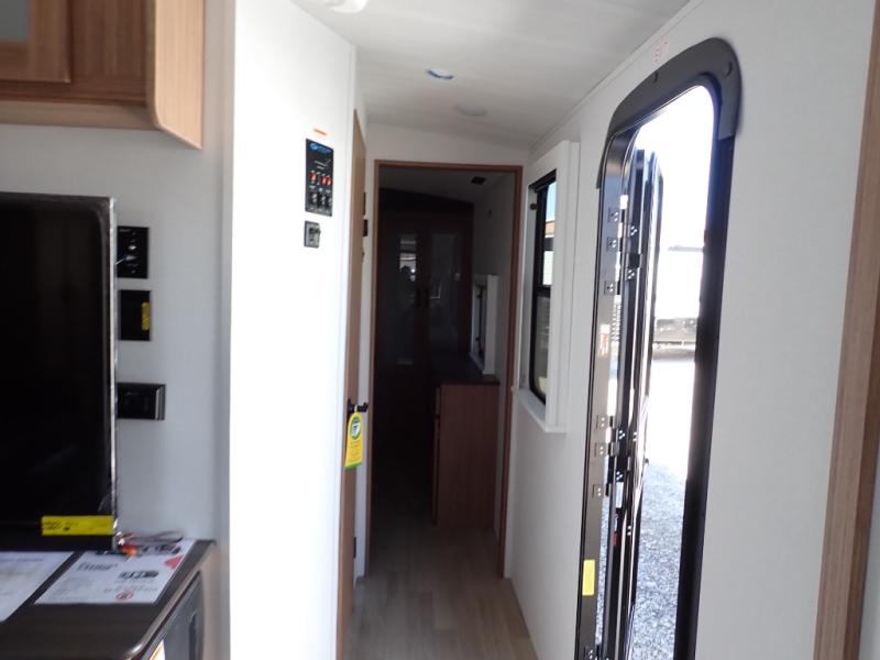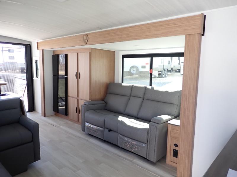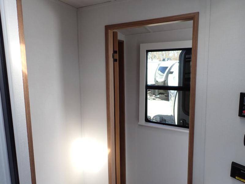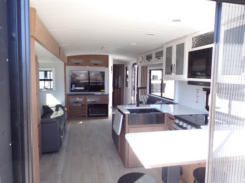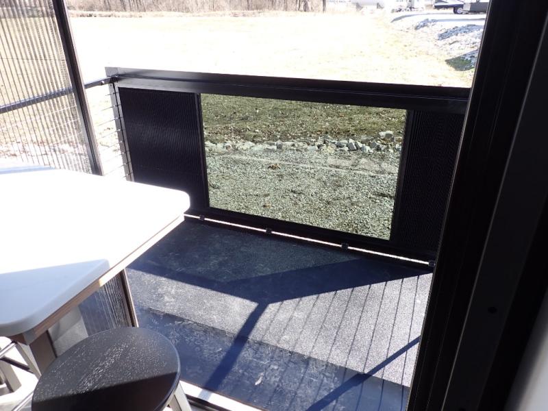 It will be so easy to enjoy trips in this double slide out travel trailer! Once you arrive at your campsite, you can set up the 21' awning, unload the pass-thru storage, then relax on the rear balcony! Head inside to make lunch in the U-shaped kitchen area that includes a bar top with stools and a flip-up counter extension for more prep space. The large slide out here houses the theater seating with a flip-up end table, plus the pantry and 12V refrigerator. Across the room is an L-shaped sectional sofa for more seating, along with an entryway bench/storage where you can sit to pull your hiking boots on. A full bath will let you freshen up each day, and the front private bedroom will give you your own space at night. There is a king bed slide out, two closets, a dresser with TV prep, plus washer and dryer prep if you want to add those appliances!