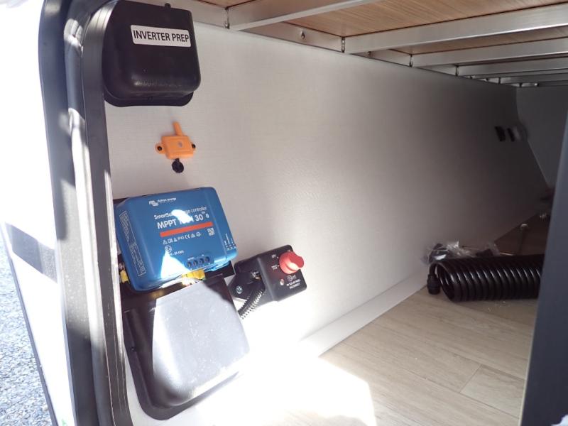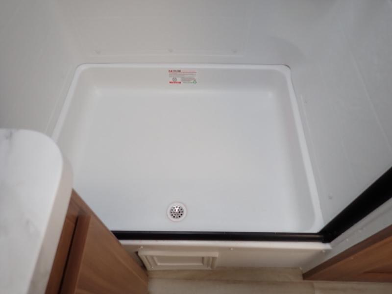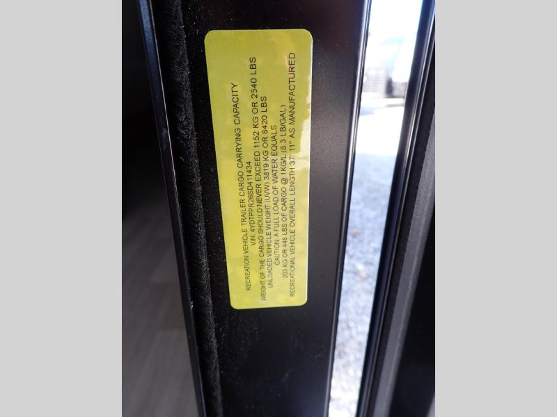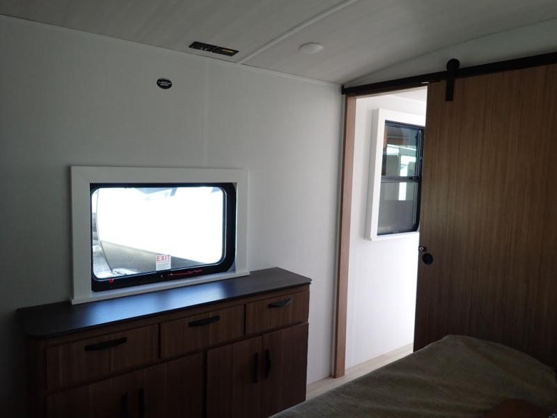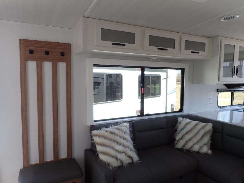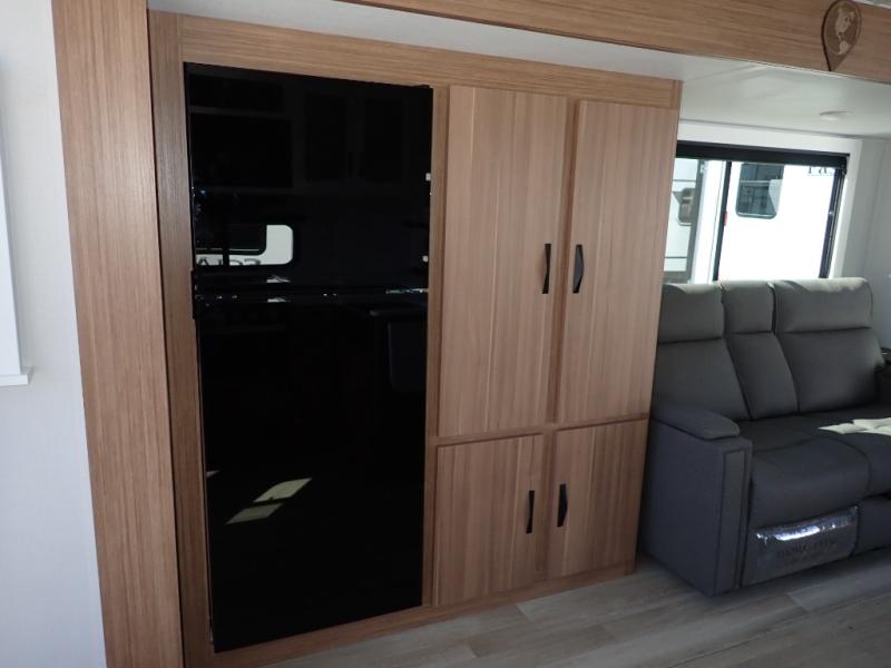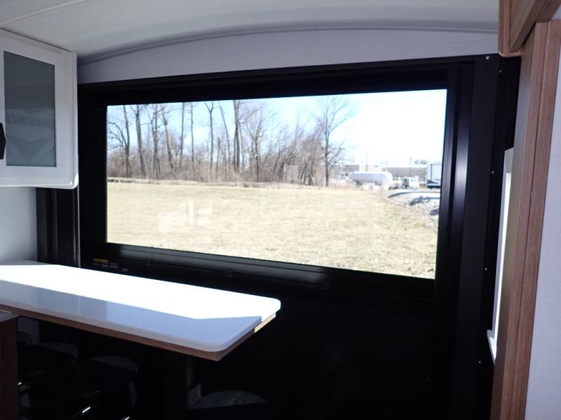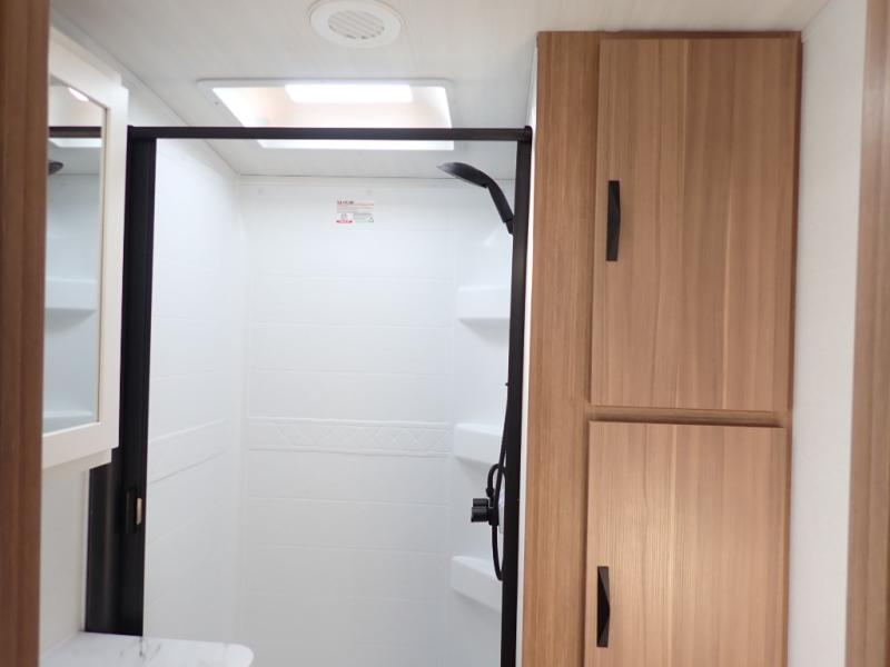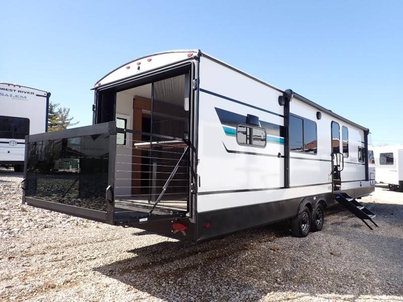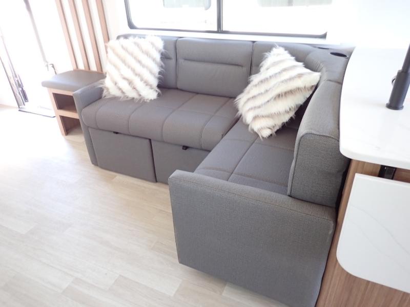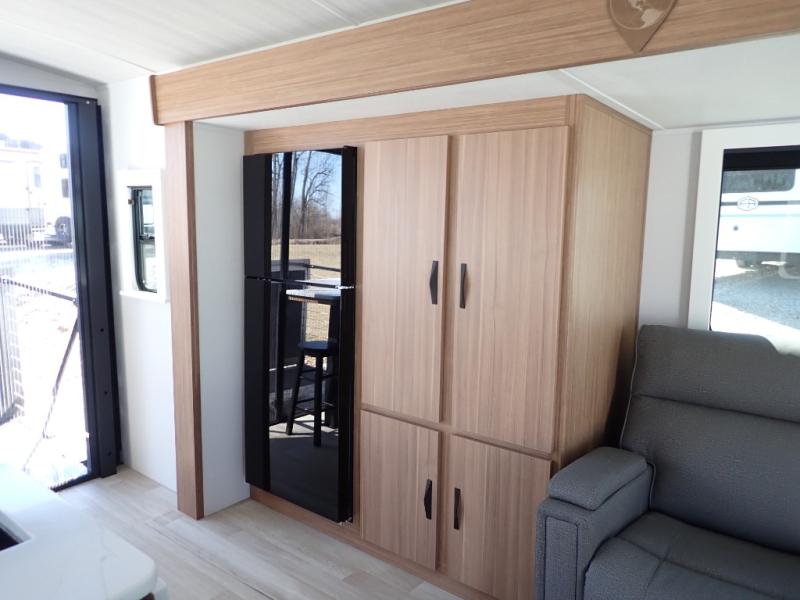 It will be so easy to enjoy trips in this double slide out travel trailer! Once you arrive at your campsite, you can set up the 21' awning, unload the pass-thru storage, then relax on the rear balcony! Head inside to make lunch in the U-shaped kitchen area that includes a bar top with stools and a flip-up counter extension for more prep space. The large slide out here houses the theater seating with a flip-up end table, plus the pantry and 12V refrigerator. Across the room is an L-shaped sectional sofa for more seating, along with an entryway bench/storage where you can sit to pull your hiking boots on. A full bath will let you freshen up each day, and the front private bedroom will give you your own space at night. There is a king bed slide out, two closets, a dresser with TV prep, plus washer and dryer prep if you want to add those appliances!