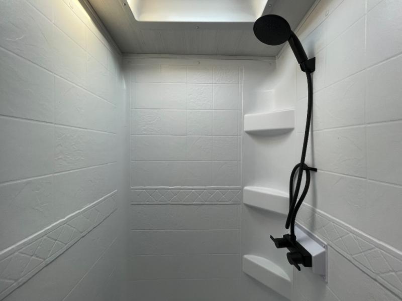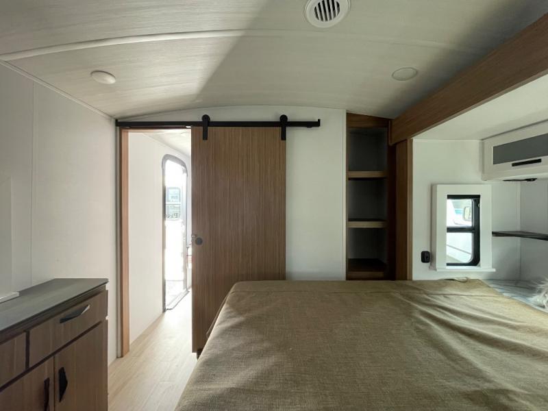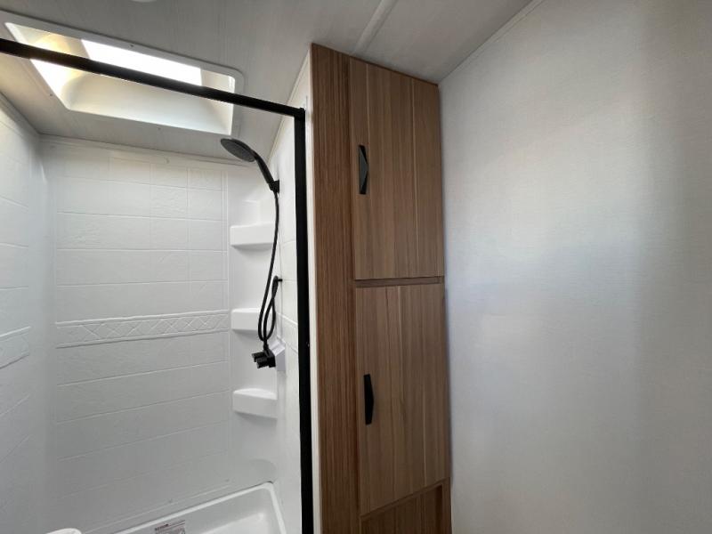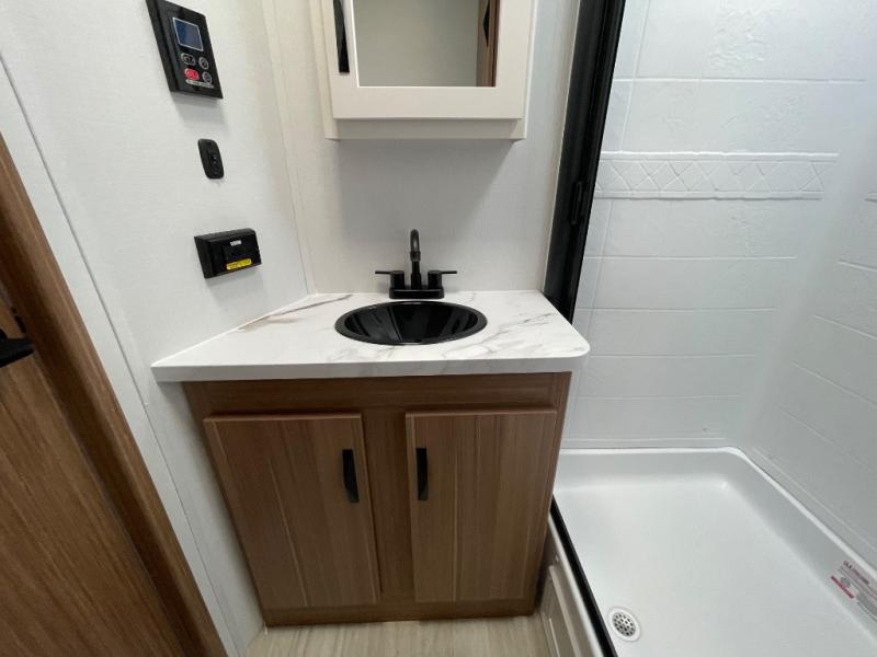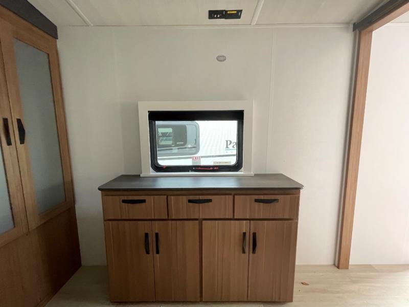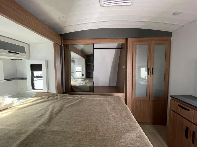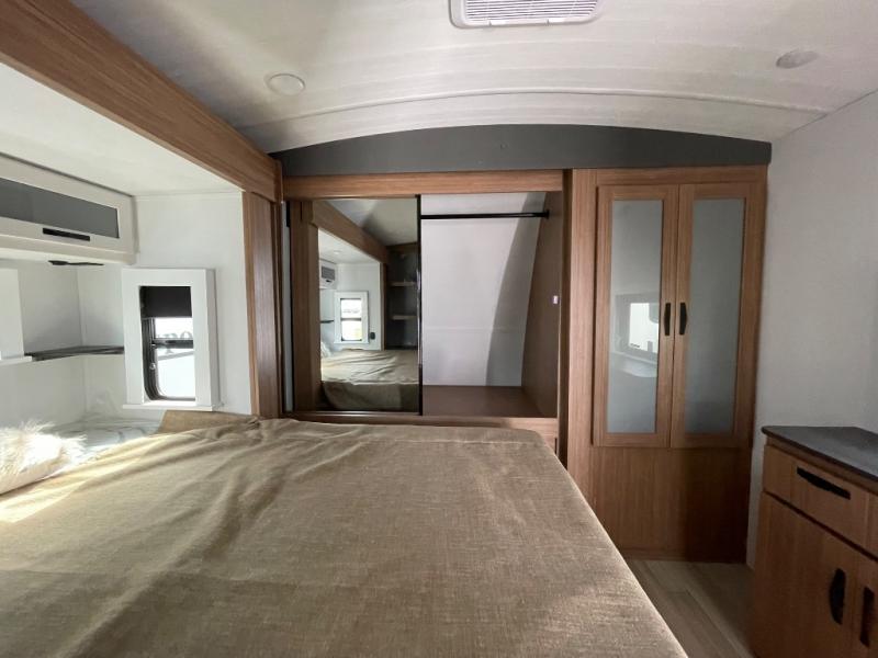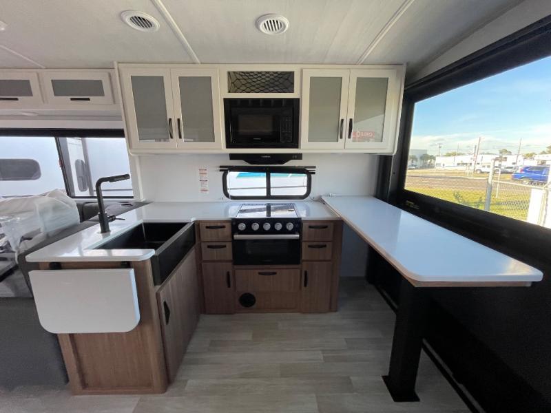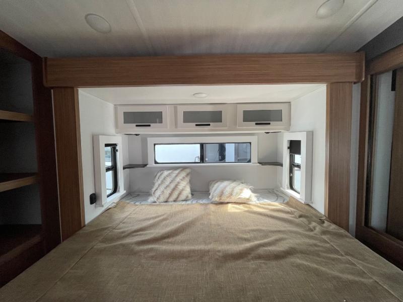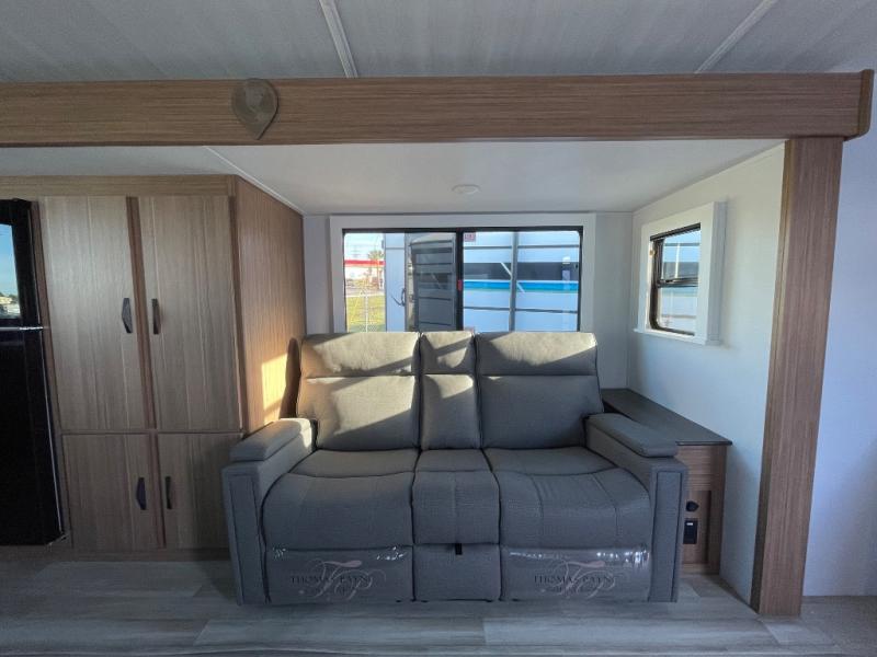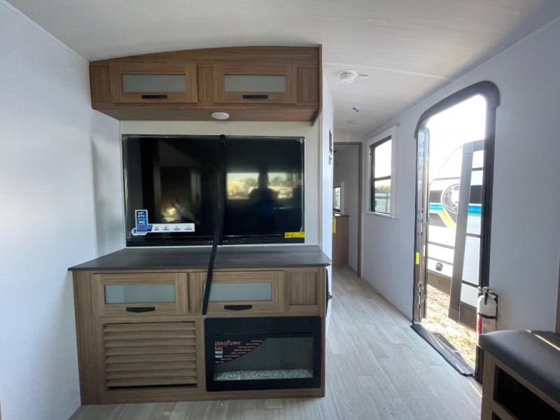 It will be so easy to enjoy trips in this double slide out travel trailer! Once you arrive at your campsite, you can set up the 21' awning, unload the pass-thru storage, then relax on the rear balcony! Head inside to make lunch in the U-shaped kitchen area that includes a bar top with stools and a flip-up counter extension for more prep space. The large slide out here houses the theater seating with a flip-up end table, plus the pantry and 12V refrigerator. Across the room is an L-shaped sectional sofa for more seating, along with an entryway bench/storage where you can sit to pull your hiking boots on. A full bath will let you freshen up each day, and the front private bedroom will give you your own space at night. There is a king bed slide out, two closets, a dresser with TV prep, plus washer and dryer prep if you want to add those appliances!