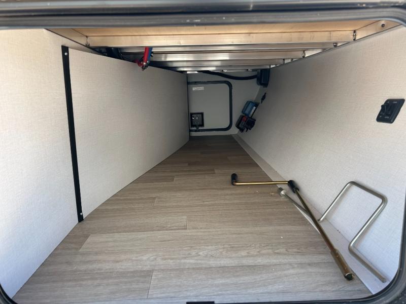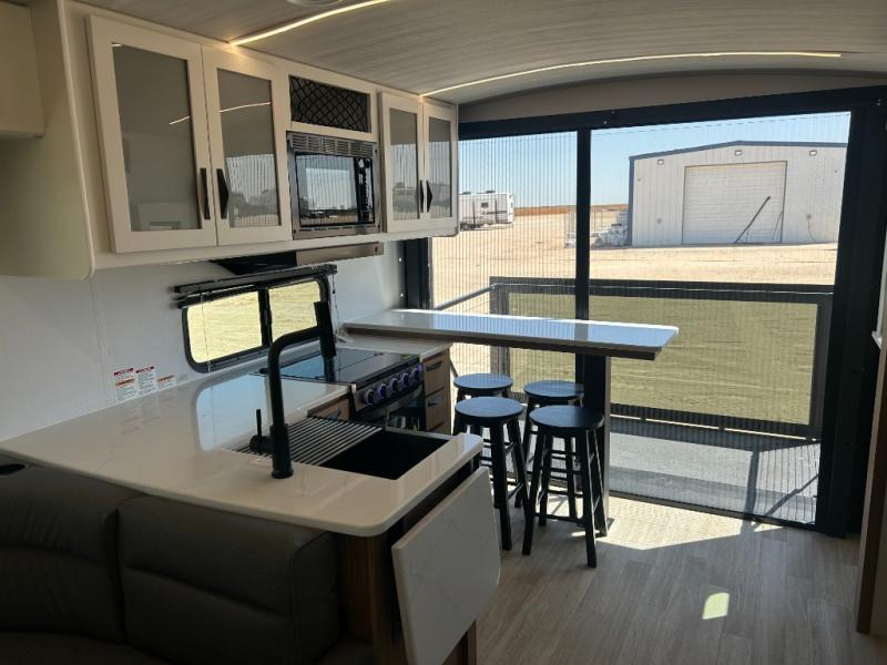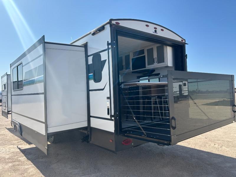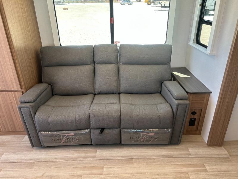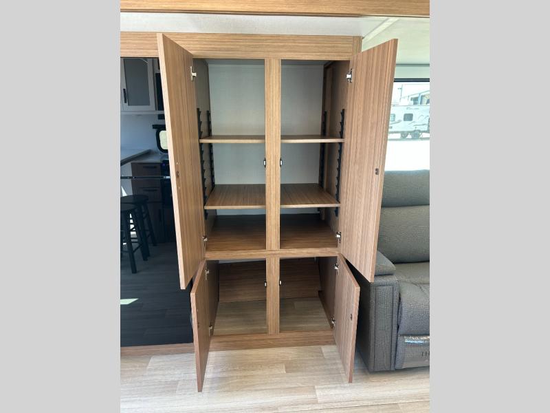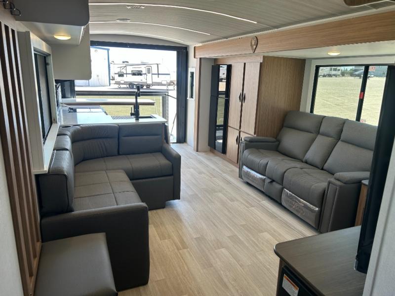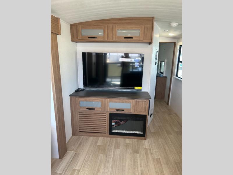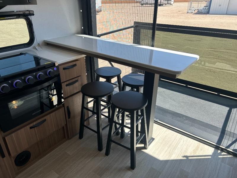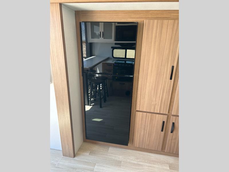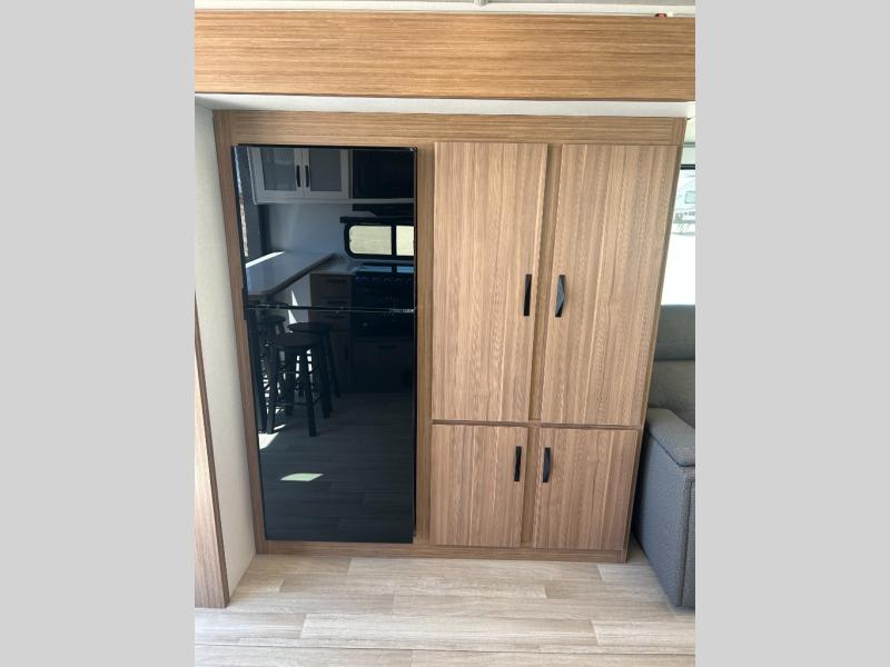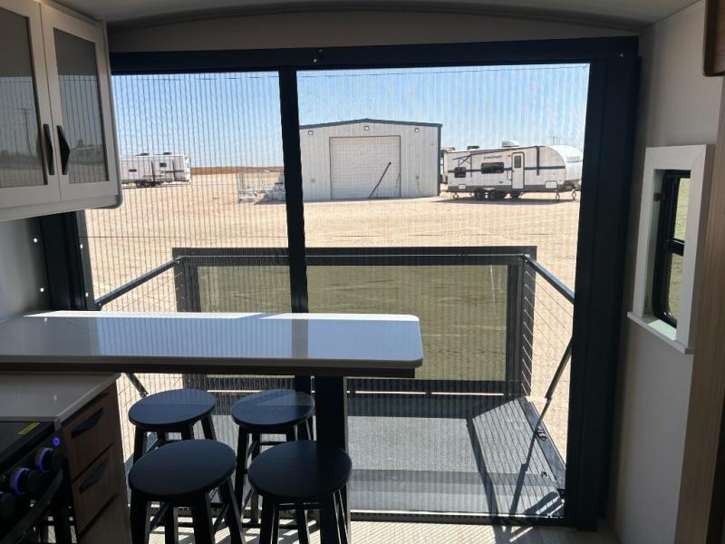 It will be so easy to enjoy trips in this double slide out travel trailer! Once you arrive at your campsite, you can set up the 21' awning, unload the pass-thru storage, then relax on the rear balcony! Head inside to make lunch in the U-shaped kitchen area that includes a bar top with stools and a flip-up counter extension for more prep space. The large slide out here houses the theater seating with a flip-up end table, plus the pantry and 12V refrigerator. Across the room is an L-shaped sectional sofa for more seating, along with an entryway bench/storage where you can sit to pull your hiking boots on. A full bath will let you freshen up each day, and the front private bedroom will give you your own space at night. There is a king bed slide out, two closets, a dresser with TV prep, plus washer and dryer prep if you want to add those appliances!