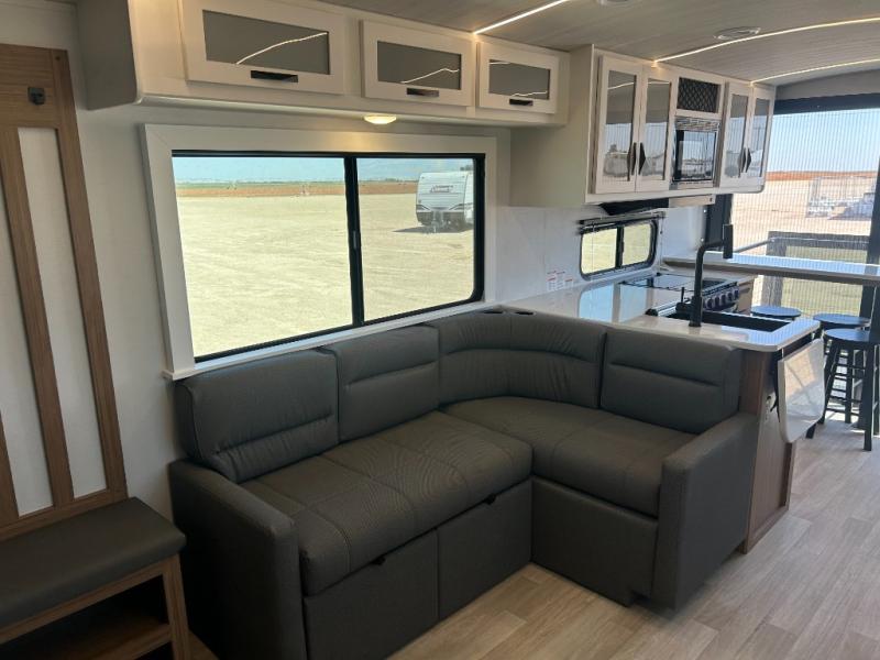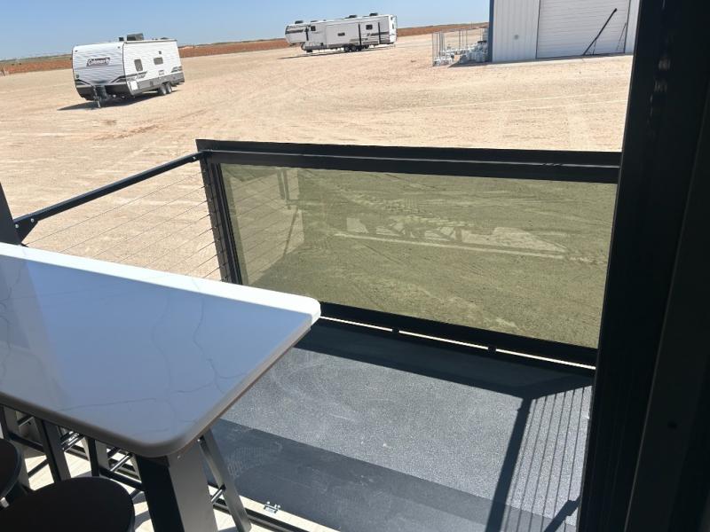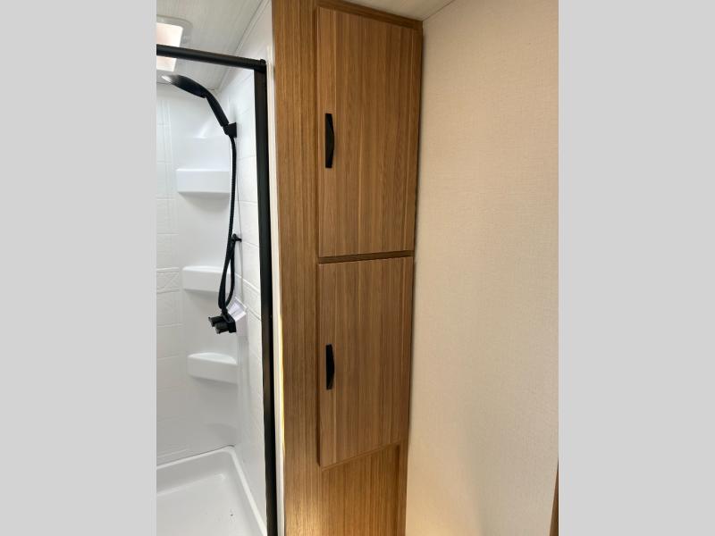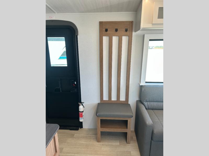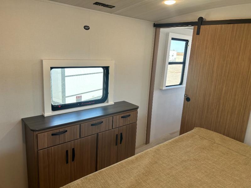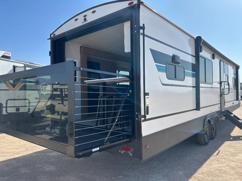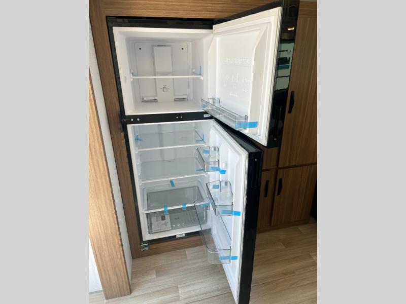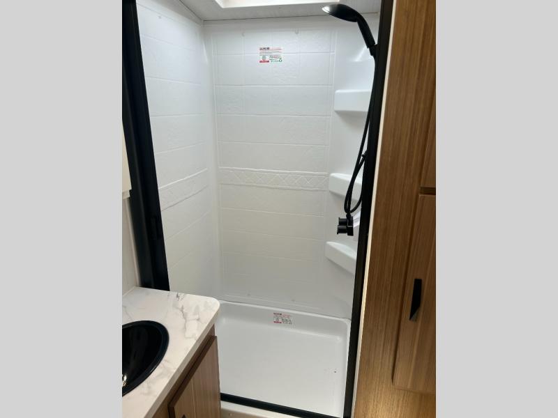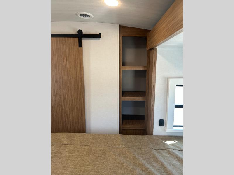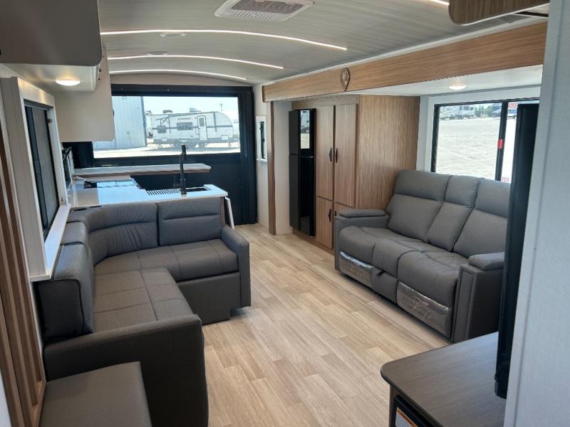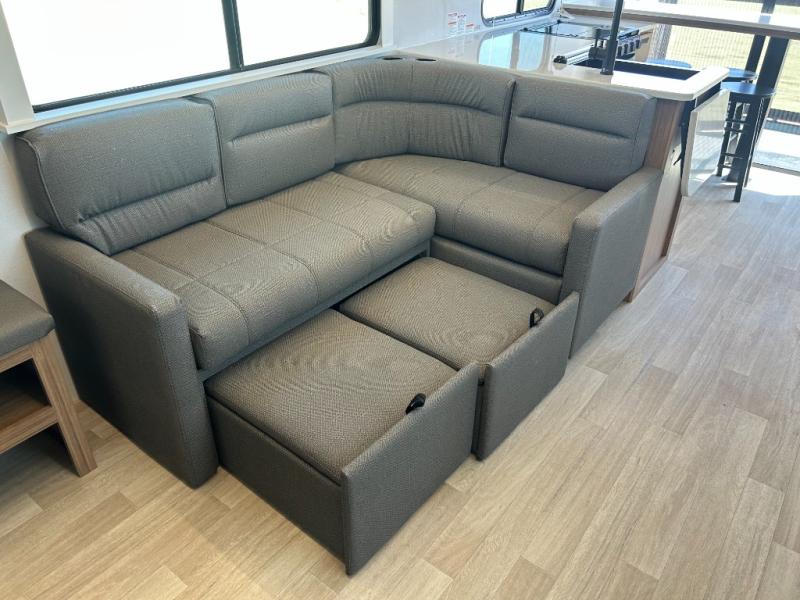 It will be so easy to enjoy trips in this double slide out travel trailer! Once you arrive at your campsite, you can set up the 21' awning, unload the pass-thru storage, then relax on the rear balcony! Head inside to make lunch in the U-shaped kitchen area that includes a bar top with stools and a flip-up counter extension for more prep space. The large slide out here houses the theater seating with a flip-up end table, plus the pantry and 12V refrigerator. Across the room is an L-shaped sectional sofa for more seating, along with an entryway bench/storage where you can sit to pull your hiking boots on. A full bath will let you freshen up each day, and the front private bedroom will give you your own space at night. There is a king bed slide out, two closets, a dresser with TV prep, plus washer and dryer prep if you want to add those appliances!