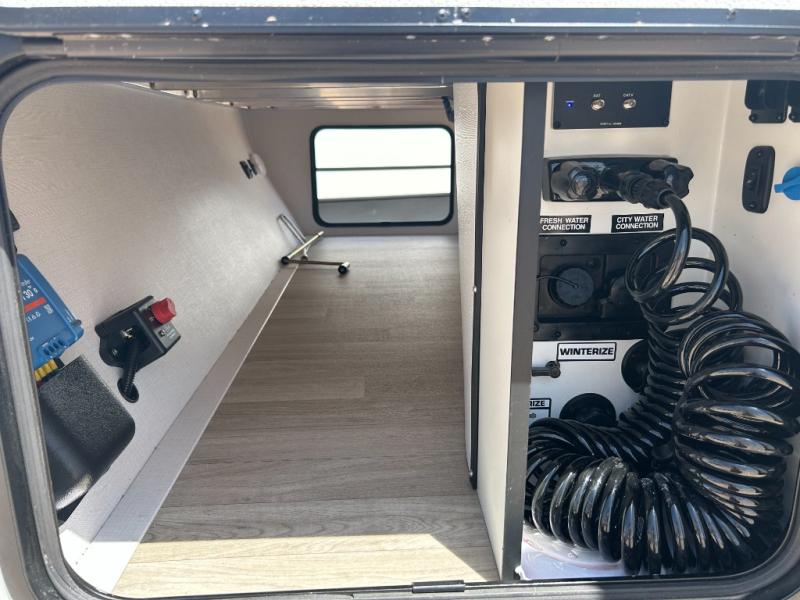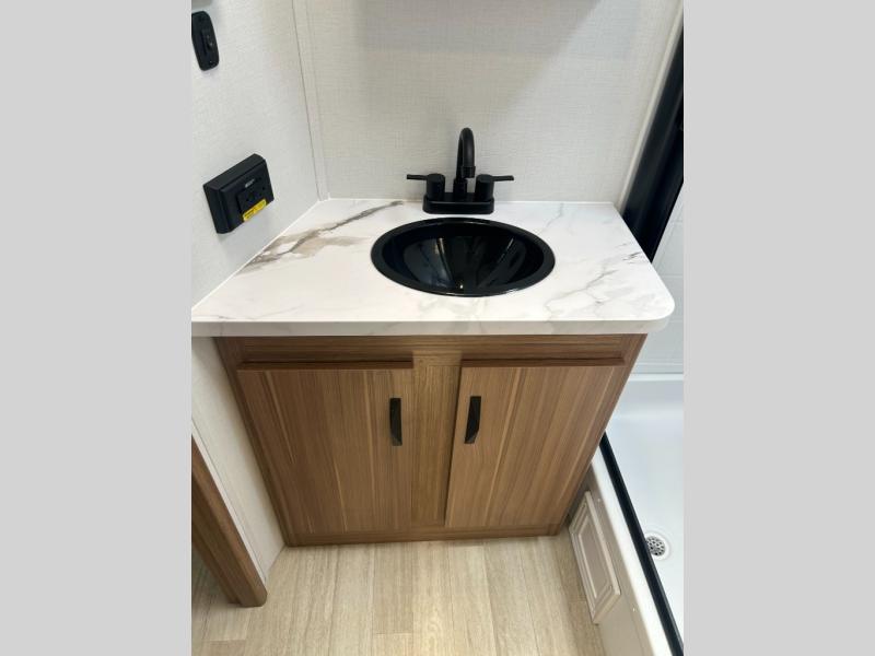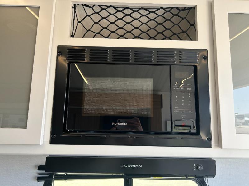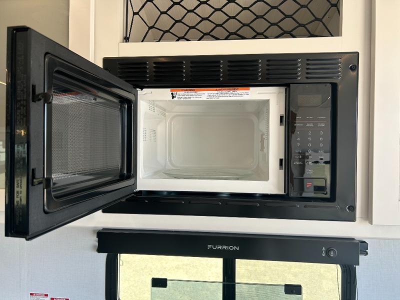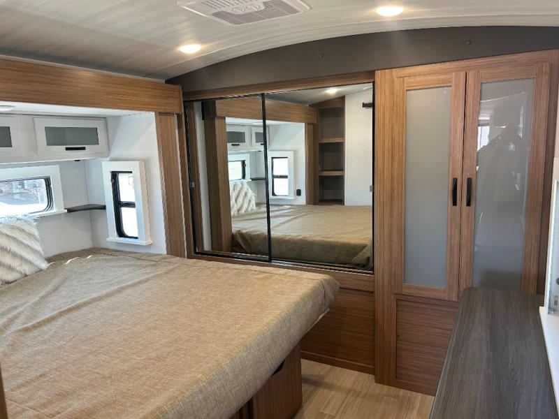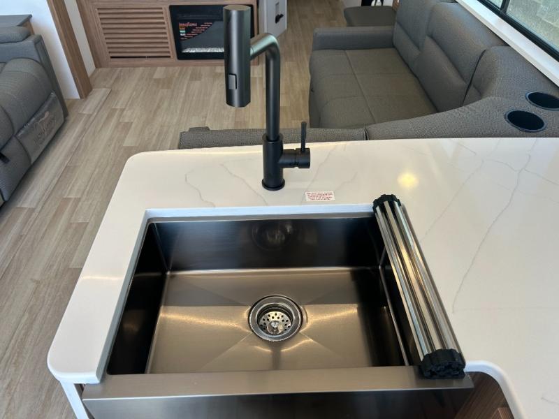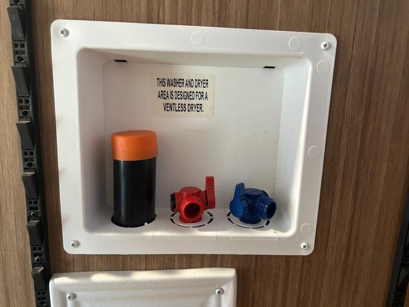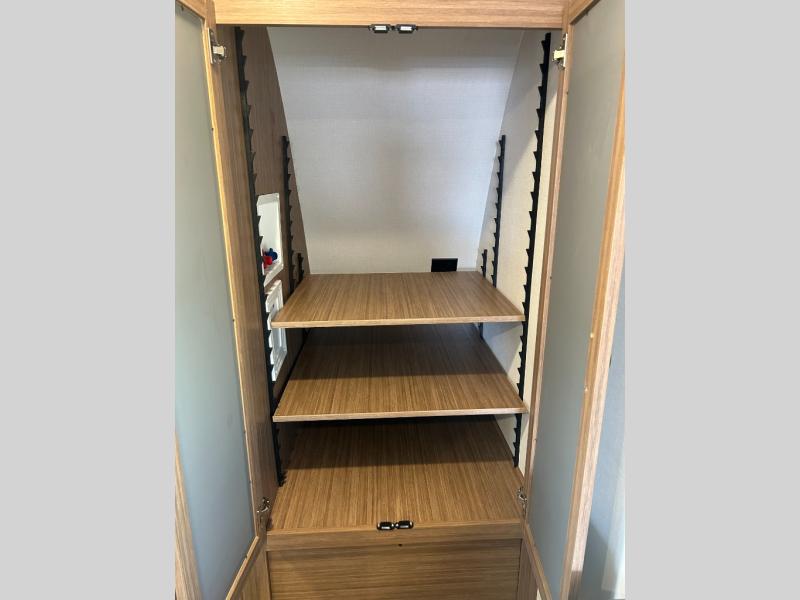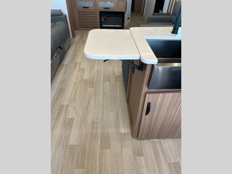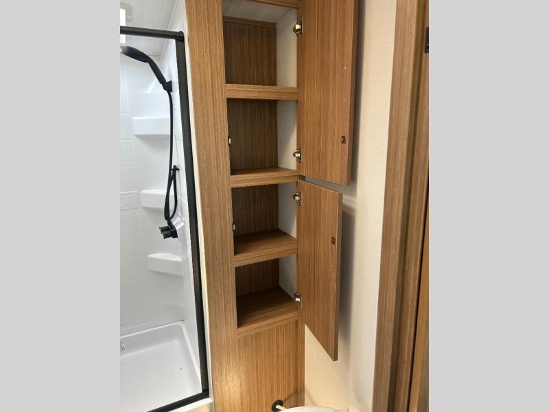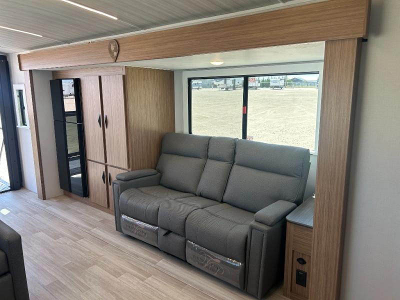It will be so easy to enjoy trips in this double slide out travel trailer! Once you arrive at your campsite, you can set up the 21' awning, unload the pass-thru storage, then relax on the rear balcony! Head inside to make lunch in the U-shaped kitchen area that includes a bar top with stools and a flip-up counter extension for more prep space. The large slide out here houses the theater seating with a flip-up end table, plus the pantry and 12V refrigerator. Across the room is an L-shaped sectional sofa for more seating, along with an entryway bench/storage where you can sit to pull your hiking boots on. A full bath will let you freshen up each day, and the front private bedroom will give you your own space at night. There is a king bed slide out, two closets, a dresser with TV prep, plus washer and dryer prep if you want to add those appliances!