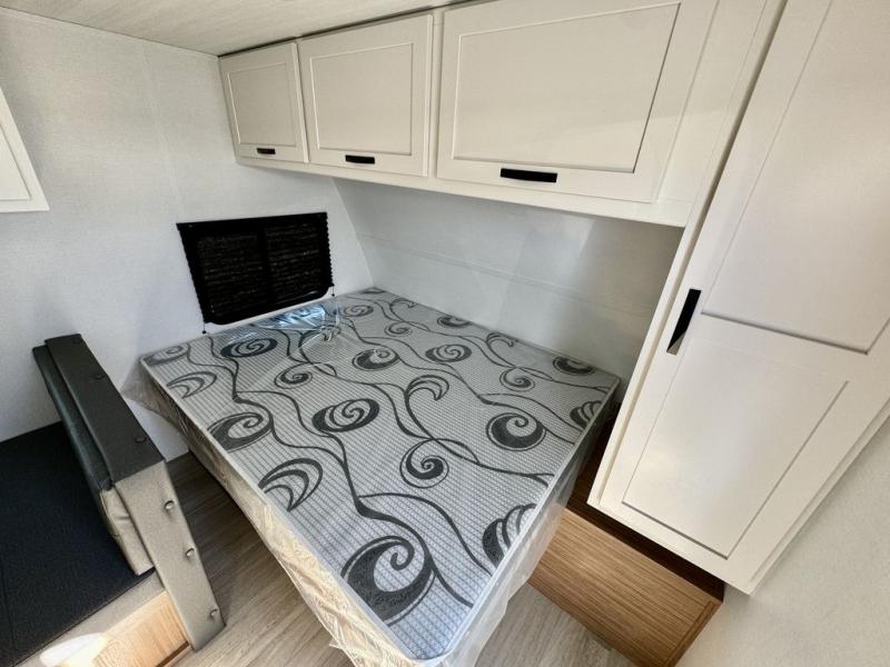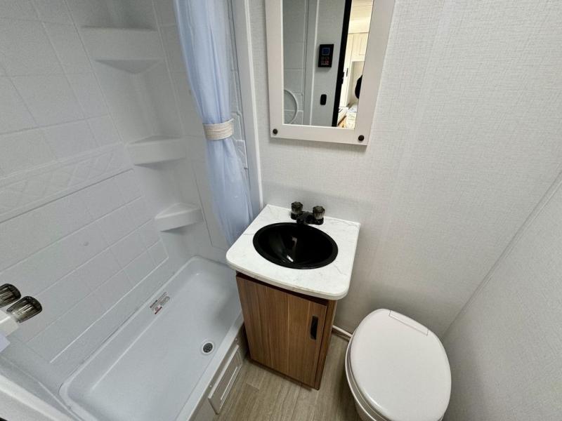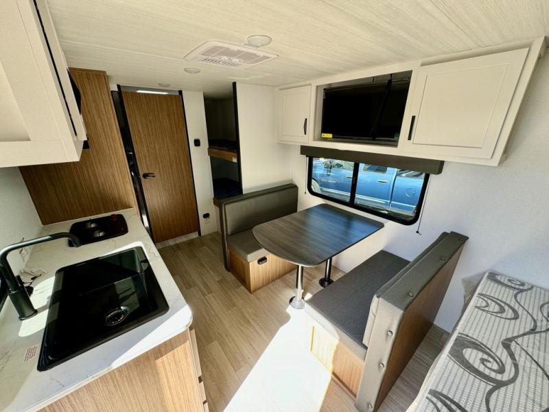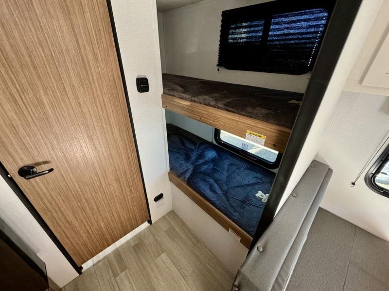 If you're looking for a single axle bunkhouse model, this is the one! The full bath is close by the 28" x 74" bunks for easy nighttime use, and there is also a front queen bed so no one has to sleep on an air mattress. You can make breakfast on the two burner cooktop or in the microwave oven each morning, and the milk can go back in the 12V refrigerator when you're done. A booth dinette provides a place to dine together, or you can sit outdoors under the 11' awning!