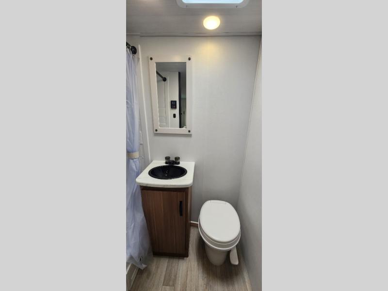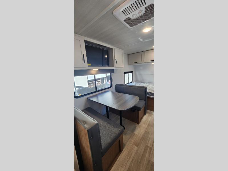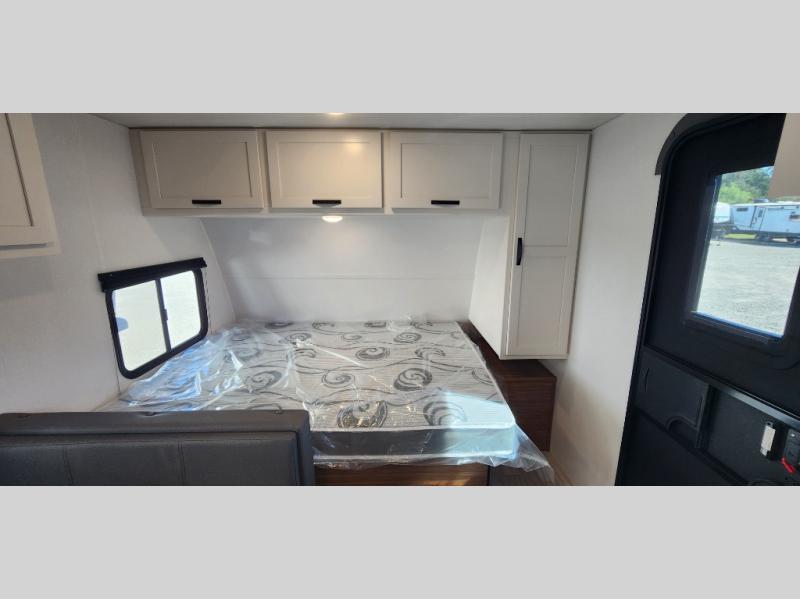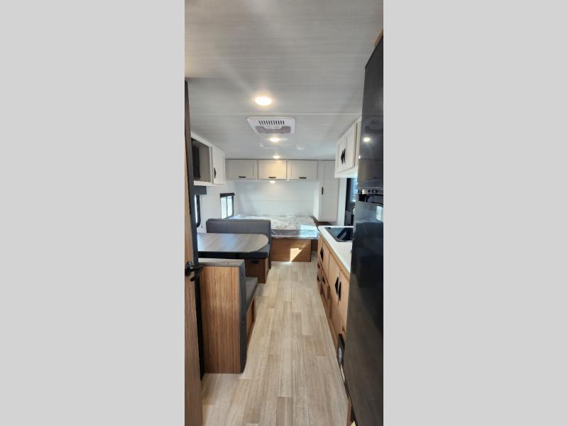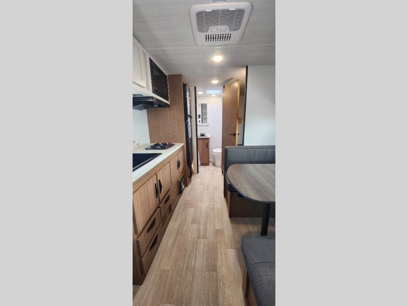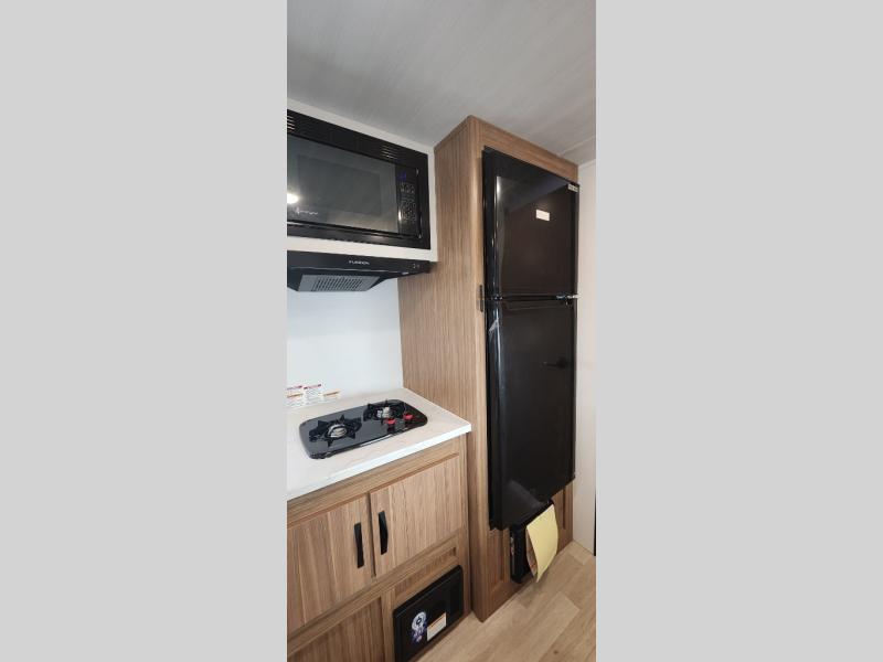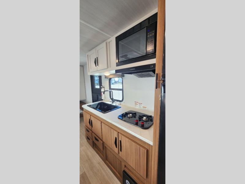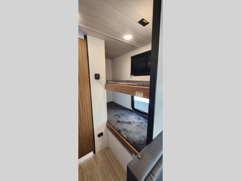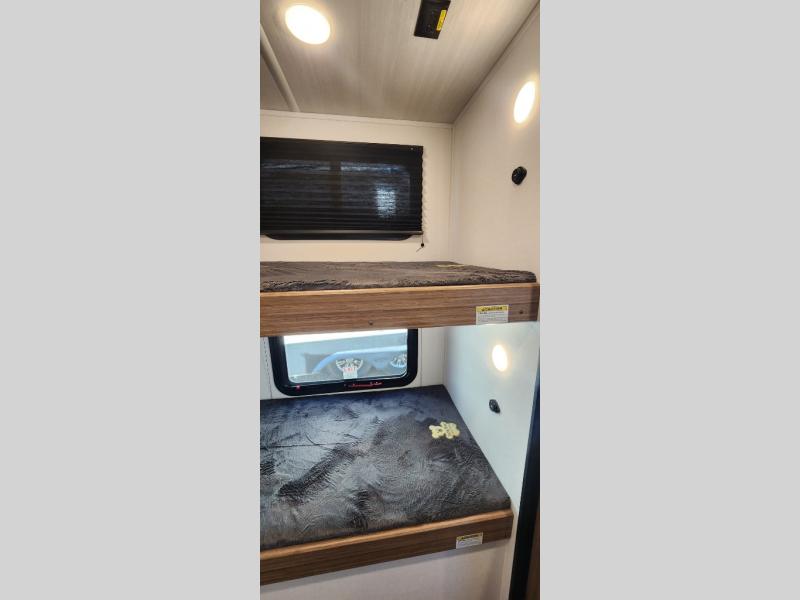 If you're looking for a single axle bunkhouse model, this is the one! The full bath is close by the 28" x 74" bunks for easy nighttime use, and there is also a front queen bed so no one has to sleep on an air mattress. You can make breakfast on the two burner cooktop or in the microwave oven each morning, and the milk can go back in the 12V refrigerator when you're done. A booth dinette provides a place to dine together, or you can sit outdoors under the 11' awning!