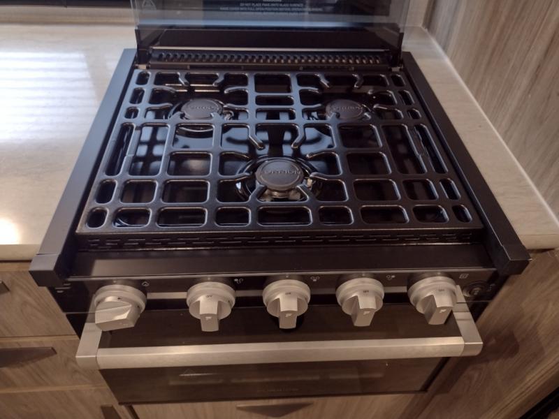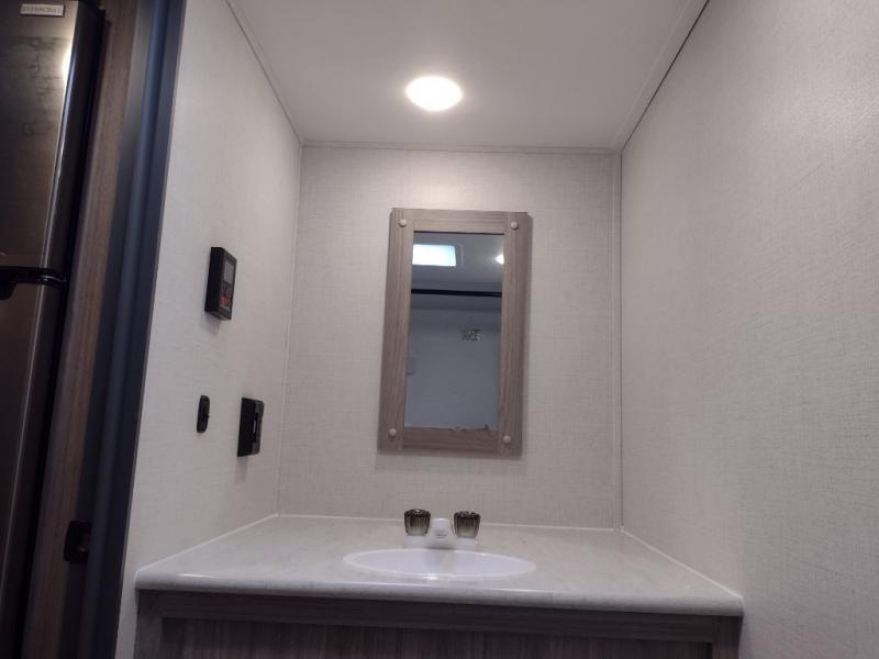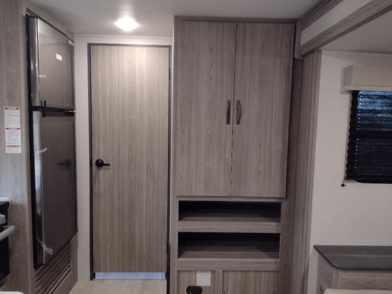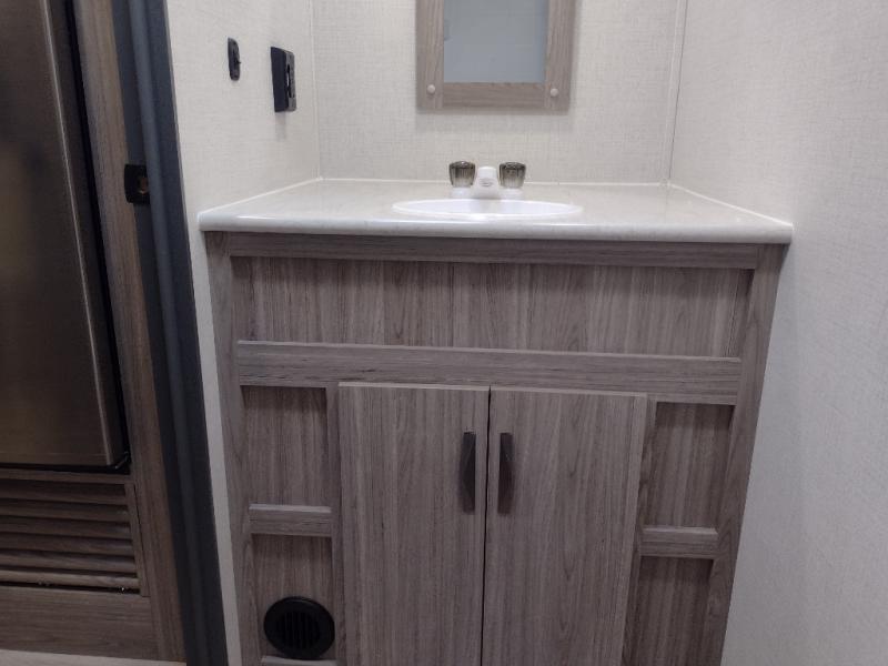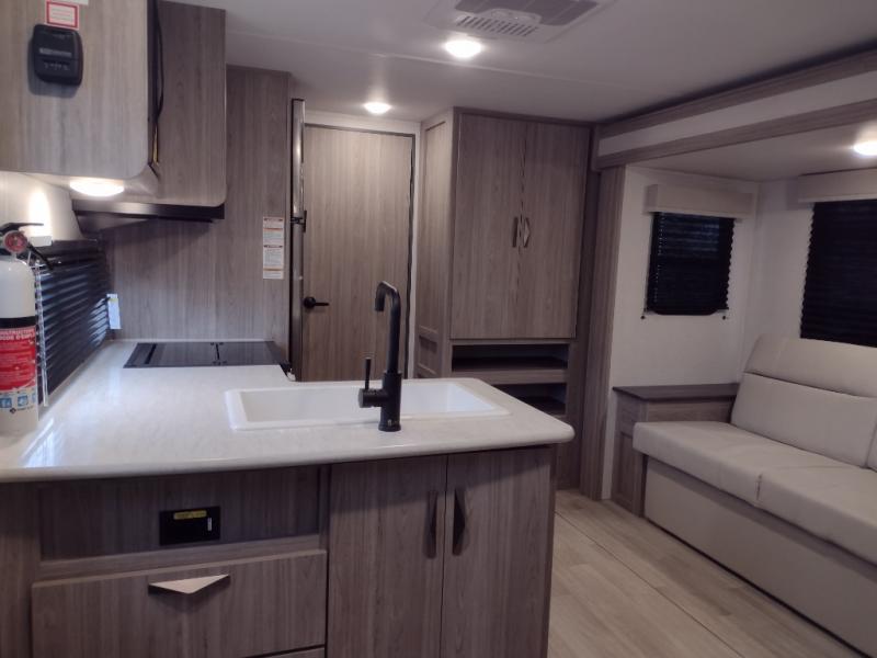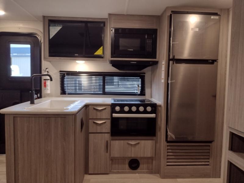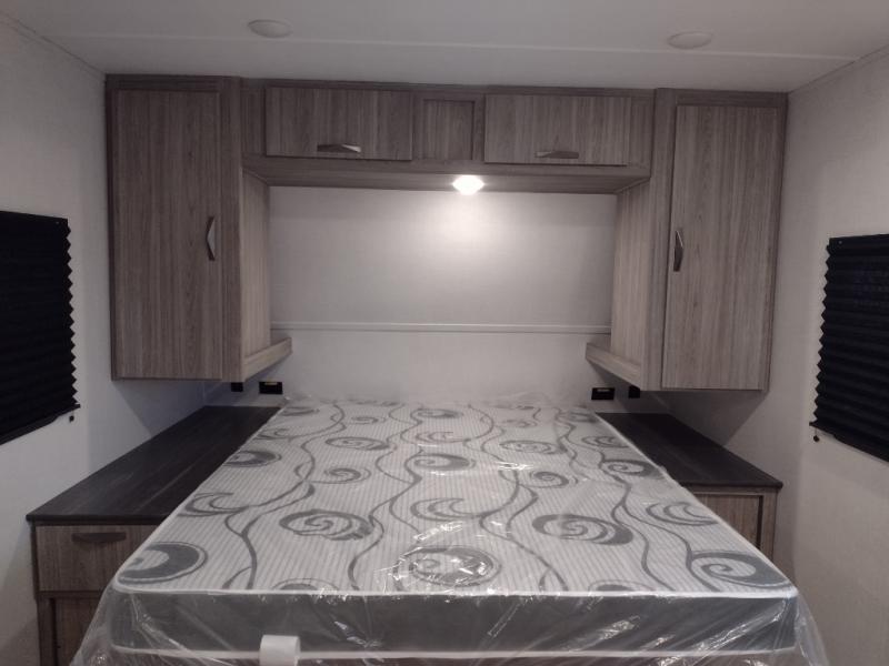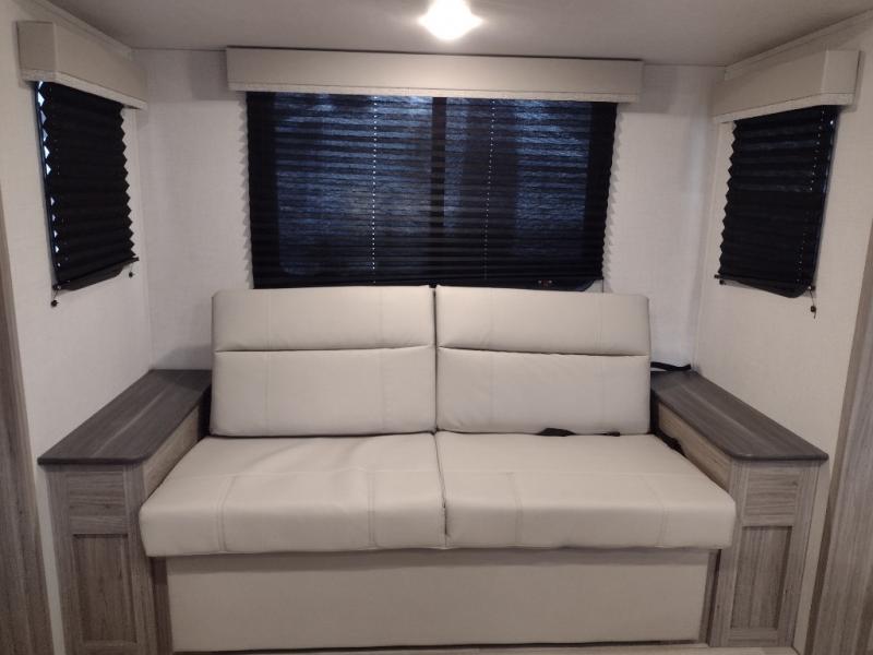 This is the perfect couple's trailer for weekend trips to the campground. You can set up the patio awning when you arrive, then unload the pass-thru storage before heading out on a trail. The full rear bath inside will let you freshen up when you get back, and there is a jack knife sofa slide where you can relax in the air conditioning. A two burner range and microwave oven lets you make dinner when you're hungry, and a large double door 12V refrigerator will be perfect to keep food fresh. This unit also includes a front queen bed with dual wardrobes and nightstands plus a privacy curtain if you have someone staying over on the sofa!