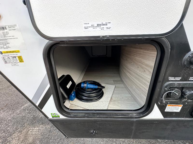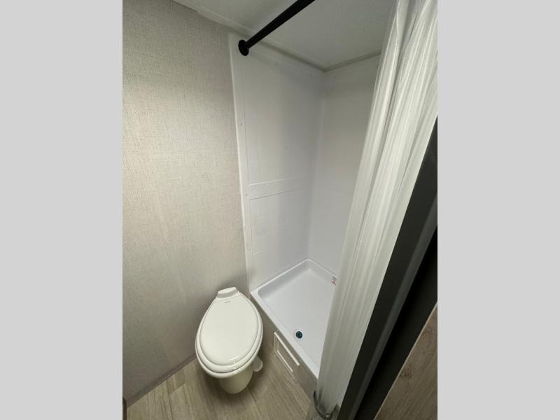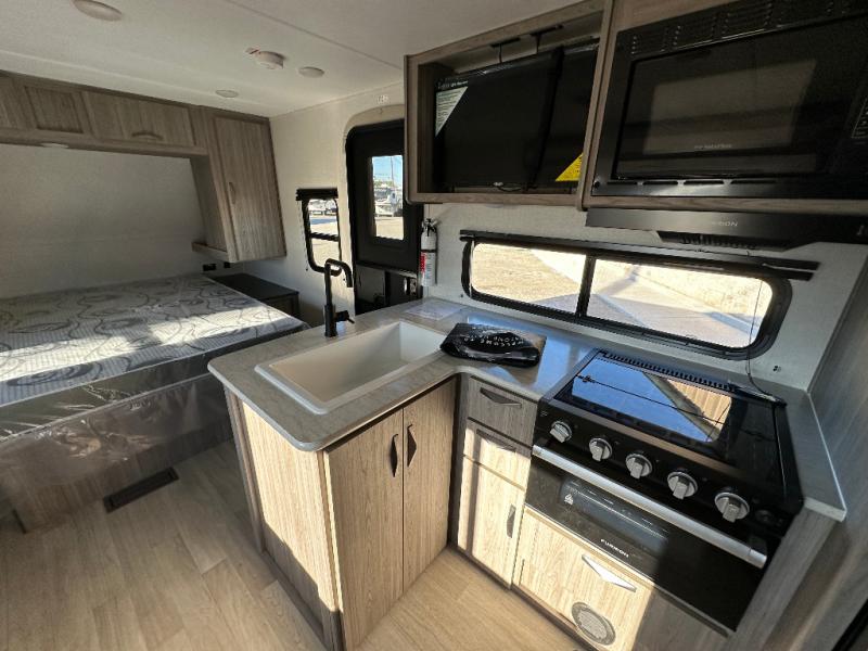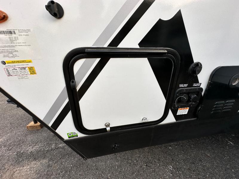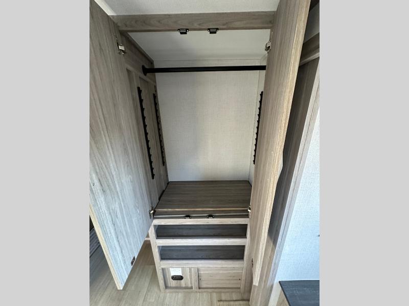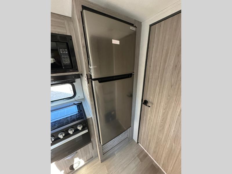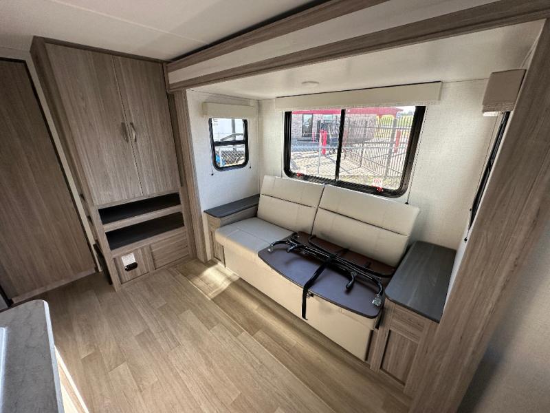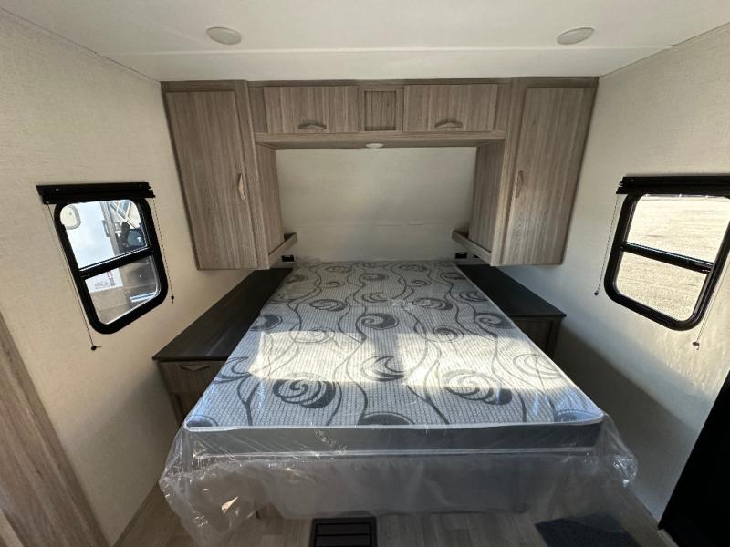 This is the perfect couple's trailer for weekend trips to the campground. You can set up the patio awning when you arrive, then unload the pass-thru storage before heading out on a trail. The full rear bath inside will let you freshen up when you get back, and there is a jack knife sofa slide where you can relax in the air conditioning. A two burner range and microwave oven lets you make dinner when you're hungry, and a large double door 12V refrigerator will be perfect to keep food fresh. This unit also includes a front queen bed with dual wardrobes and nightstands plus a privacy curtain if you have someone staying over on the sofa!